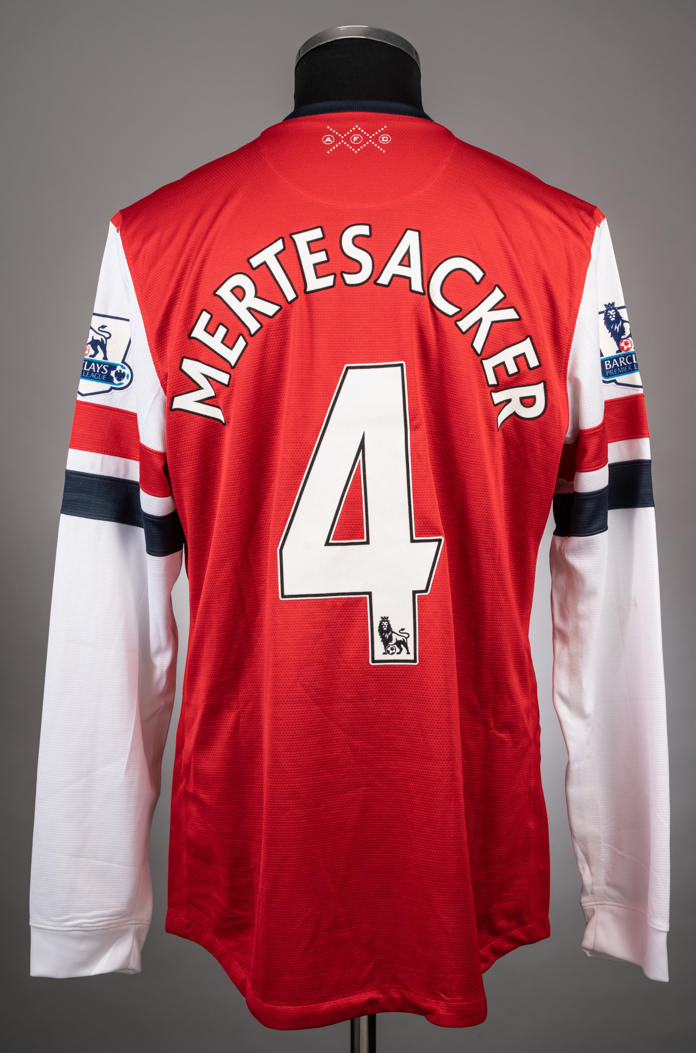 Per Mertesacker red Arsenal no.4 jersey 2012-13 season from the game v Fulham that took place on 10/11/12 at the Emirates stadium, Player issue Nike long sleeved example with Barclays Premier League badges. The front has the club badge and the Fly Emirates sponsor logo. It also has the "Arsenal Remembers" poppy logo that features the details of the game. It is XL in size. There is some evidence of match wear on the right sleeve and it is in excellent condition The game ended in a 3-3 draw with Mertersacker playing the whole 90 minutes