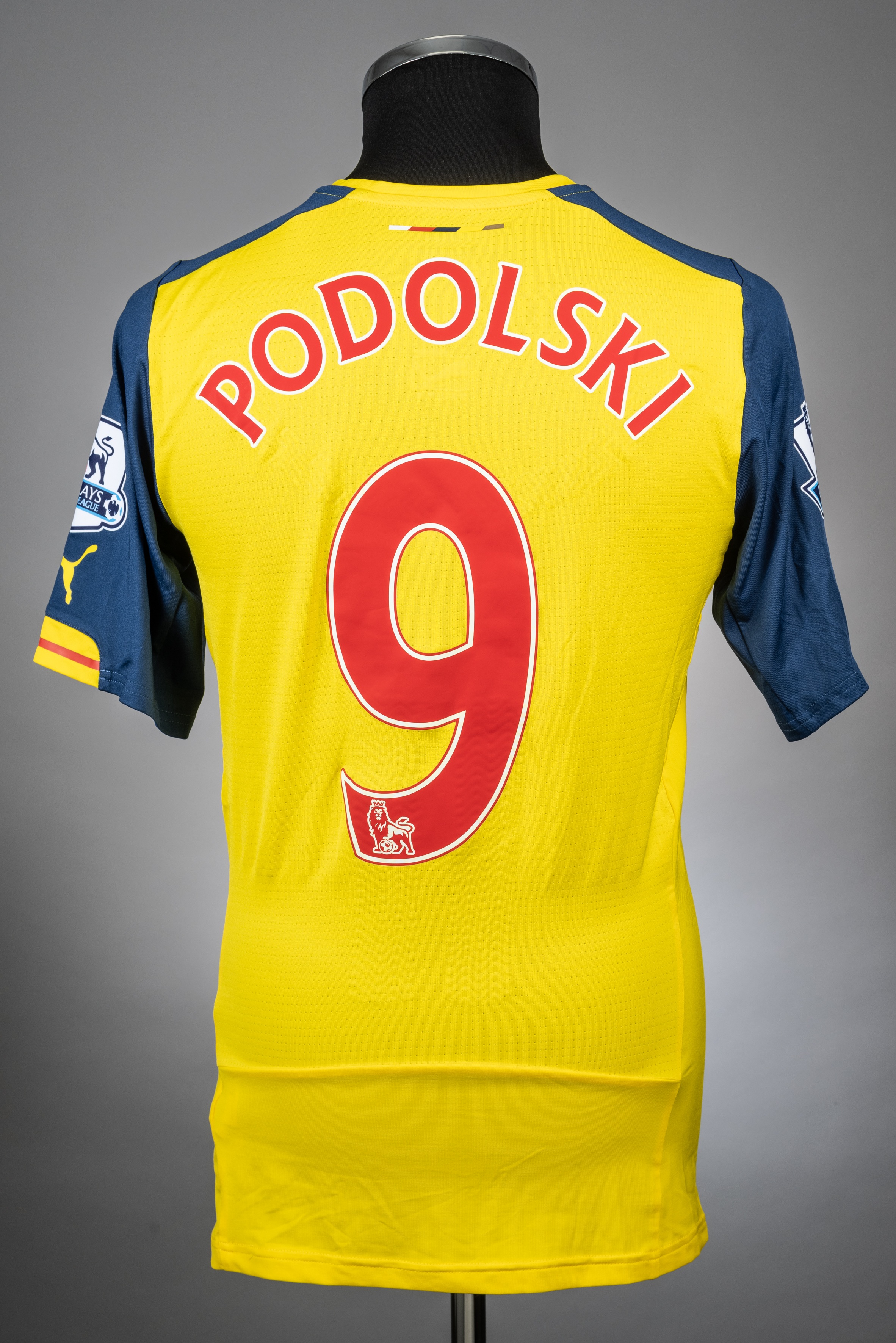 Lukas Podolski yellow no.9 Arsenal away jersey season 2014-15 from the game v Aston Villa that took place on 20/9/14 at Villa Park, Player issued s