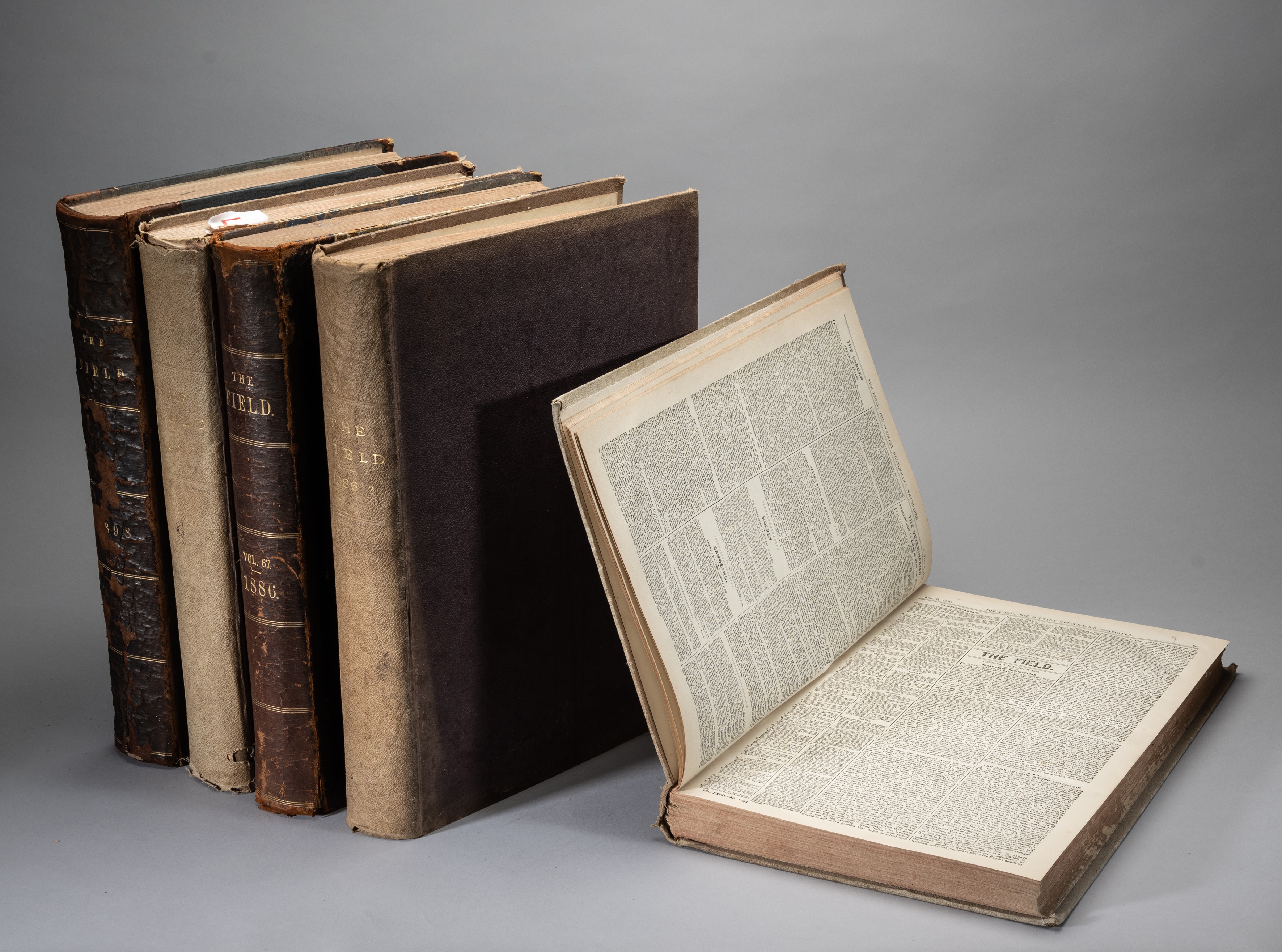 Five bound volumes of "The Field, The Country Gentleman's Newspaper", with varied sporting content, for: 1886, two 1/2 year volumes and with a duplicate of vol 1 in a different binding; 1887, a full year volume; and 1898, a full year volume, (5) Bindings overall in fair/poor condition, internally good