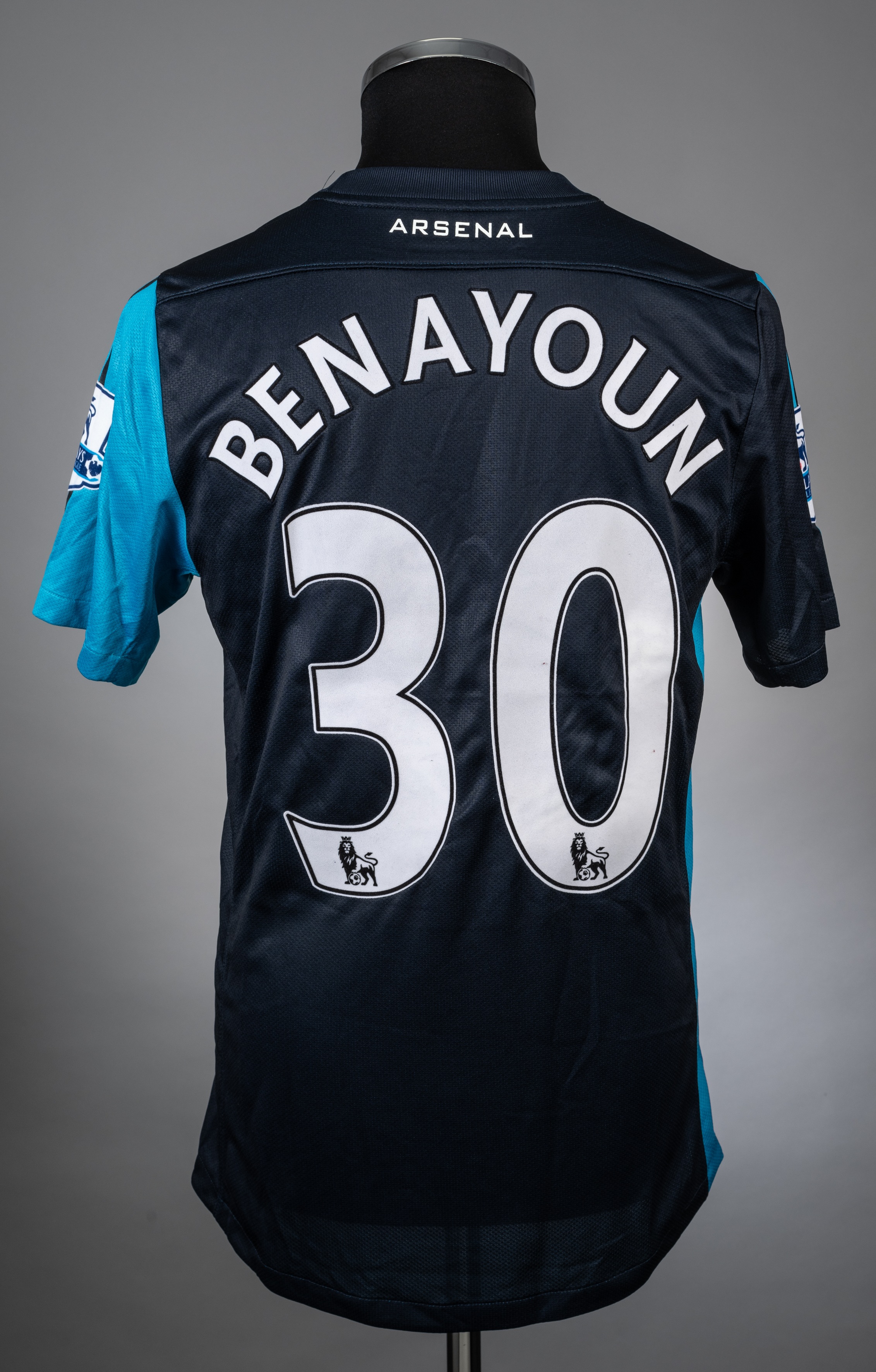 Yossi Benayoun black/blue Arsenal no.30 away jersey season 2011-12, Player issued short sleeved NIKE example with Barclays Premier League badges on both arms. The front has the Arsenal- 1886-2011 FORWARD Club crest and the FLY EMIRATES sponsor logo in white. The NIKE manufacturer trademark is also present. he back is lettered BENAYOUN and bears the squad no.30. Both are in white. The item shows no visible signs of match wear and is in excellent condition. Arsenal finished in third place in the Premier League in the 2011/12 season Premier League campaign.