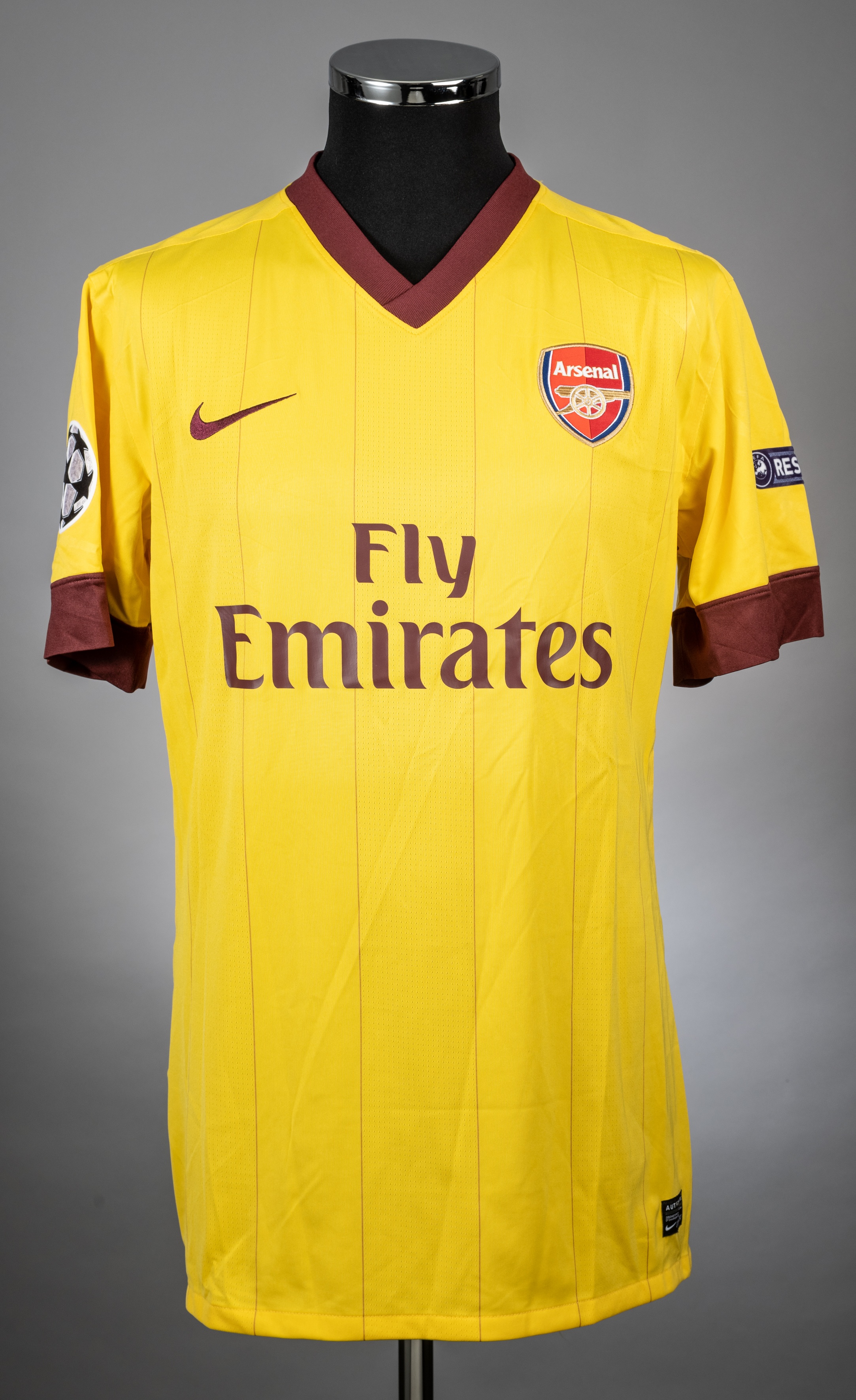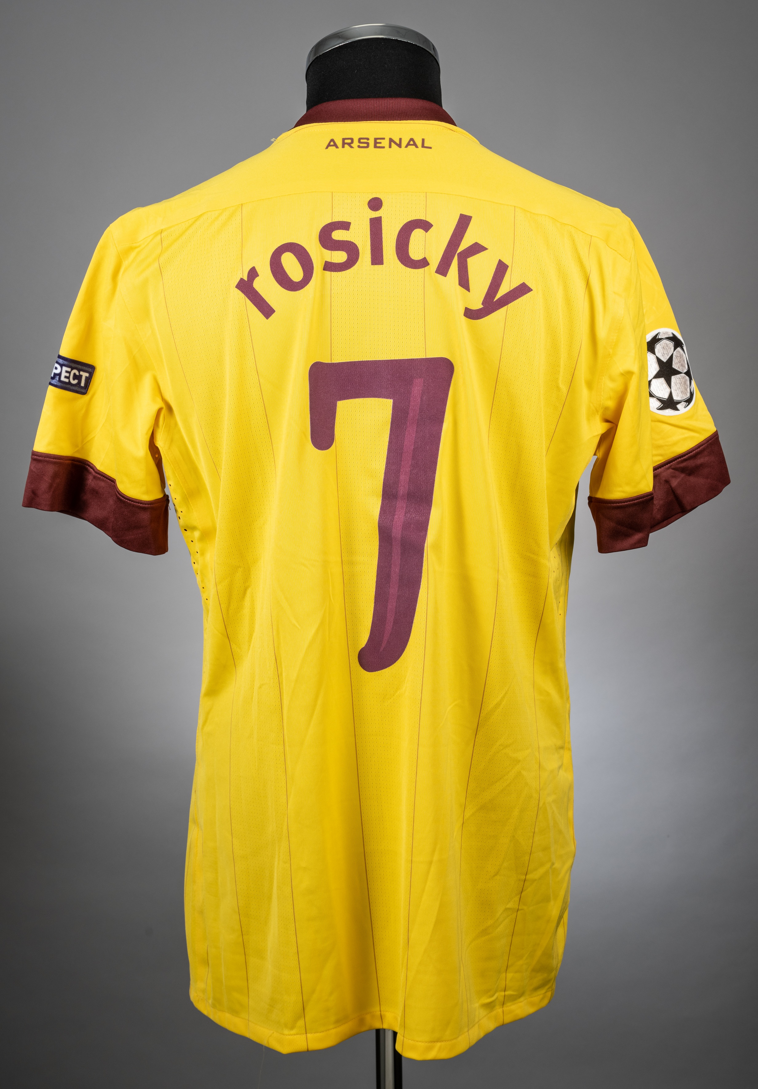 Tomas Rosicky yellow Arsenal no. 7 away jersey from the 2010-11 season Champions League game v Barcelona on 8/3/11 at the Nou Camp, Player issued short sleeved NIKE example with the UEFA RESPECT badge on the left arm and the Champions League badge on the right. The front has the Arsenal Club crest and the FLY EMIRATES sponsor logo is distinguished in redcurrant, as is all the trim on the jersey. The manufacturer trademark is also present. The back is lettered ROSICKY, bears the number 7 and also has the ARSENAL name beneath the collar. The jersey is a UK size L. Player issue with no visible signs of match wear. It is in excellent condition Barcelona beat Arsenal by 3 goals to 1 with Messi scoring a brace and Xavi adding the third. The Arsenal replay came from an own goal from Busquets.