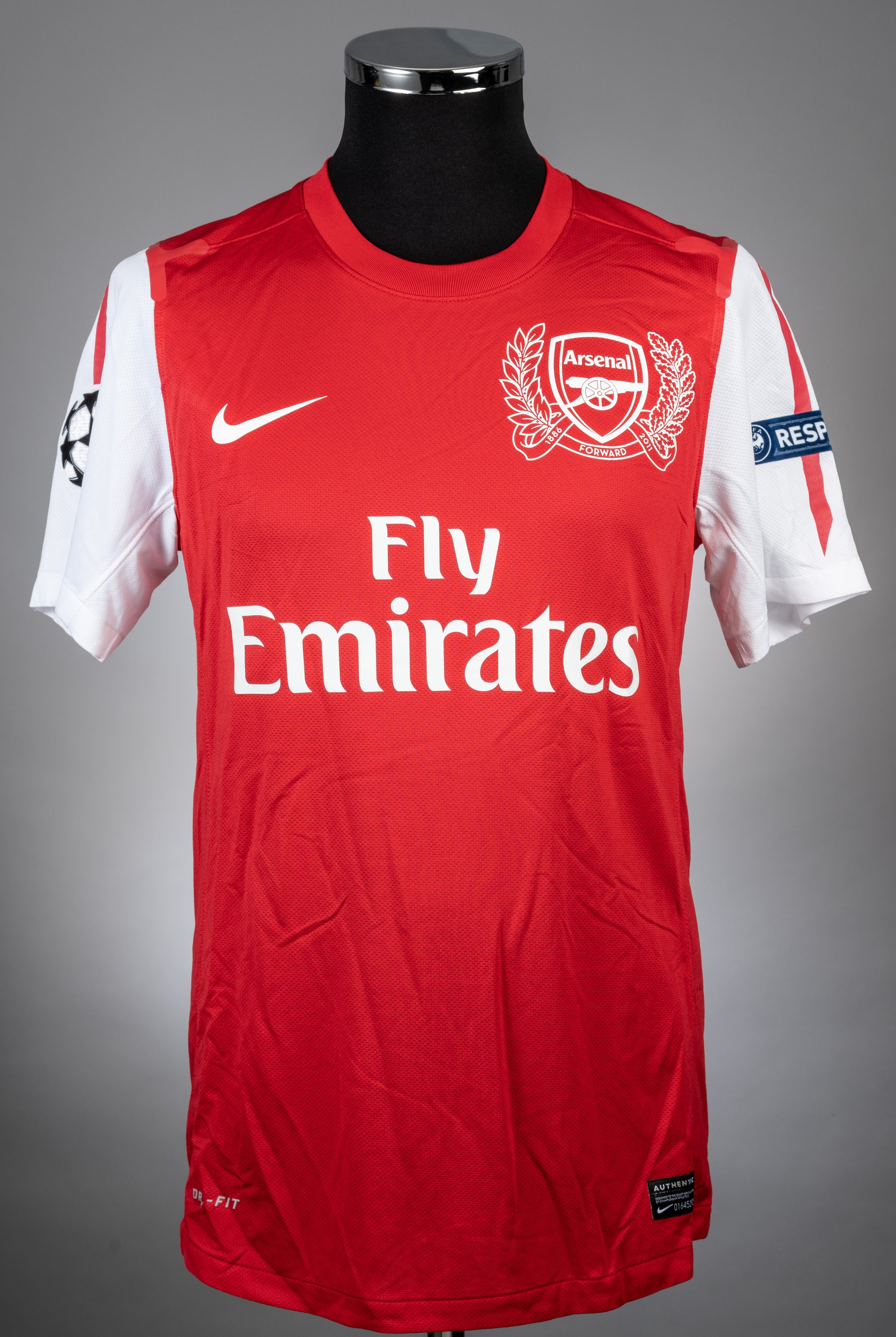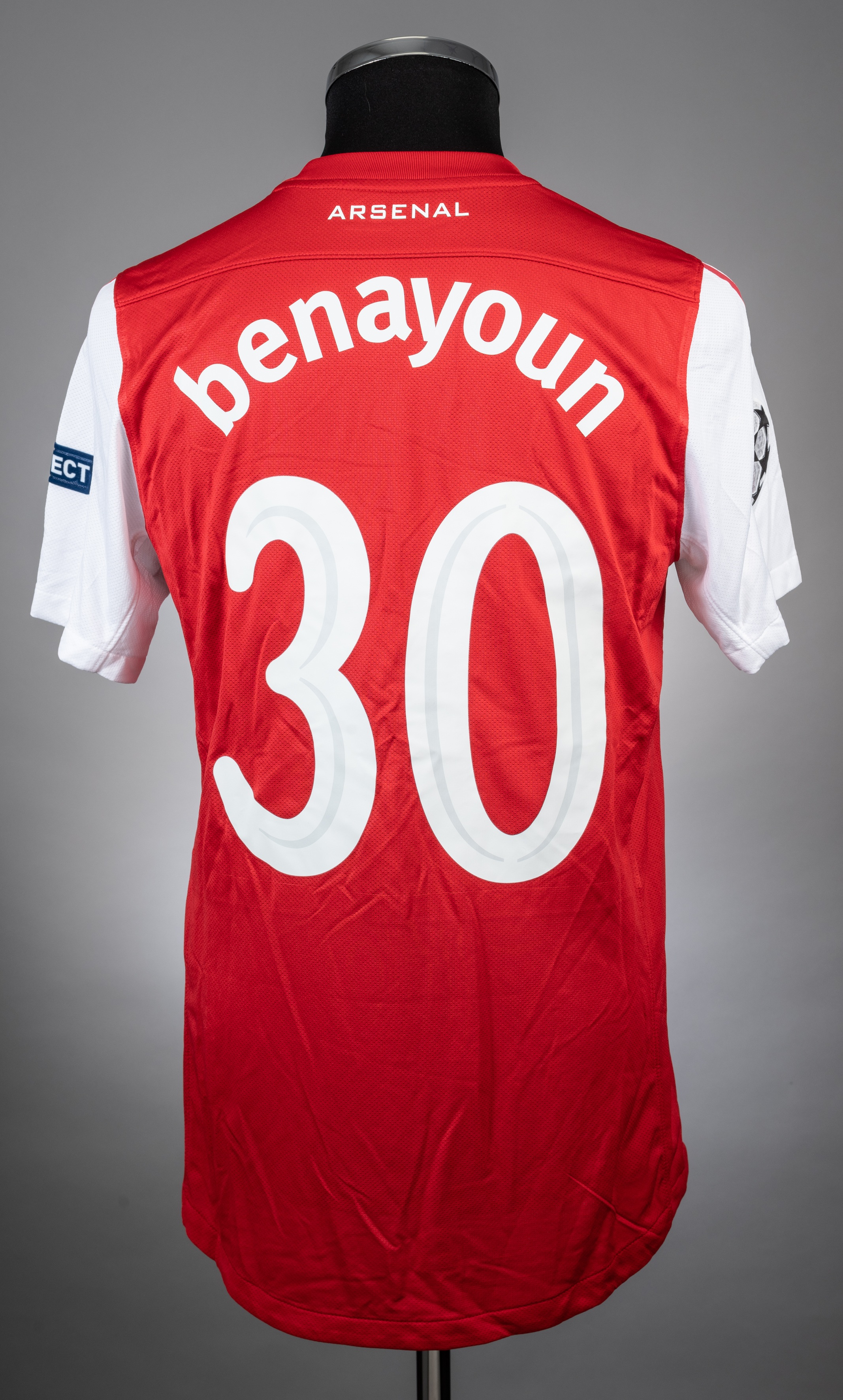Yossi Benayoun red Arsenal home jersey from the 2011-12 Champions League Campaign. Player issued short sleeved example with the UEFA RESPECT badge on the left arm and the Champions League badge on the right. The front has the Arsenal 1886- 2011 FORWARD Club crest and also the fly emirates sponsor logo. The manufacturer logo is present, both are picked out in white and the jersey is a UK size M. The back is lettered BENAYOUN and bears the no. 30. The numbers are white highlighted in grey. The ARSENAL club name is printed below the collar line in white. There is no evidence of match wear and the item is in excellent condition. Arsenal finished the season in the third place position of the Premier League for the 2011/12 season.