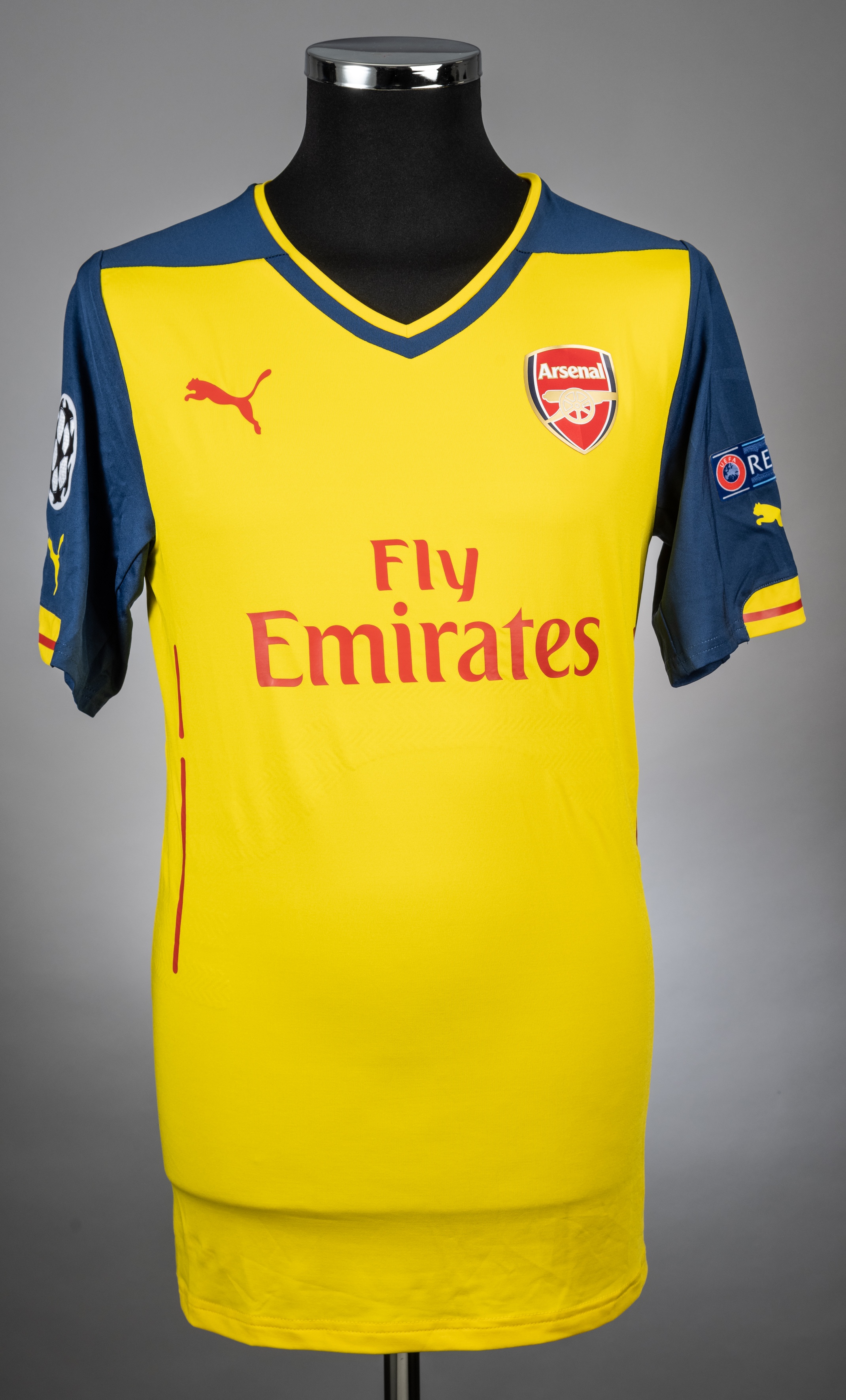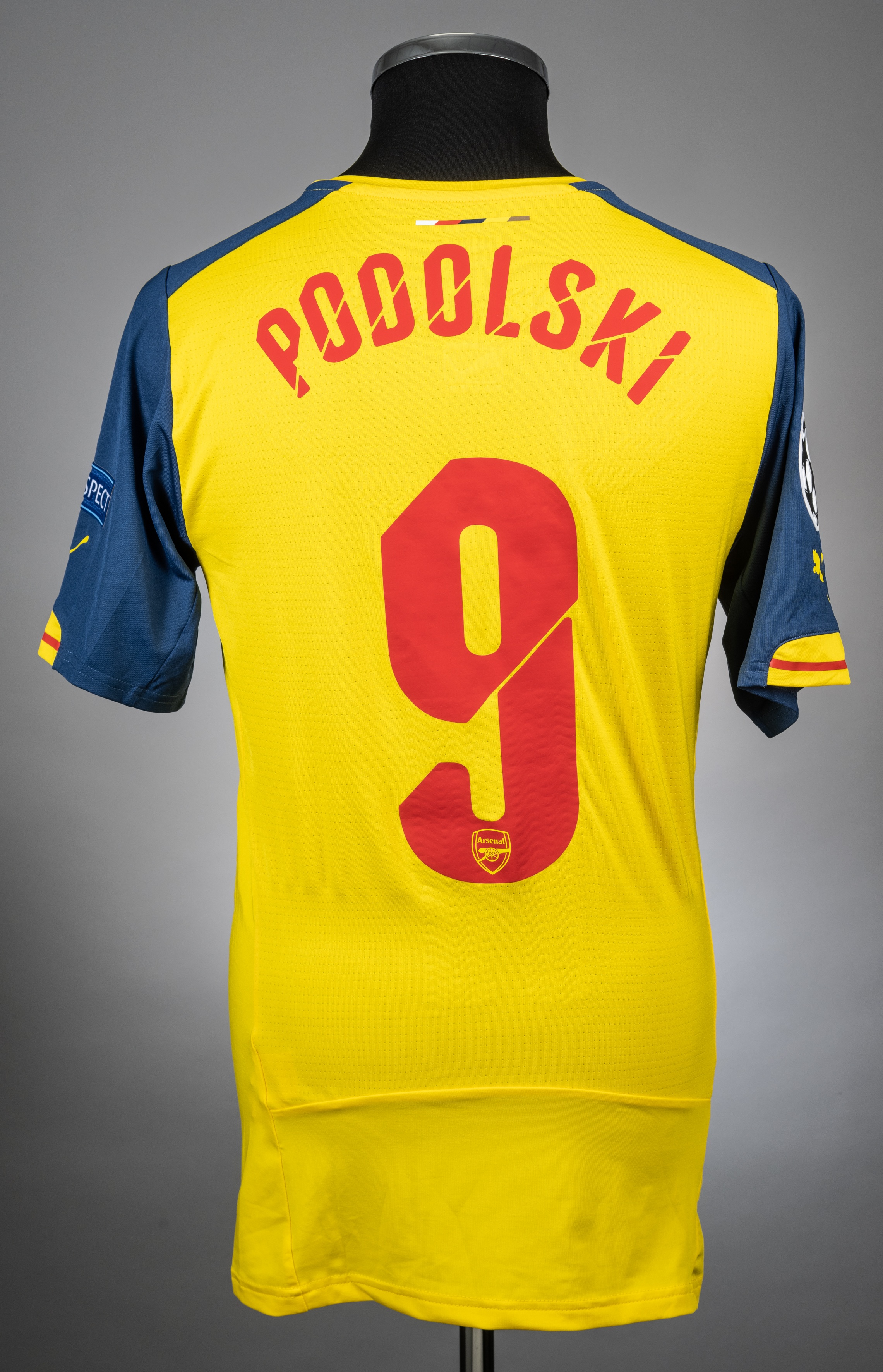 Lukas Podolski yellow and blue No.9 Champions League short-sleeved jersey, 2014-15, Puma, XL, with v-neck collar and badge inscribed Arsenal, the re