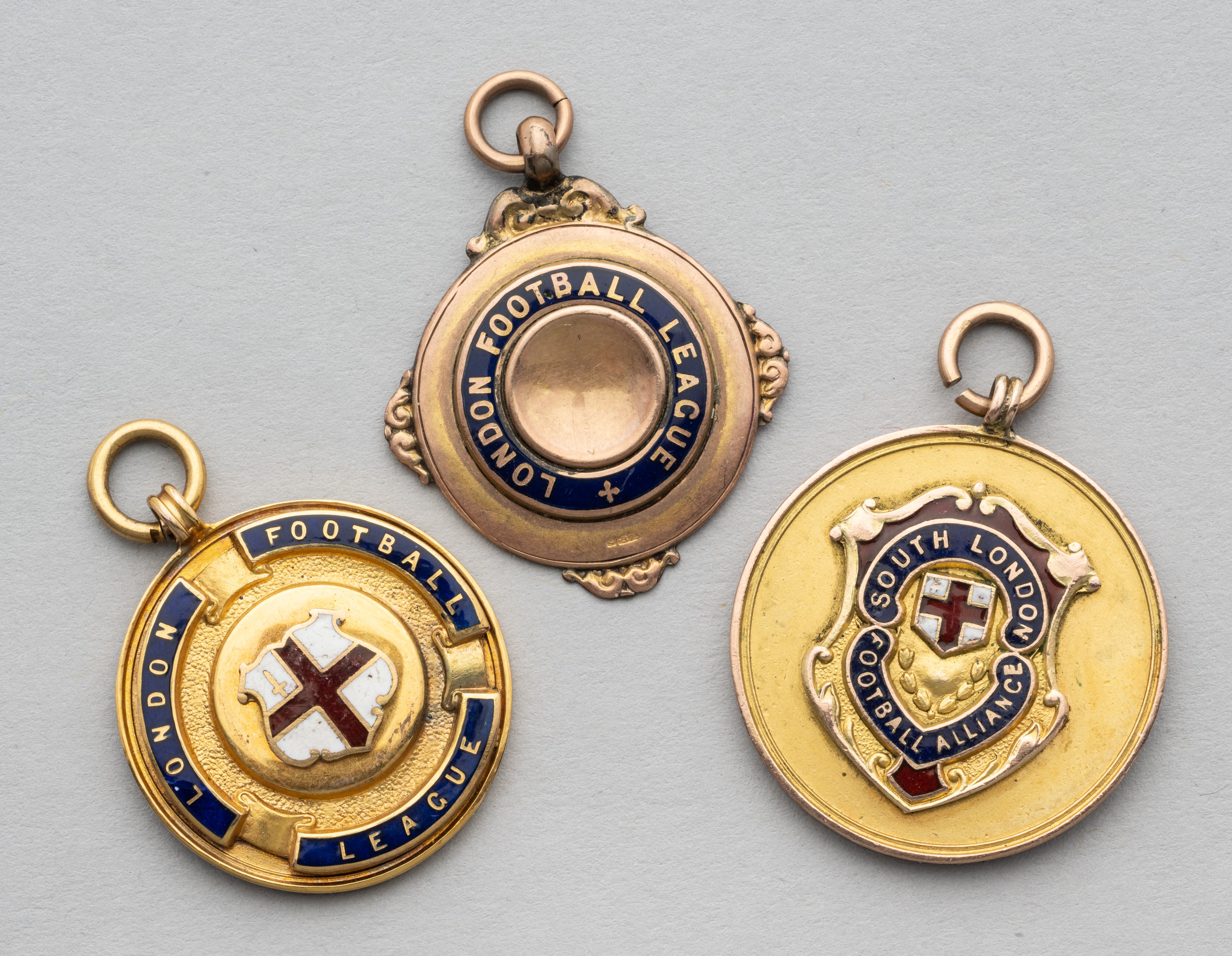 Three 9ct gold and enamel football medals for football in London, comprising the first inscribed London Football League, Hampstead Town FC 1913-14, the second inscribed South London Football Alliance Winners 1921-22, the third London Football League Winners, 1st Div. 1926-27, total weight 28gms. (3)