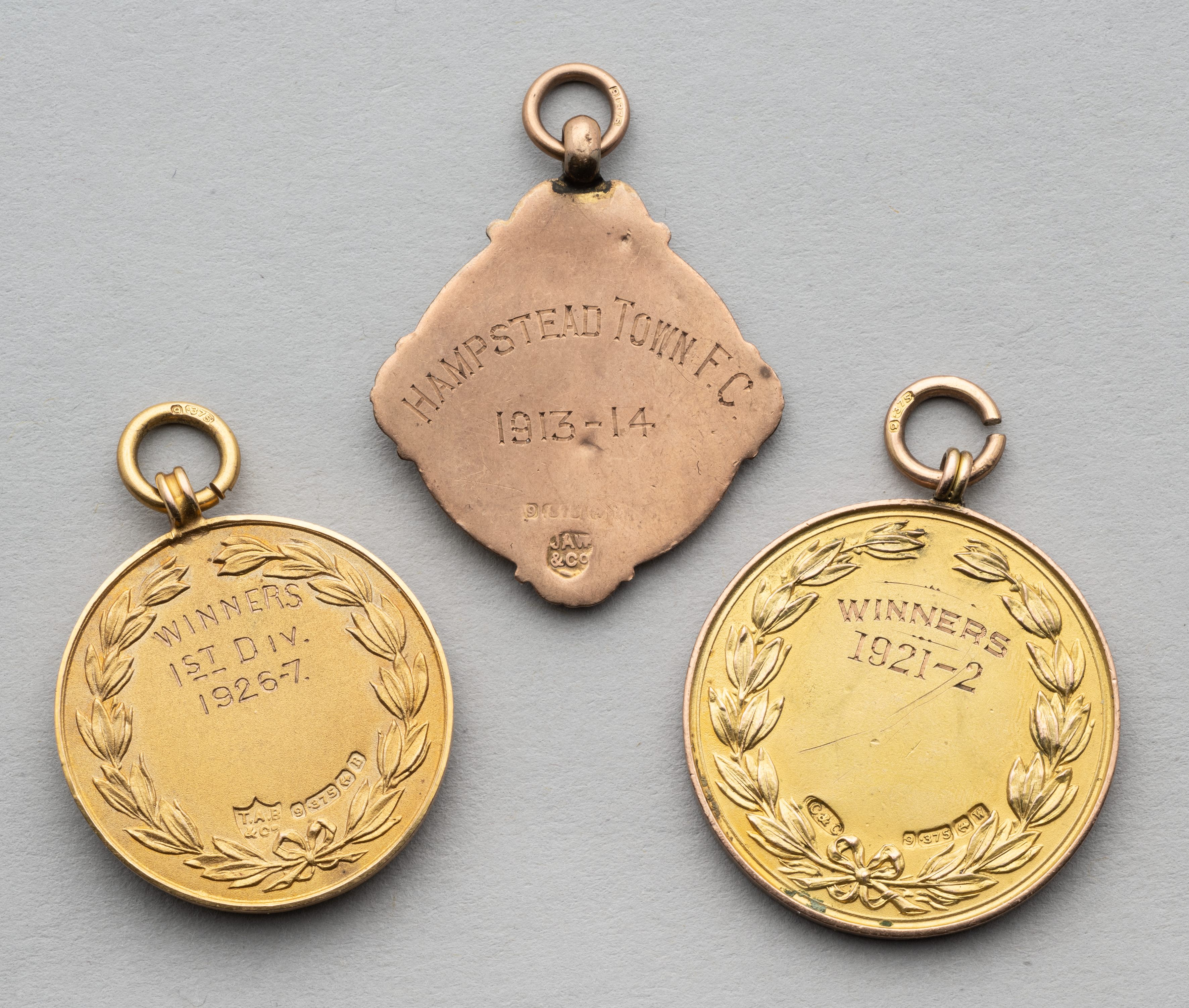 Three 9ct gold and enamel football medals for football in London, comprising the first inscribed London Football League, Hampstead Town FC 1913-14,