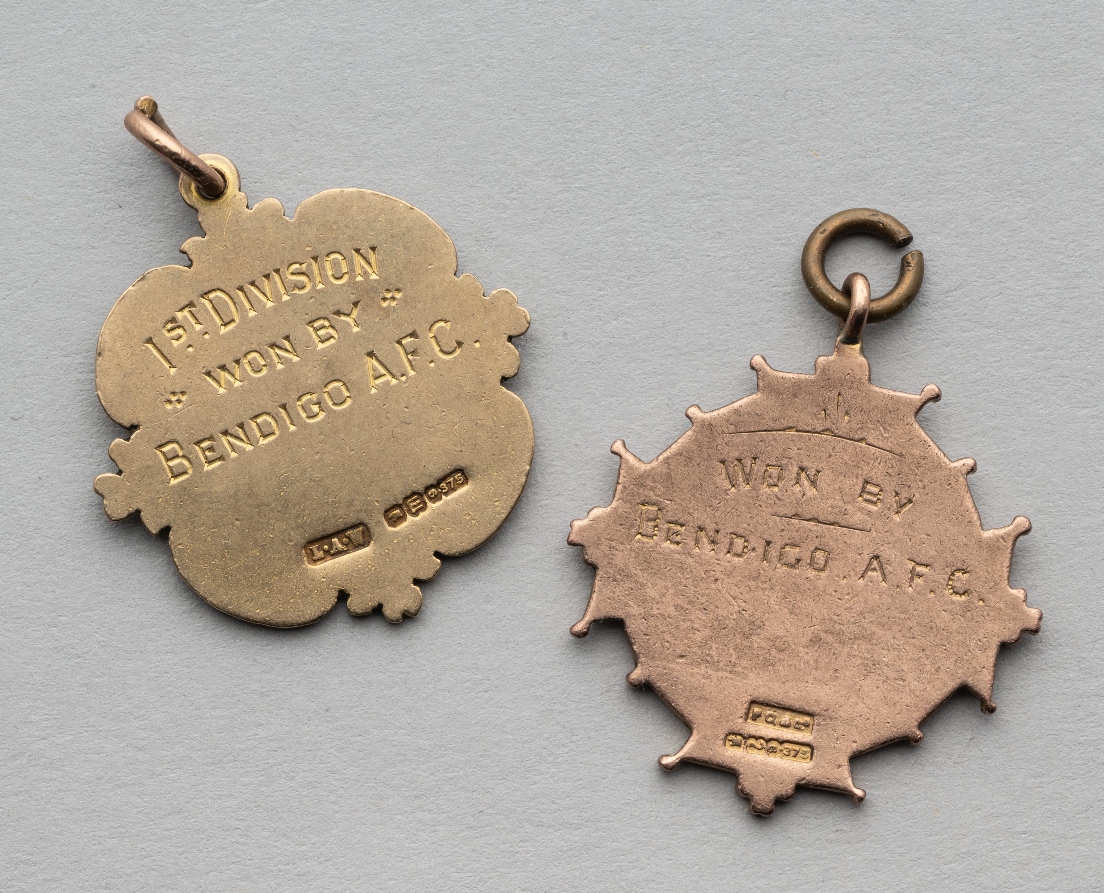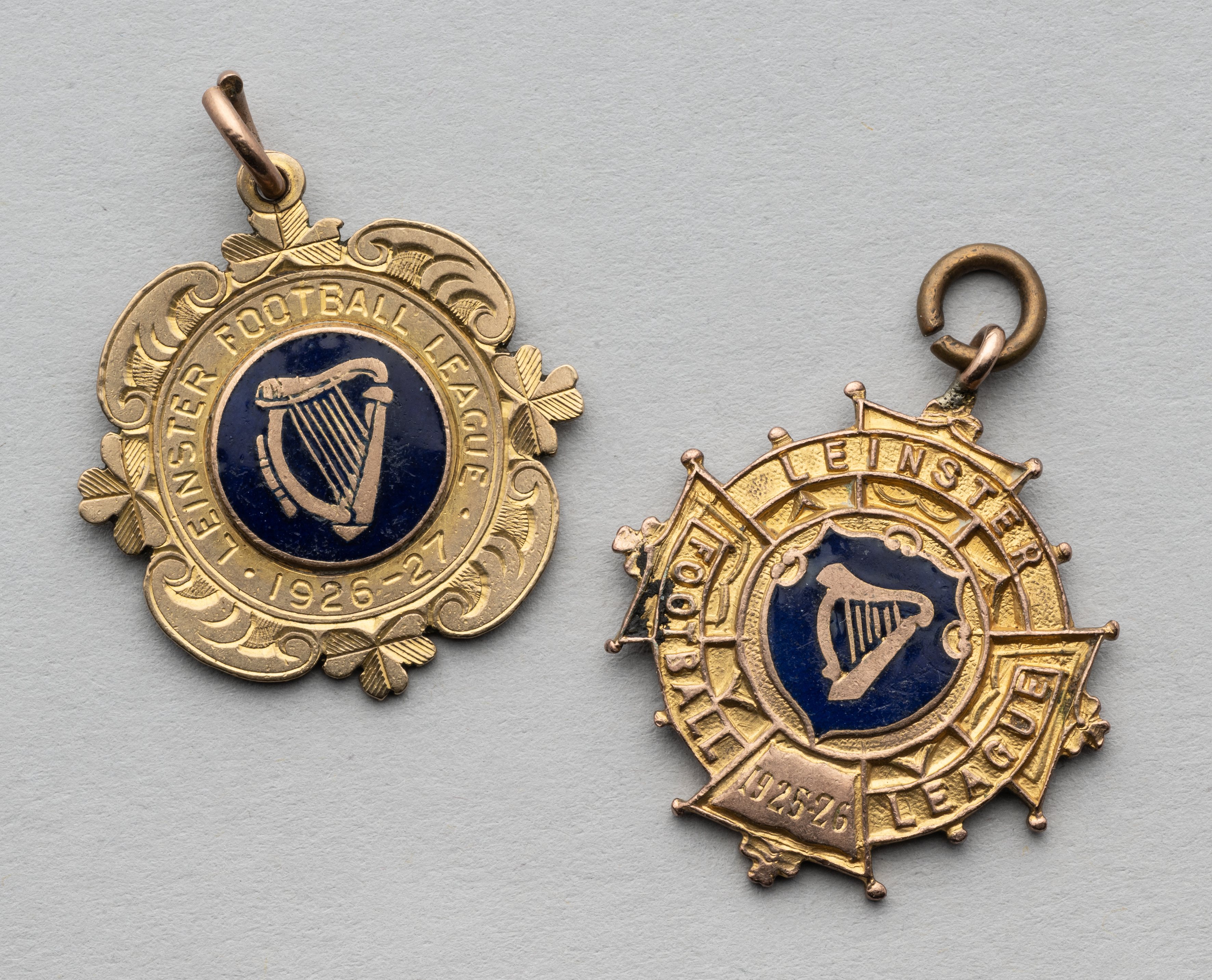 Two 9ct gold and enamel Irish football medals won by Bendigo AFC in the Leinster Football League 1920s, the first dated 1925-26, the second dated 192