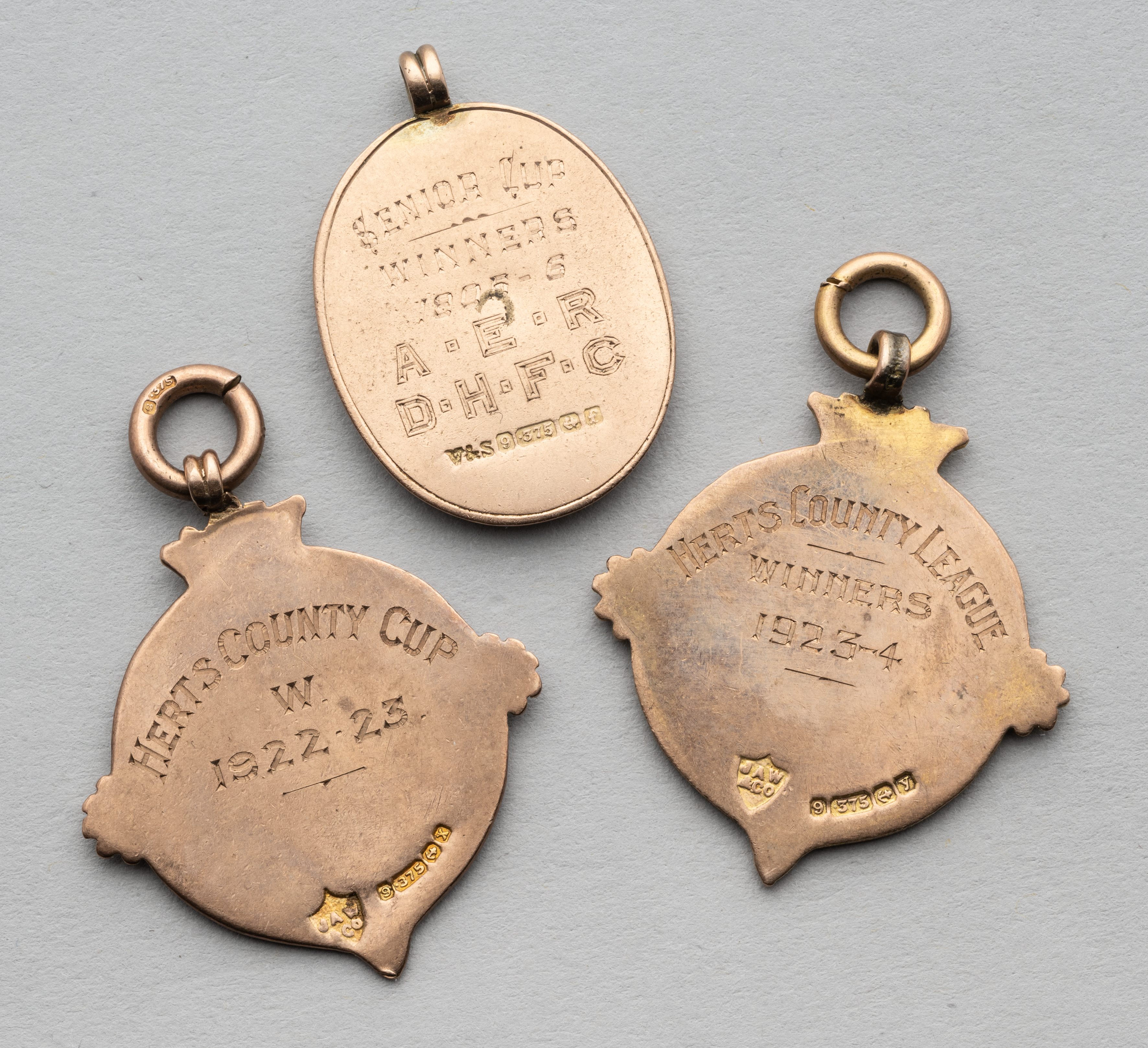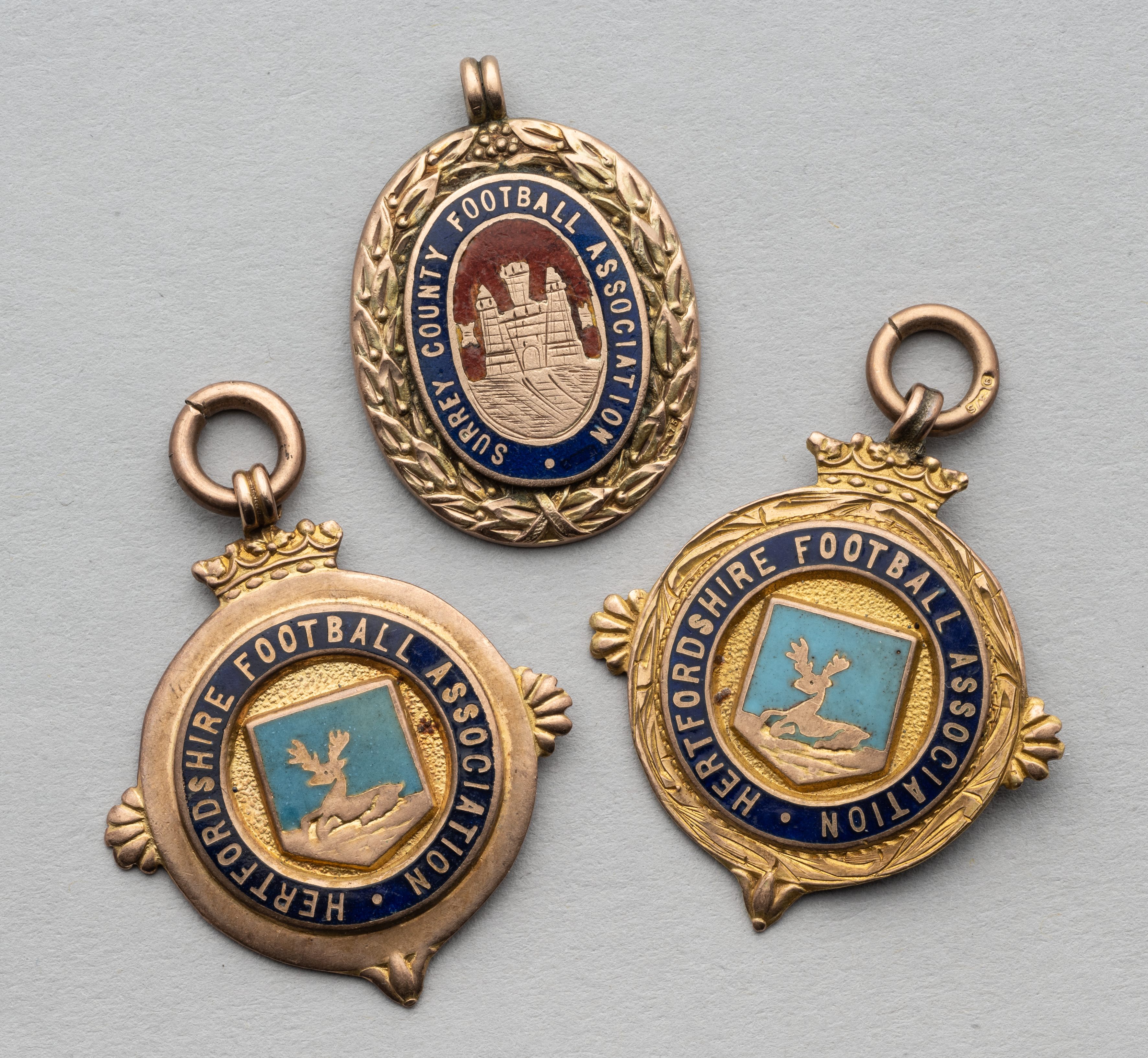 Two 9ct gold and enamel Hertfordshire FA football winners medals, the first inscribed Herts. County Cup 1922-23, the other Herts. County League 1923-24; sold together with a 9ct gold and enamel medal for the Surrey County FA Senior Cup 1905-06, inscribed winners AER, DHFC, total weight 21gms., (3)