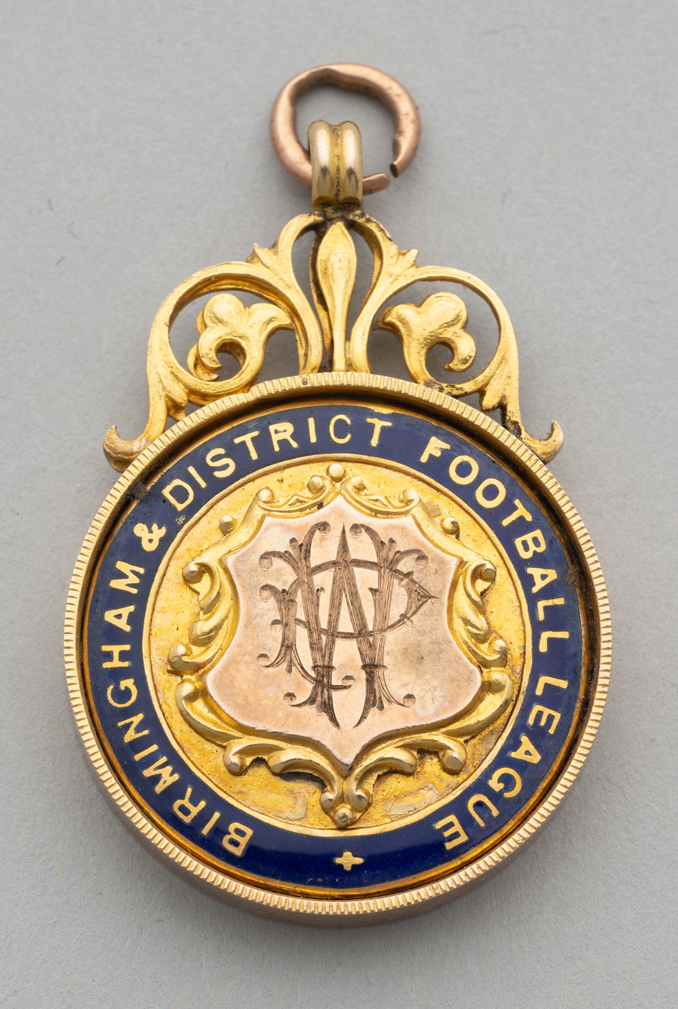 Bristol Rovers 9ct gold medal for Birmingham & District Football League awarded to W. Pickering, obverse with blue enamel and engraved centre with Pi