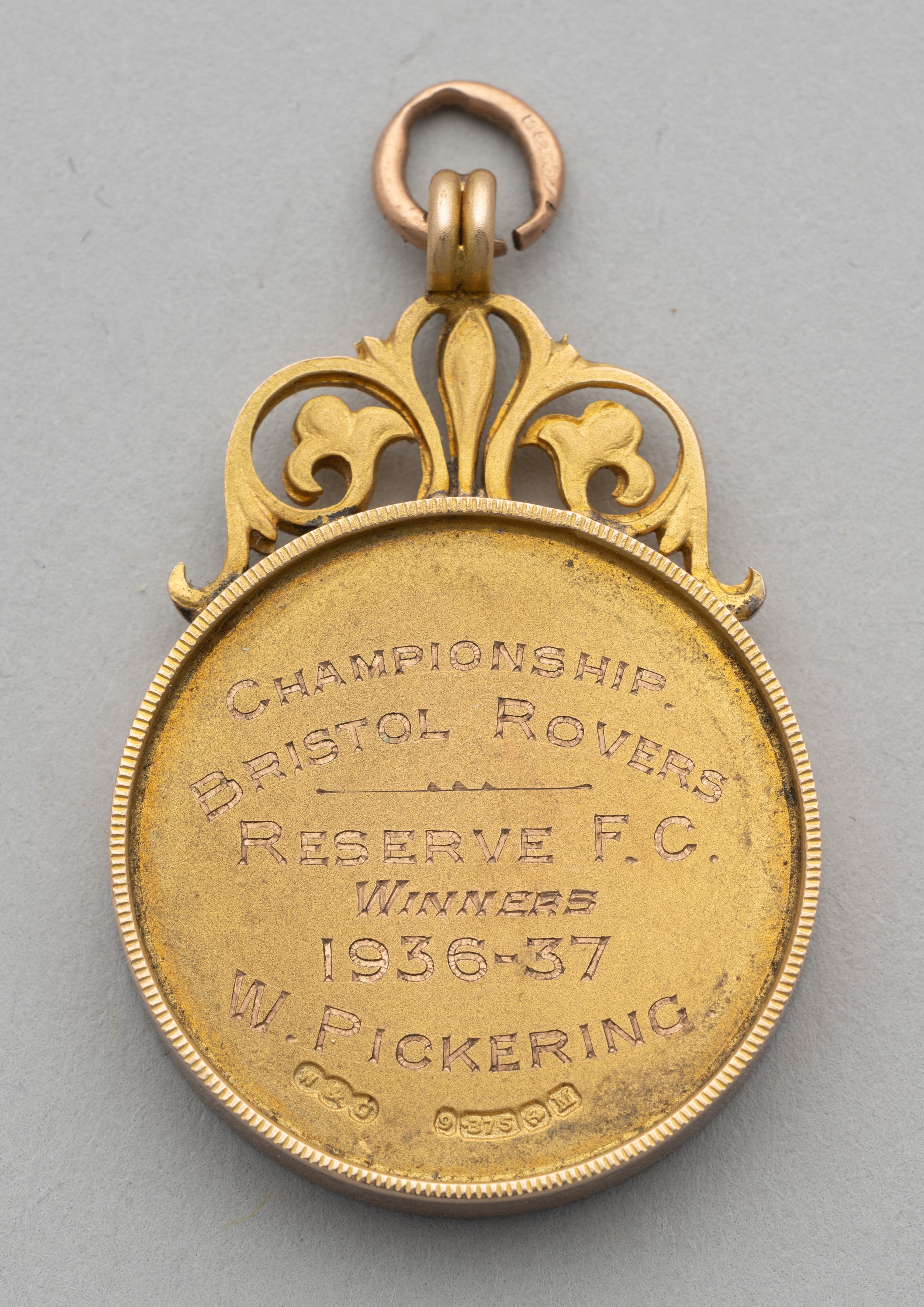 Bristol Rovers 9ct gold medal for Birmingham & District Football League awarded to W. Pickering, obverse with blue enamel and engraved centre with Pickering's initials W.P, reverse engraved Championship Bristol Rovers Reserve FC Winners 1936-37 W. Pickering. weight 23gms. W Pickering played for Bristol Rovers 1931-37, playing 215 times, scoring one goal