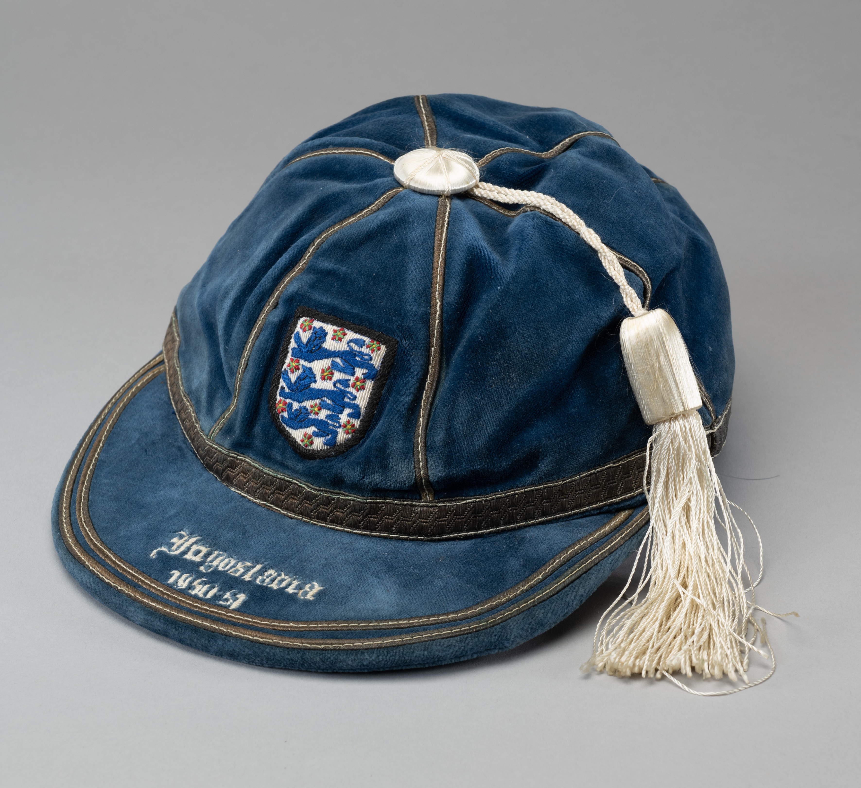 Willie Watson blue England v Yugoslavia International cap, 1950-51 the blue velvet cap with white tassel and silvered braiding, embroidered with the England three lion crest and YUGOSLAVIA 1950-51 The above cap represents Willie Watson's 4th and final appearance for England, in the match played on 22nd November 1950 at Wembley, England and Yugoslavia drew the match 2-2, both England goals coming from Nat Lofthouse