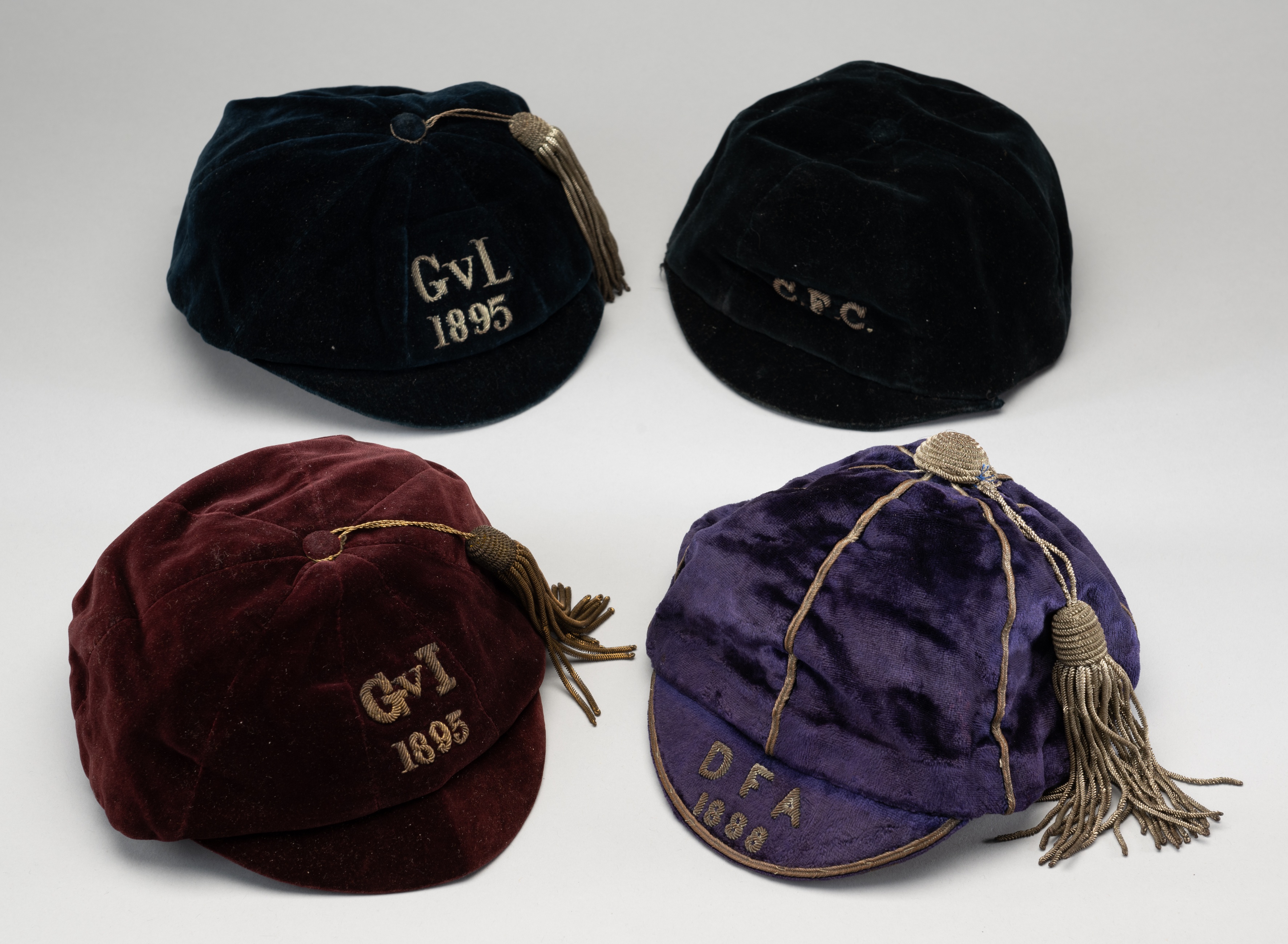 Two Glasgow representative caps, 1895, both with tassels, one embroidered G V L 1895, the other G V I 1895, a purple velvet cap, with silver tassel, and embroidered DFA 1888 and black velvet cap embroidered C.F.C. (4)