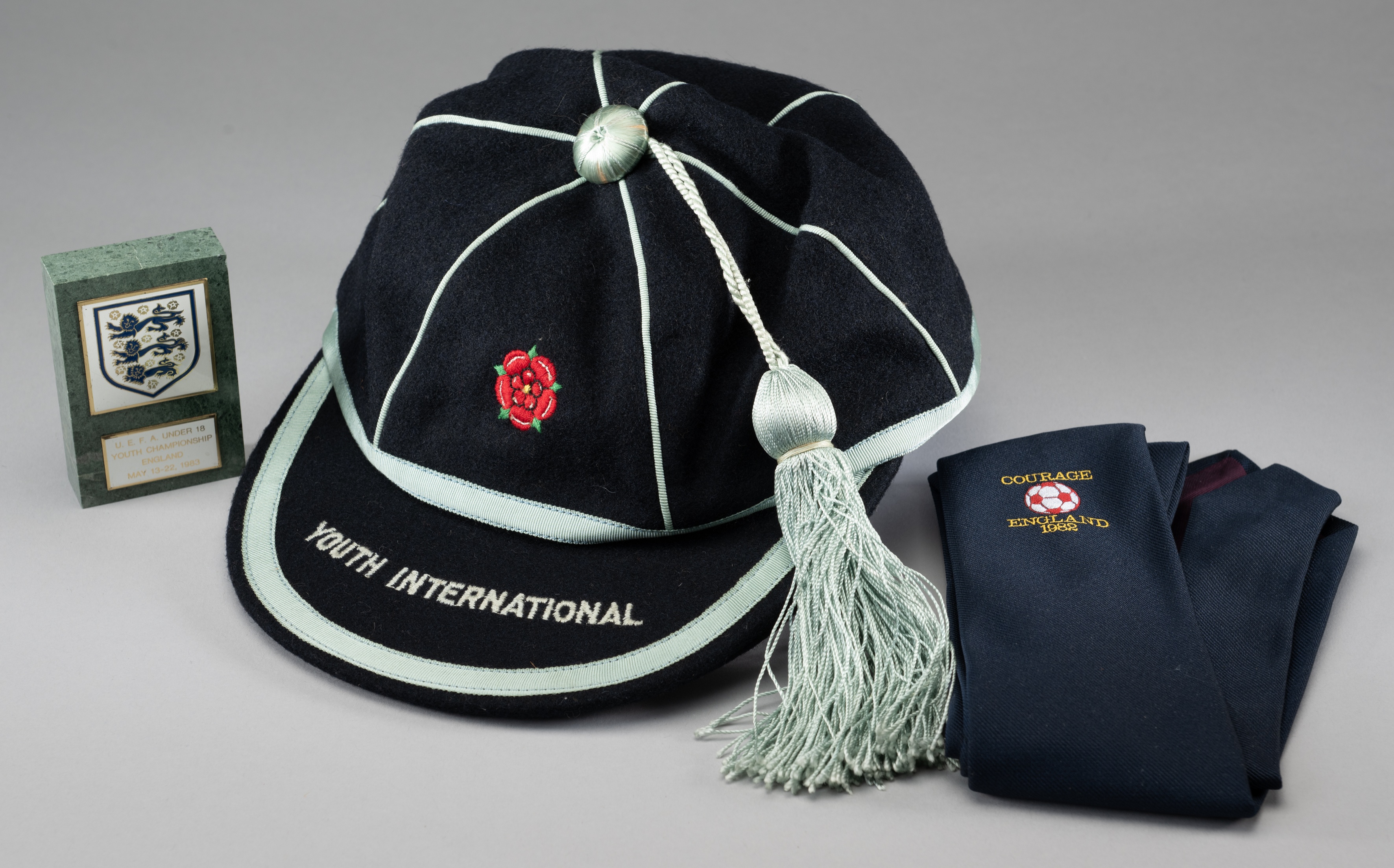 England Youth International football cap, the blue cap with red rose emblem and inscribed YOUTH INTERNATIONAL, undated and recipient unknown and a necktie embroidered Courage, England 1982 and small plaque inscribed U.E.F.A. Under 18 Youth Championship, England May 13-22, 1981 (3)