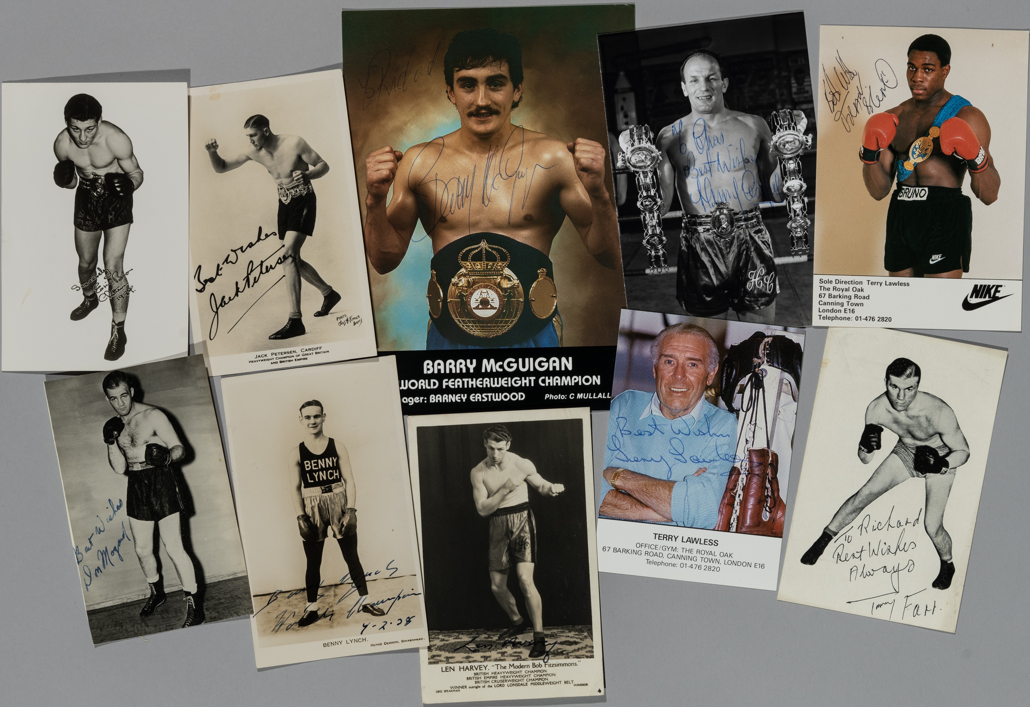 A rare Benny Lynch signed postcard, 1928, inscribed Benny Lynch, World Champion, 7.2.28, seven other autographed boxing cards including Don Mogard, Henry Cooper, Len Harvey etc (10)