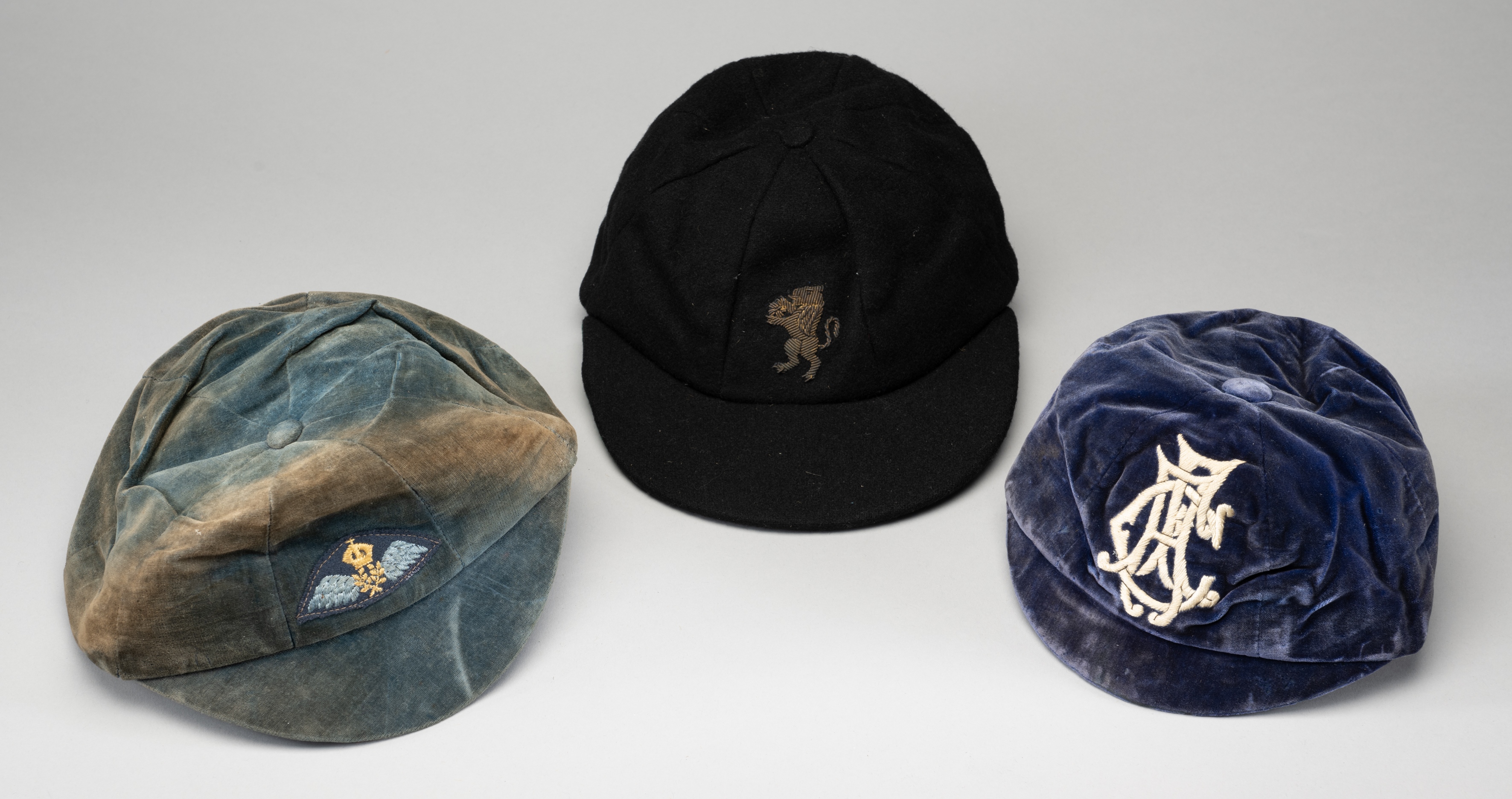 A trio of sporting caps a Victorian Honours cap embroidered "AFC" made by Gulland & Kennedy of Edinburgh, a Varsity Rubber peak cap c.1920's and a later Bukta Cricket Cap, (3) All in Good condition.