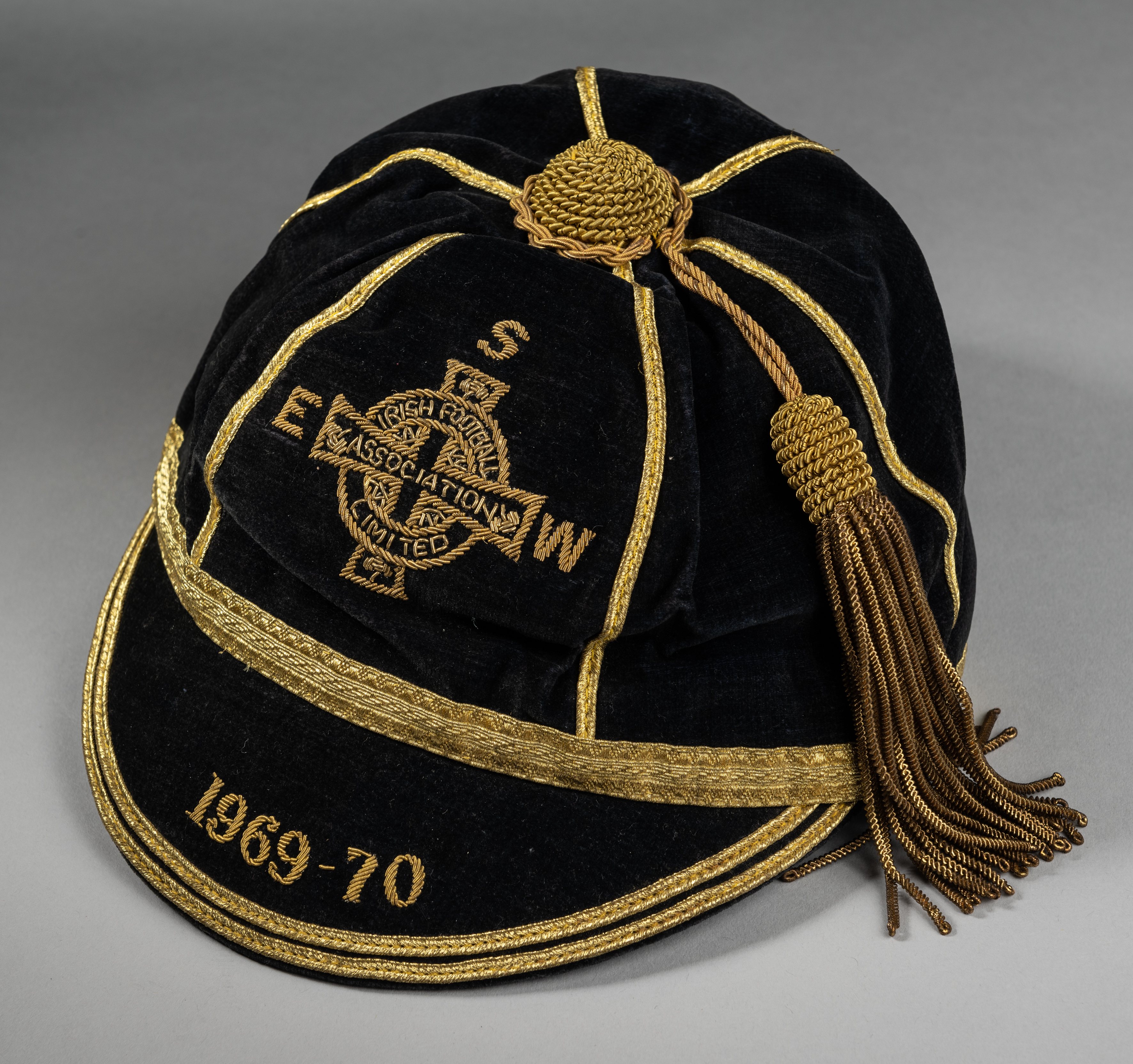 George Best blue Northern Ireland v. Scotland, England and Wales International Cap, 1969-70 the blue velvet cap with gilt tassel and gold-coloured braiding, embroidered S,E,W, 1969-70 The cap is in excellent condition with minimal fade to the material and trimmed with gold along with its tassel. In the first 1969-70 Home Championship match against Scotland played on 18th April 1970 at Windsor Park, Scotland defeated Northern Ireland 1-0, in the match against England played on the 21st April 1970 at Wembley in front of 100,000 spectators England defeated Northern Ireland 3-1, Best scoring the only Irish goal and in the final match against Wales played on 25th April at the Vetch Field, Swansea, Wales defeated Northern Ireland 1-0. The cap covers George's 20, 21 and 22nd appearances for his country. Provenance: Christie's Glasgow 24th September 1999 lot 50. Then sold again at Bonham's, London, 14th June 2002, lot 62.