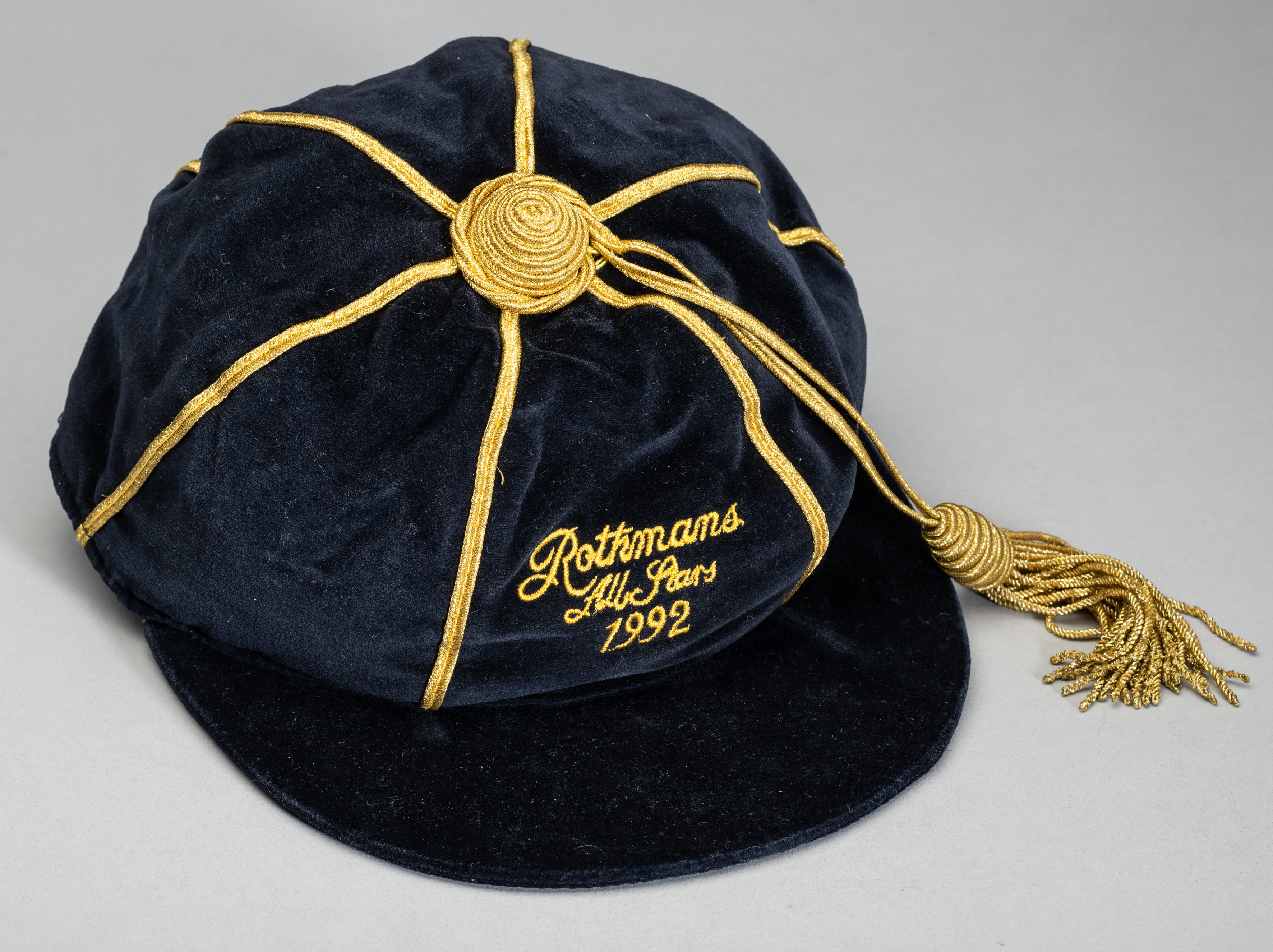 Rothmans All Stars XI cap awarded in 1992, navy velvet cap with gilt tassel and braiding, embroidered ROTHMANS ALL STARS 1992, with makers label Toye, Kenning & Spencer Ltd on interior with vacant name badge The original recipient of this cap is unknown.