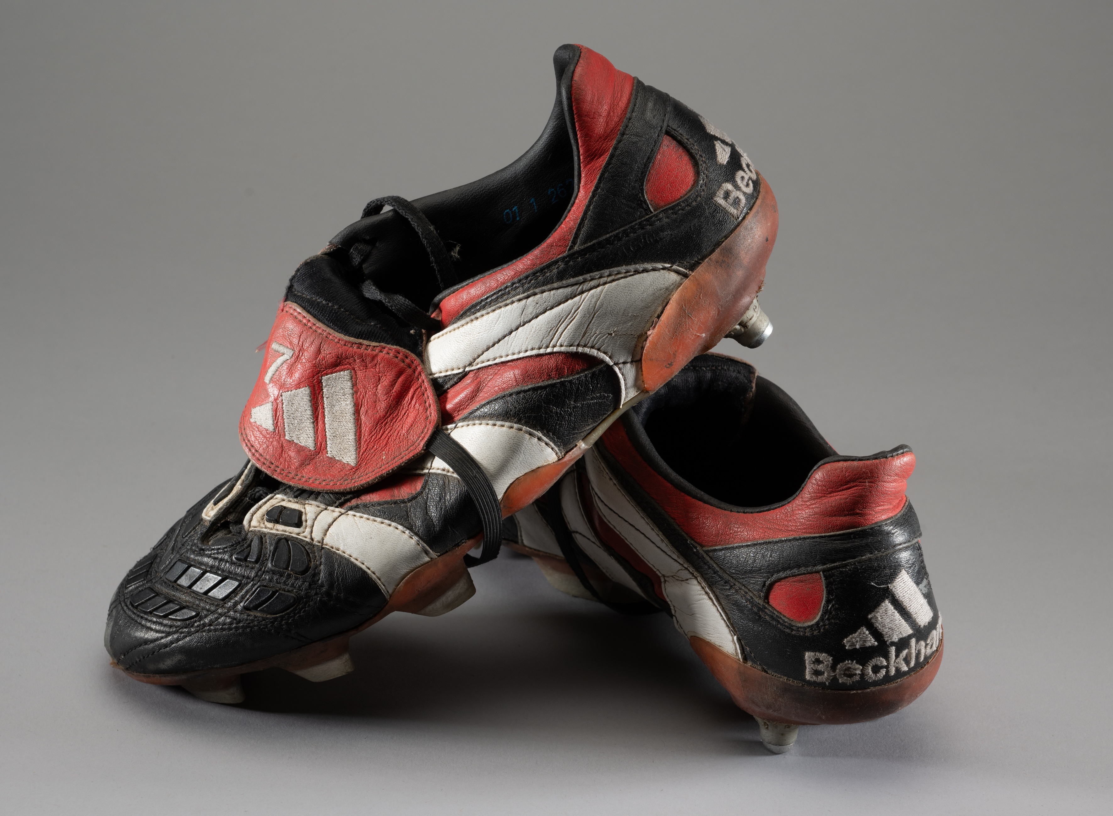 David Beckham pair of match worn Adidas Predator Accelerator football boots, season 1998-99, the black, red and white boots stitched with BECKHAM and No.7 on each, size 8.5 UK, with adapted sole that has studs in the heel, a hand made modification to overcome a short term issue David had with his boots. This was quickly resolved, which makes these particular boots extremely rare and highly sought after by collectors. . Provenance: The vendor worked with David Beckham on numerous occasions, and these boots were given to him as a token of gratitude for his professional assistance.