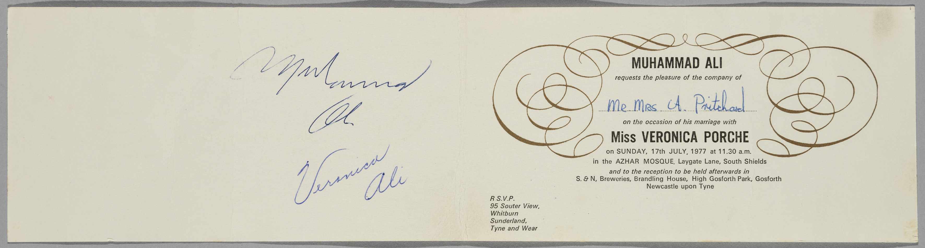 A rare Muhammad Ali Wedding Invitation to celebrate the blessing of his marriage to Vernoica Porche, dated 17th July 1977, the invitation autographed by Muhammad Ali and his new wife Veronica Ali The invitation was sent to Mr & Mrs Pritchard for the ceremony held at the Azhar Mosque, South Shields