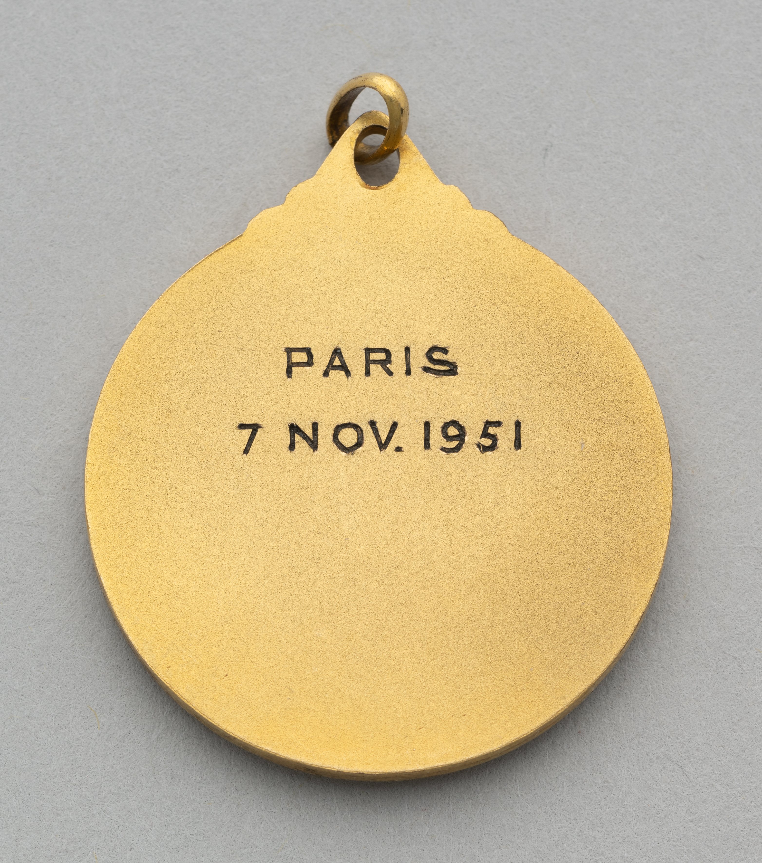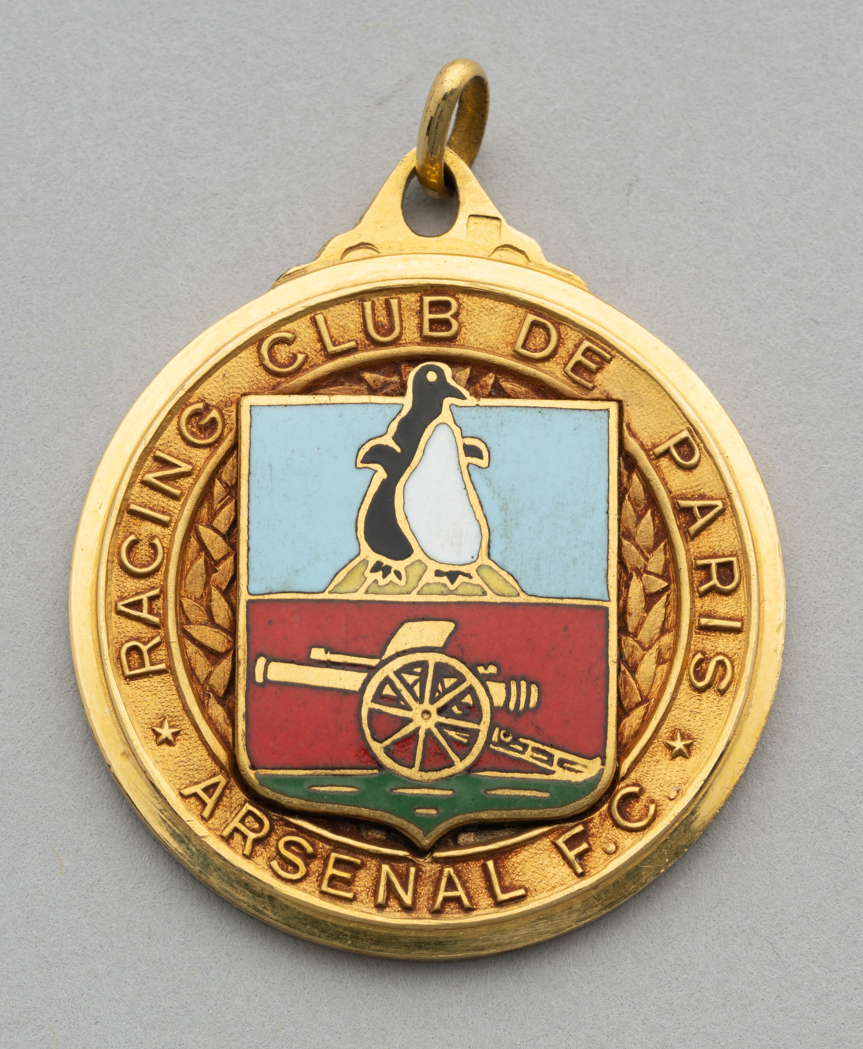 George Swindin yellow-metal and enamel Arsenal v. Racing Club De Paris medal, the obverse inscribed RACING CLUB DE PARIS, ARSENAL F.C., the reverse