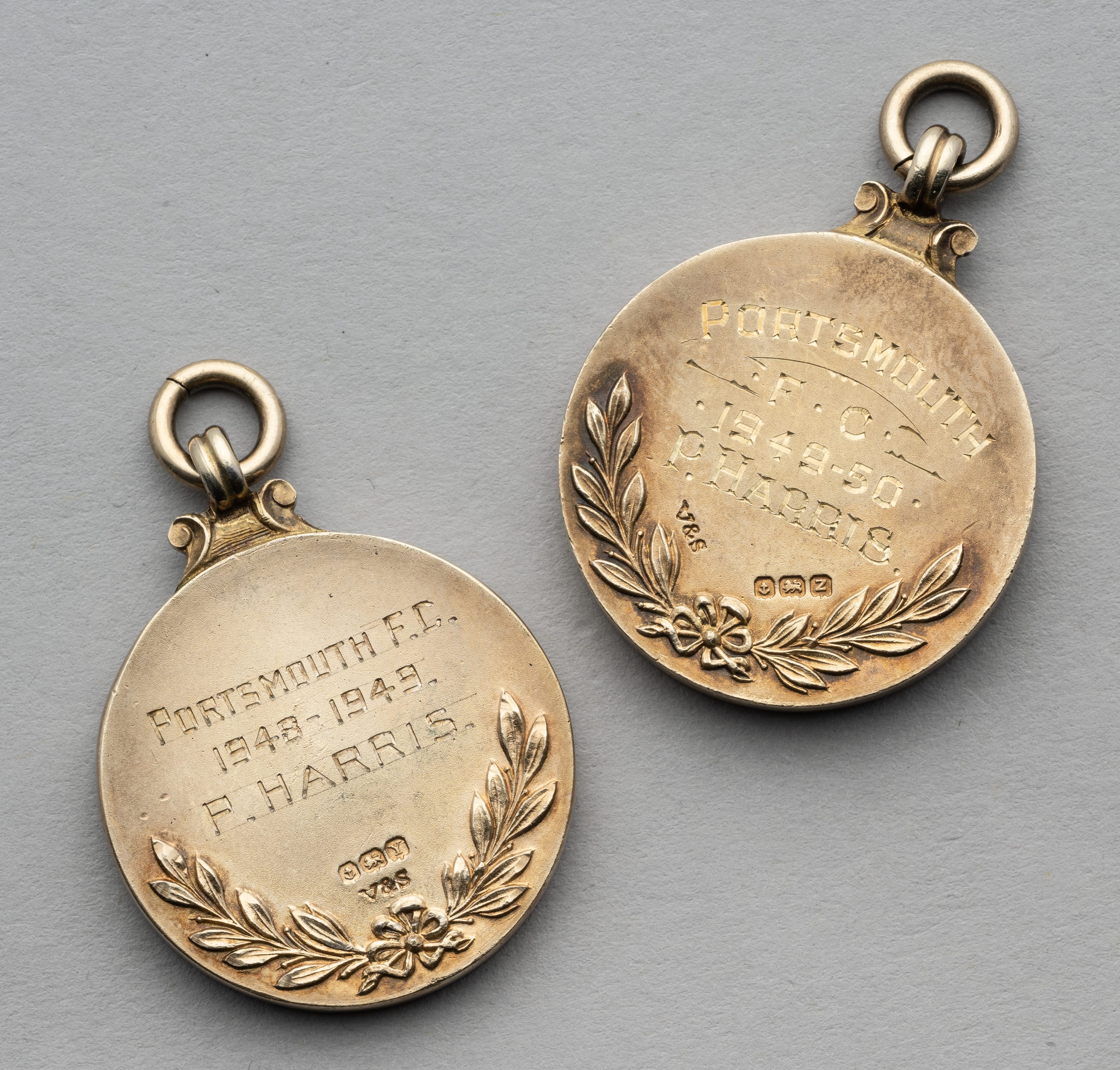 Peter Harris two silver-gilt Division 1 Back-to-Back League Championship medals, 1948-49 and 1949-50 1948-49, the obverse inscribed THE FOOTBALL LEAGUE CHAMPIONS DIVISION 1, the reverse inscribed PORTSMOUTH F.C. 1948-49, P. HARRIS, in original fitted case 1949-50, the obverse inscribed THE FOOTBALL LEAGUE CHAMPIONS DIVISION 1, the reverse inscribed PORTSMOUTH F.C. 1949-50, P. HARRIS, in original fitted case (2) Portsmouth won their first-ever League Championship in 1948-49 with 58 points, Manchester United being runners-up on 53 points. Portsmouth successfully retained the League Championship in 1949-50, finishing level on points with Wolverhampton Wanderers, However, their goal ration was better thus they were crown league winners. Peter Harris was a crucial part of the the back-to-back league championship wins, An outside right, he was fast, well balanced, in the 1948-49 season he was joint top scorer with Duggie Reid on 17 goals and the following season he played 40 out of the 42 matches, this time scoring 16 goals. Lot 605 to 609 relate to Peter Harris