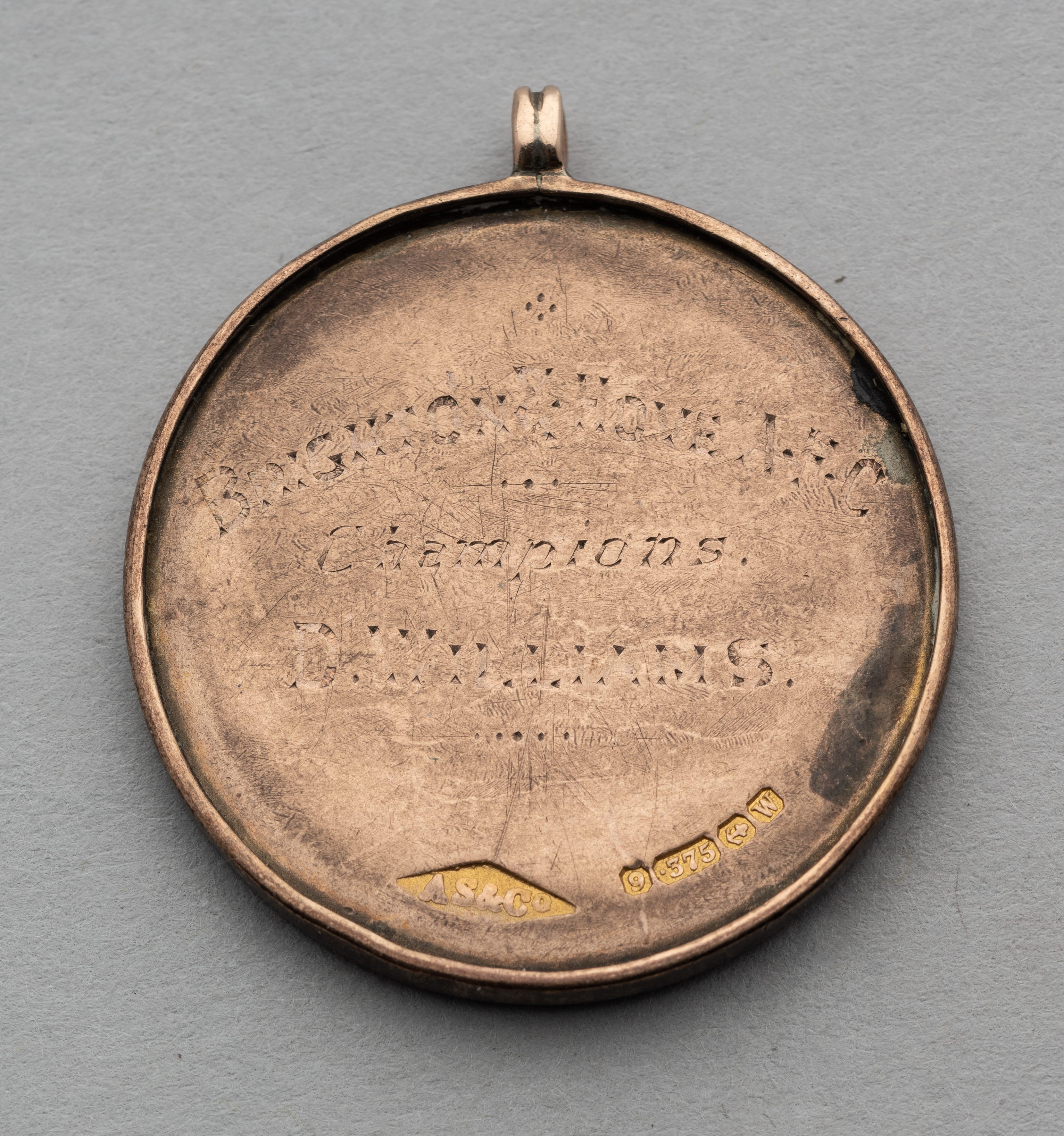 9ct gold & enamel Southern League Championship medal won by Dai Williams of Brighton & Hove Albion in season 1920-21, fully inscribed with competition details, weight 14gms. The reserves team represented Brighton & Hove Albion in the Southern League Championship (English Section). They finished the season 2 points clear of Portsmouth, who also fielded a 2nd XI team. Brighton's Dai Williams (also known as Dave) was a Liverpudlian forward who had previously played League football for Glossop and Notts County.