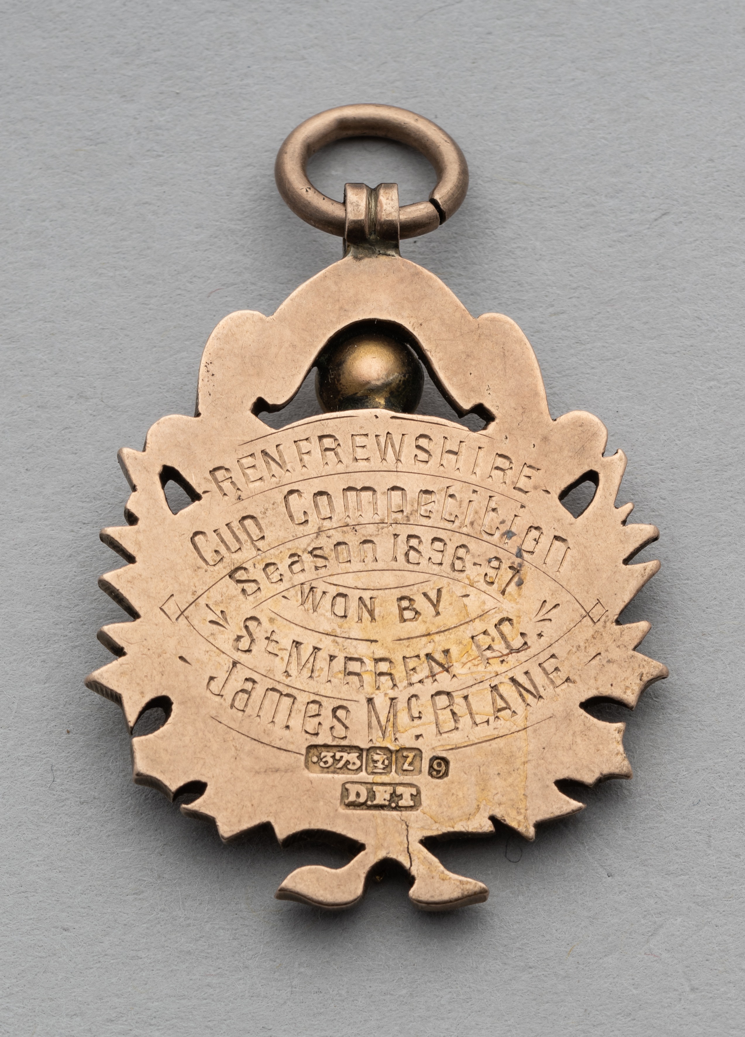 9ct gold Renfrewshire Cup winners medal awarded to James McBlane of St. Mirren FC in season 1896-97, fully inscribed with competition details, weight 15gms. James McBlane scored the only goal in the replay v Port-Glasgow Athletic.