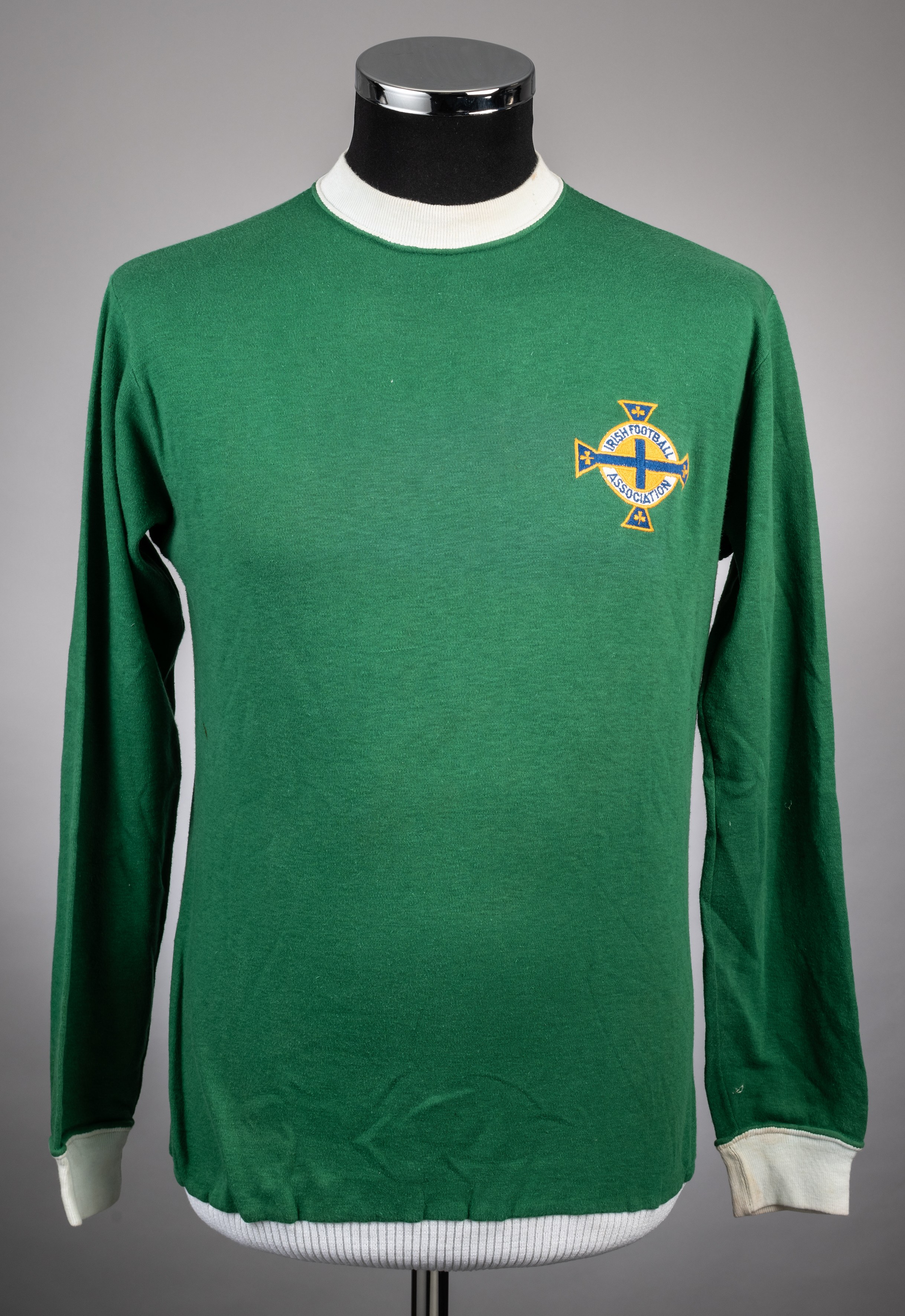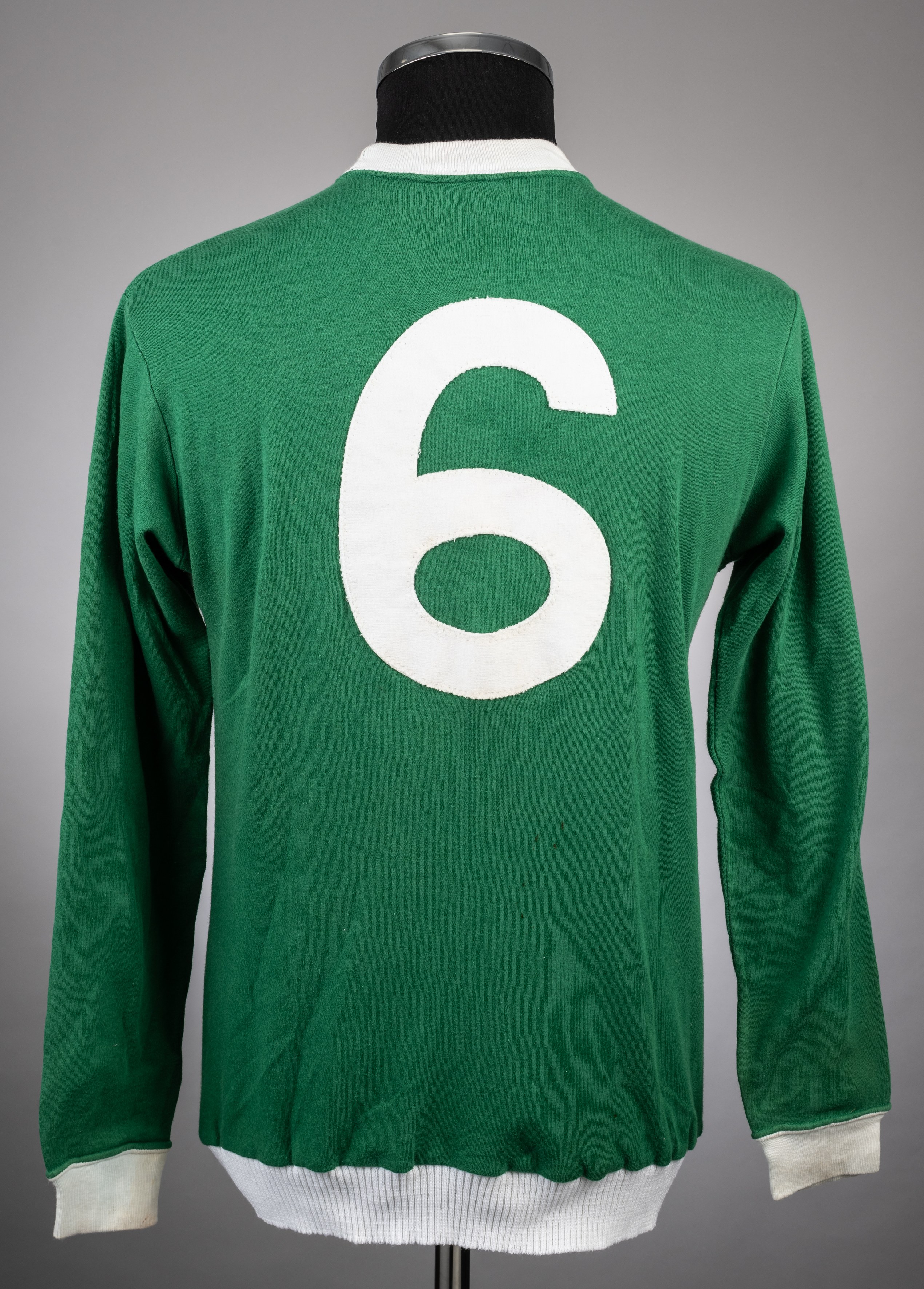 Rare green No.6 Northern Ireland international jersey, Umbro, OSM, with crew-neck collar and embroidered badge inscribed IRISH FOOTBALL ASSOCIATION, with unusual elastic waist band Tommie Hamilton came to Manchester from Edinburgh around 1960. He was a keen keep fit fanatic in his early years, always at the gym working out. it was there he met a few of the Scots who played for Manchester United. He decided to convert the cellar of his house into his own personal gymnasium. Some of Tommie's United pals started using his gym for weight training and he soon became good friends with some of them including Denis Law, Paddy Crerand and Jim Ryan. He helped a number of United players to fitness by introducing them to certain types of weight training. Manchester United that some players were doing something different and enquired into what that was. The club Manchester United got in contact with Tommie to ask about sending more players to him. Nobby Stiles, George Best and many others regularly went to Tommie' gym. Many of the players gifted him their kit which he treasured and remained friends with the players and Manchester United for many years