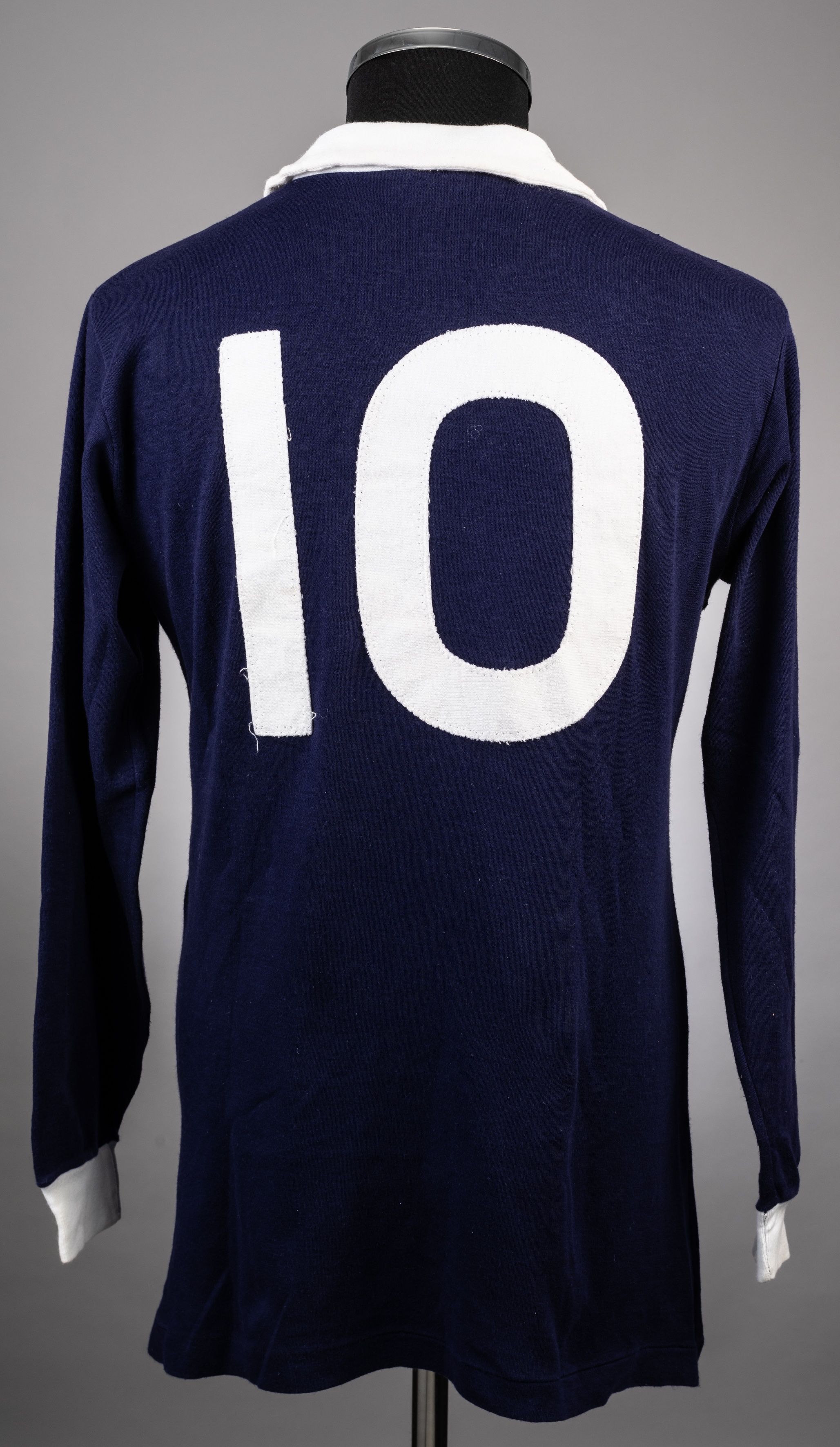 Denis Law blue No.10 Scotland International jersey, early 1970s, Umbro, M, with v-neck style collar and embroidered cloth badge inscribed THE SCOTTISH FOOTBALL ASSOCIATION The above jersey was worn by Denis Law in an International match, however, we are unable to identify the match from the style of the jersey it will be in the early 1970s, it was given to Tommie Hamilton by Law Tommie Hamilton came to Manchester from Edinburgh around 1960. He was a keen keep fit fanatic in his early years, always at the gym working out. it was there he met a few of the Scots who played for Manchester United. He decided to convert the cellar of his house into his own personal gymnasium. Some of Tommie's United pals started using his gym for weight training and he soon became good friends with some of them including Denis Law, Paddy Crerand and Jim Ryan. He helped a number of United players to fitness by introducing them to certain types of weight training. Manchester United that some players were doing something different and enquired into what that was. The club Manchester United got in contact with Tommie to ask about sending more players to him. Nobby Stiles, George Best and many others regularly went to Tommie' gym. Many of the players gifted him their kit which he treasured and remained friends with the players and Manchester United for many years