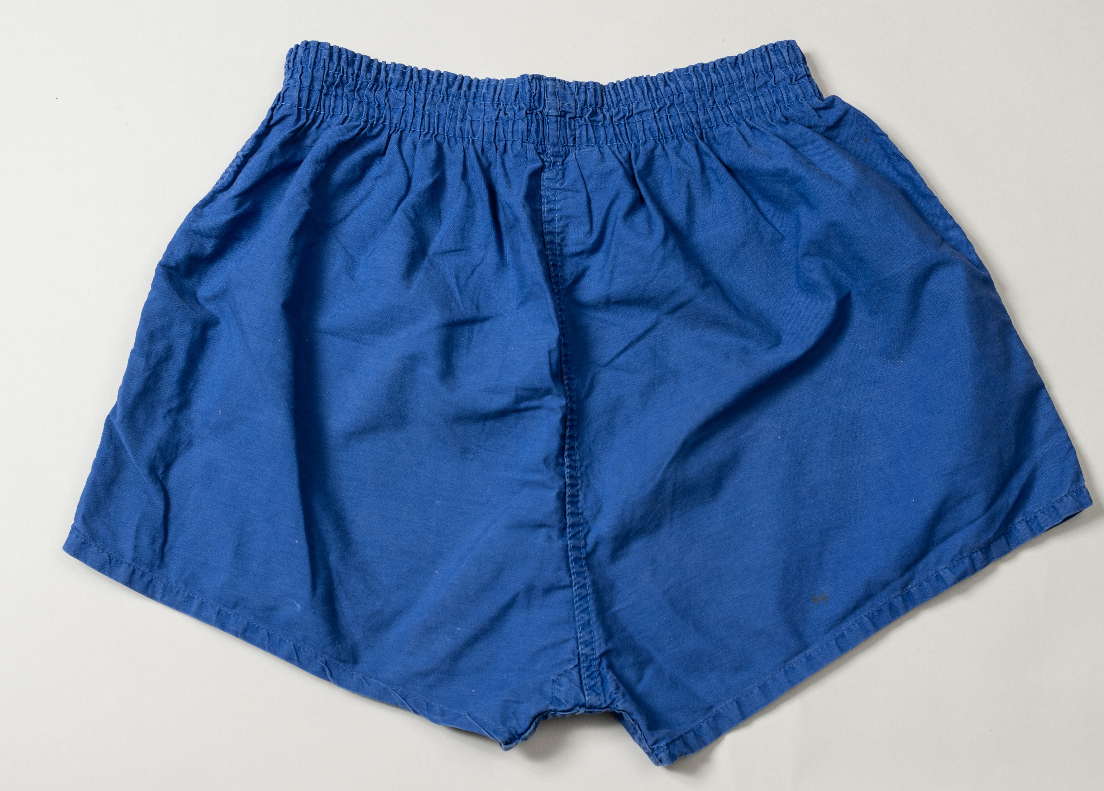 Pair of blue Nobby Stiles worn England shorts, with Umbro Stayput waist World Cup 1966 label, All Cotton 36/38" Tommie Hamilton came to Manchester from Edinburgh around 1960. He was a keen keep fit fanatic in his early years, always at the gym working out. it was there he met a few of the Scots who played for Manchester United. He decided to convert the cellar of his house into his own personal gymnasium. Some of Tommie's United pals started using his gym for weight training and he soon became good friends with some of them including Denis Law, Paddy Crerand and Jim Ryan. He helped a number of United players to fitness by introducing them to certain types of weight training. Manchester United that some players were doing something different and enquired into what that was. The club Manchester United got in contact with Tommie to ask about sending more players to him. Nobby Stiles, George Best and many others regularly went to Tommie' gym. Many of the players gifted him their kit which he treasured and remained friends with the players and Manchester United for many years