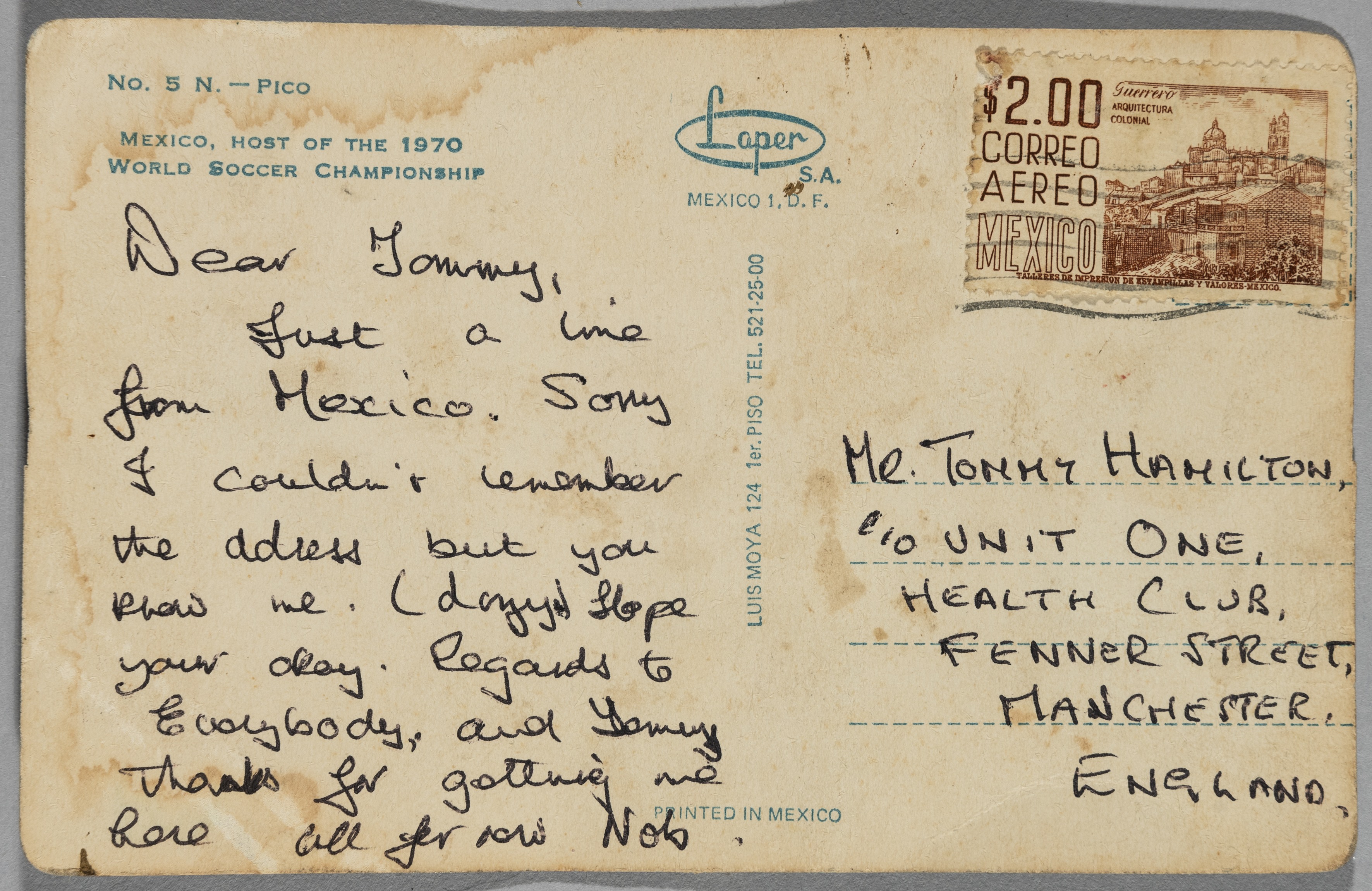 1970 Mexico World cup flock paper design No.5 N. Pico postcard sent from Nobby Stiles to friend Tommy Hamilton, which reads Dear Tommy, Just a line from Mexico. Sorry I couldn't remember the address but you know me. I do*** hope your okay. Regards to everyone and Tommy Thanks for getting me here all for now. Nob Tommie Hamilton came to Manchester from Edinburgh around 1960. He was a keen keep fit fanatic in his early years, always at the gym working out. it was there he met a few of the Scots who played for Manchester United. He decided to convert the cellar of his house into his own personal gymnasium. Some of Tommie's United pals started using his gym for weight training and he soon became good friends with some of them including Denis Law, Paddy Crerand and Jim Ryan. He helped a number of United players to fitness by introducing them to certain types of weight training. Manchester United that some players were doing something different and enquired into what that was. The club Manchester United got in contact with Tommie to ask about sending more players to him. Nobby Stiles, George Best and many others regularly went to Tommie' gym. Many of the players gifted him their kit which he treasured and remained friends with the players and Manchester United for many years