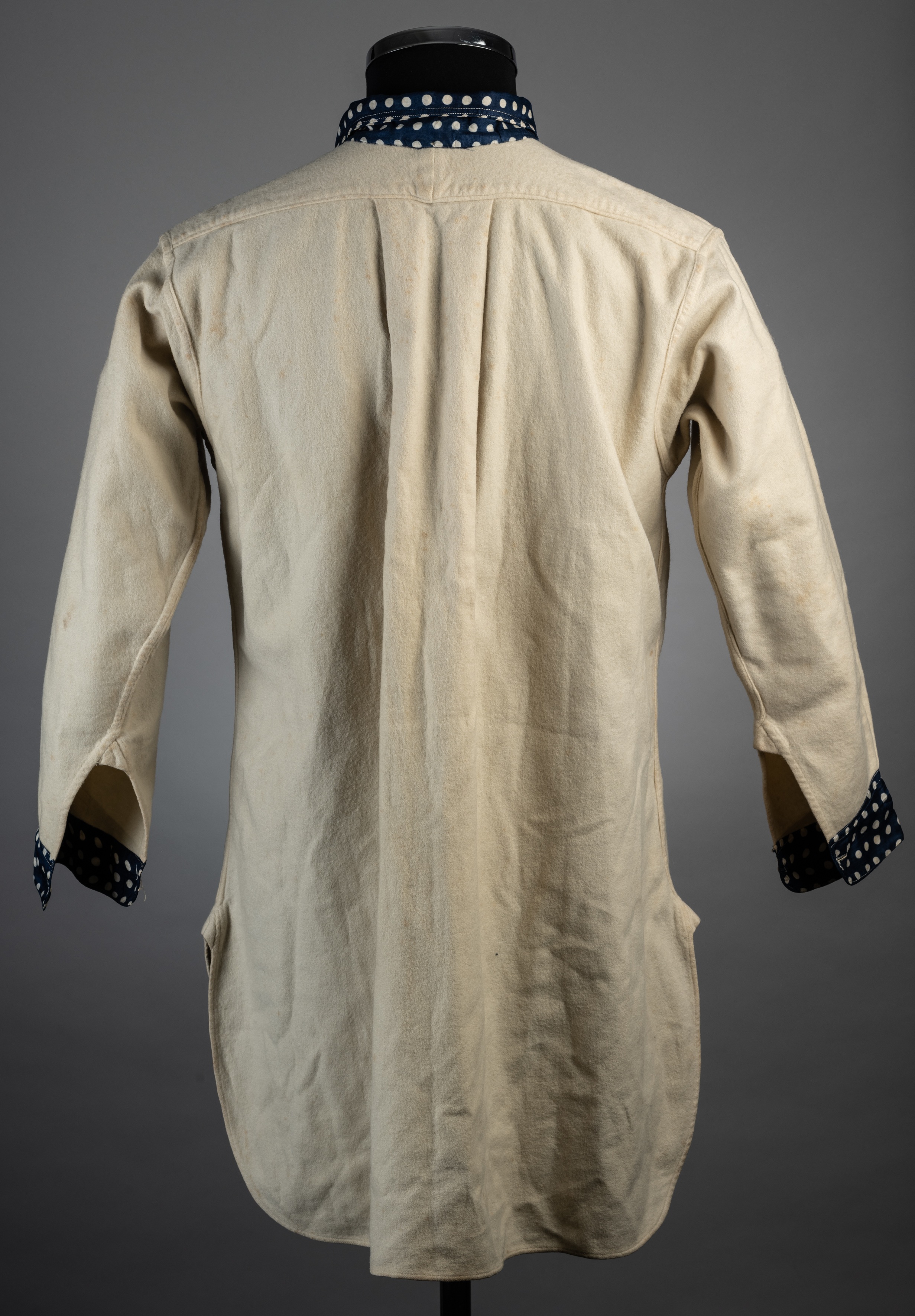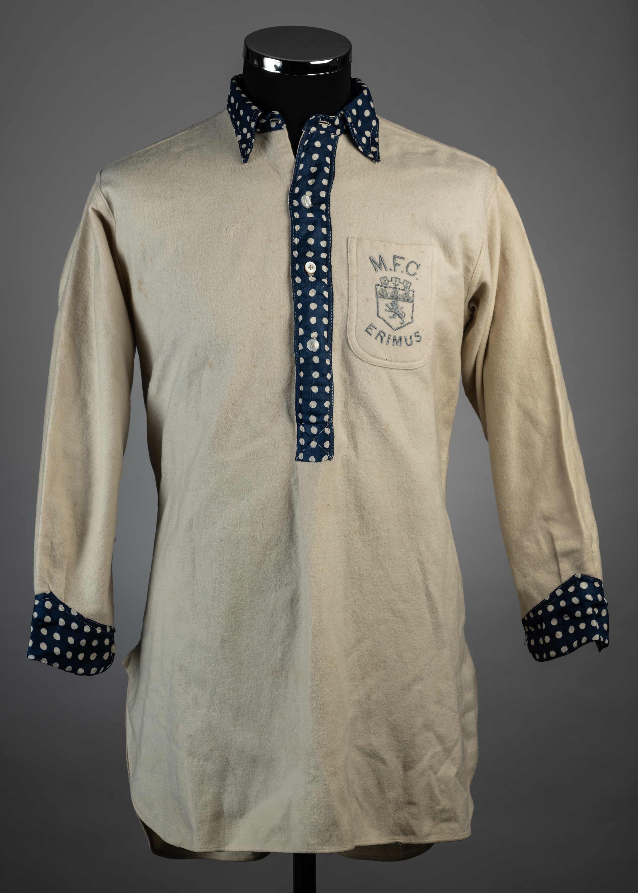 A rare and possibly unique Middlesbrough circa.1886-1890 match worn jersey, with button up collar and front with embroidered badge inscribed "M.F.C" ERIMUS, the cuffs are polka dot similar to the collar, heavy, white wool, manufactured by E. Banks, shirt maker Middlesboro. There is a little evidence of age related wear, the shirt shows areas of brown spotting all over, one L-shaped tear on right breast which has been repaired, no other holes or moth damage is apparent. Overall, for the age of the shirt it is in excellent condition. We would imagine that this is the oldest Middlesboro shirt that survives and possibly the oldest example of a shirt from a League club still in one piece. We believe that it dates from between 1886 and 1890, when they changed to a blue shirt, before another change back to white up to 1899 which is when they finally turned professional permanently and adopted more or less the red that they are famed for today. Born originally in 1876, the Northeast Club had tried three other fetching colour combinations before this fine piece saw the light if day. I find it fascinating that this actually bears a badge beautifully embroidered on the breast pocket with the MFC logo, so I would also imagine that the shirt could have held some special significance to either Club or player. The trim is exceptional, a blue and white polka dot round the collar and buttons to complement the light blue needlework on the badge and made from flannelette like some Victorian dress shirt which, without the badge it could well be mistaken for.