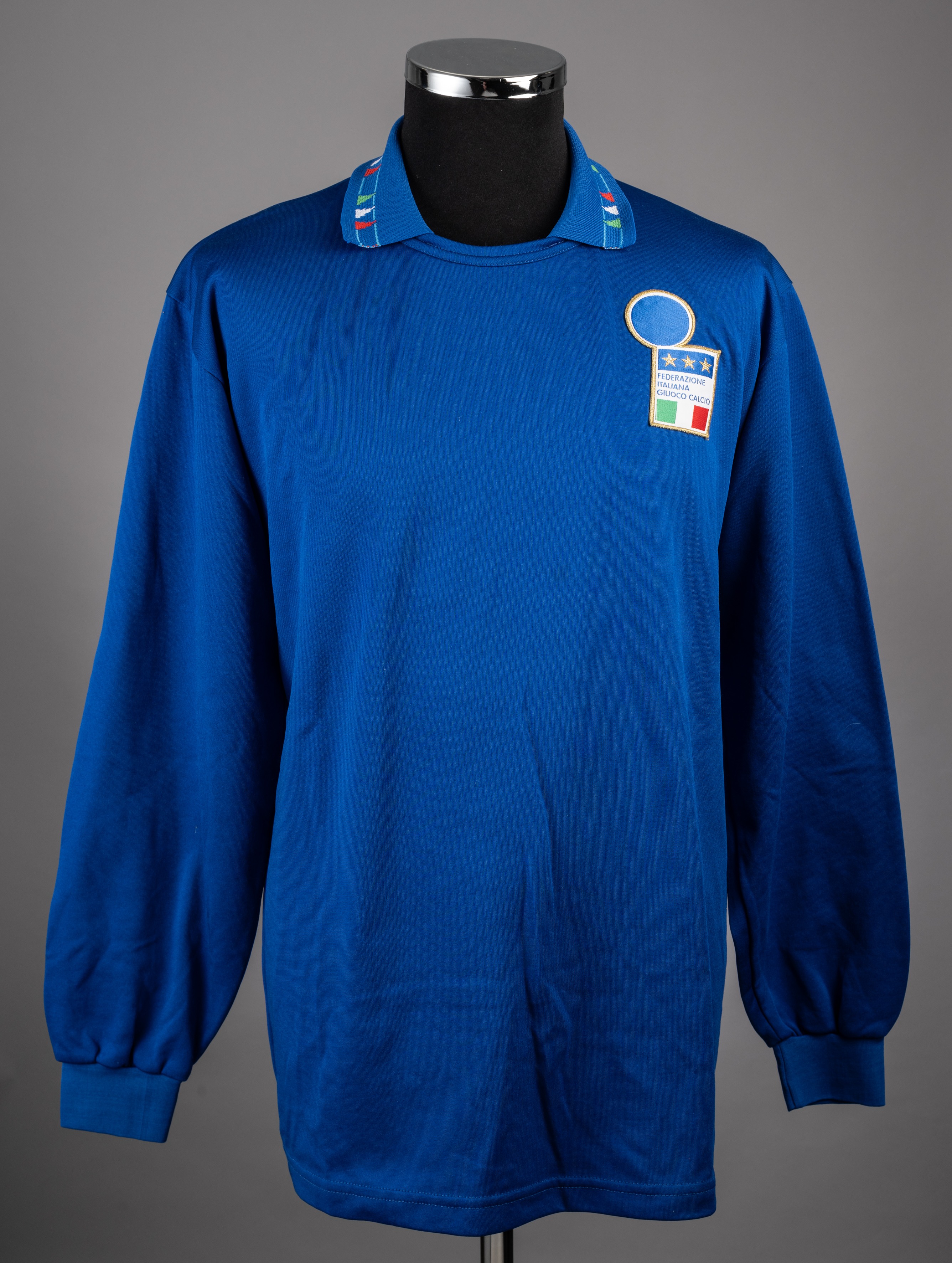 Paolo Maldini blue No.3 Italy long-sleeved jersey, Diadora, L, with crew-neck collar and embroidered cloth badge inscribed FEDERAZIONE ITALIANA GIUOOCO CALCIO