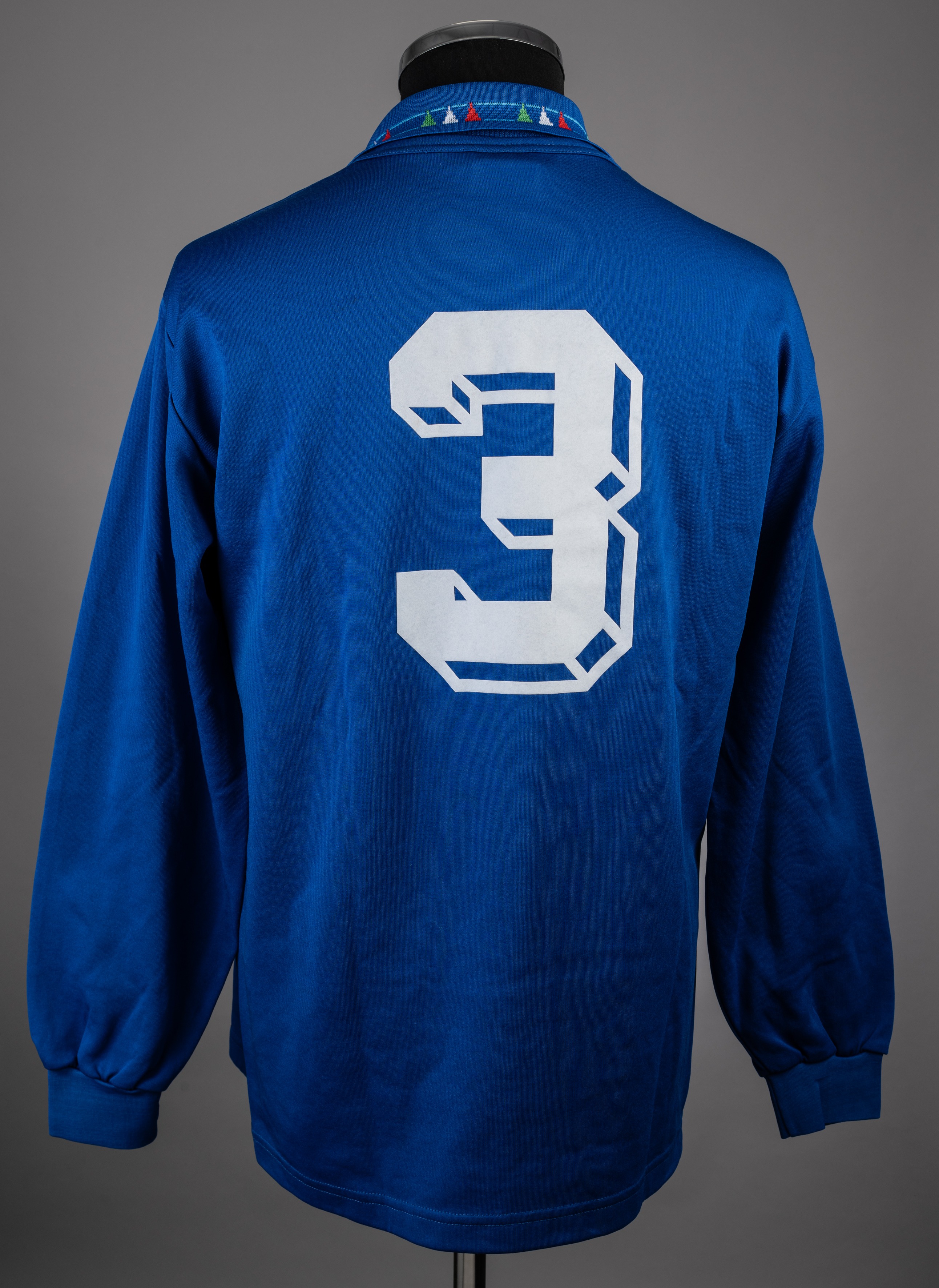 Paolo Maldini blue No.3 Italy long-sleeved jersey, Diadora, L, with crew-neck collar and embroidered cloth badge inscribed FEDERAZIONE ITALIANA GIUO