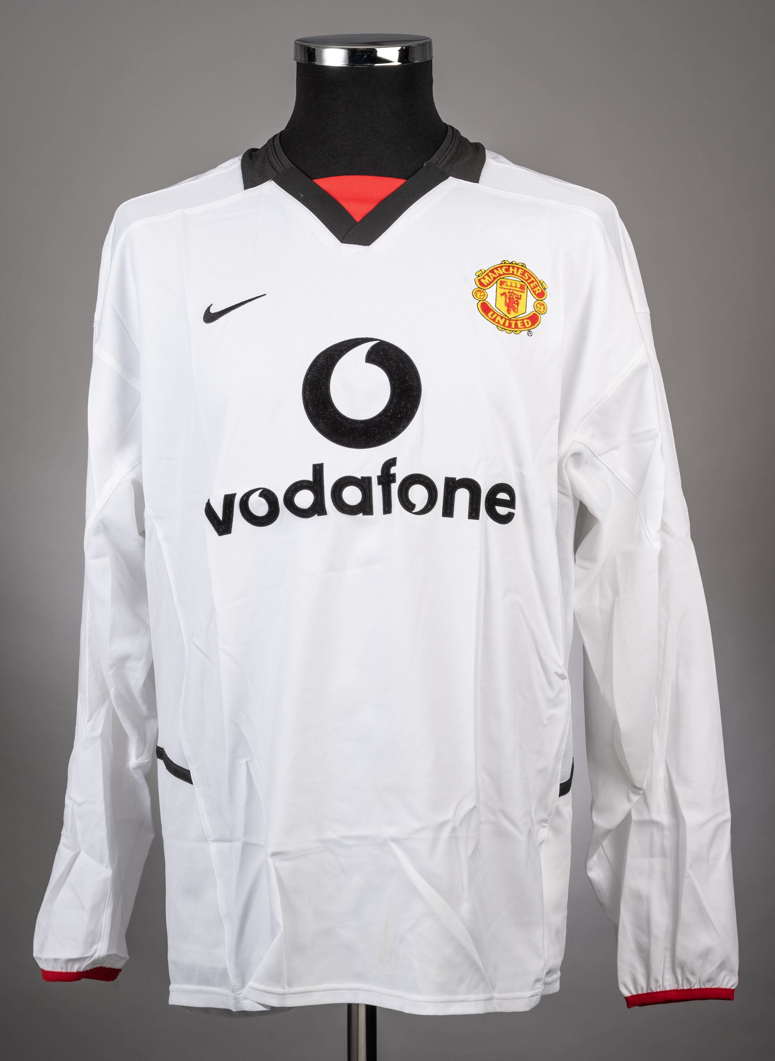 Paul Scholes white Manchester United no.18 jersey season from the 2002-03 Champions League campaign. Game unspecified, Squad issued Nike long sleeved example with the Champions League badge on the right arm. The front has the Club crest and also the VODOPHONE". The back is lettered SCHOLES and bears the number 18. It is long sleeved and displays the Champions League flash on the right, and is white with black trim. The front features the embroidered club badge and the "VODAPHONE" sponsor logo. It is manufactured by Adidas. The condition is excellent Manchester United got through to the quarter final stage of the Champions League, eventually going out to Real Madrid. Scholes played an incredible 46 times for the Red Devils in all competitions that season, scoring 20 goals.