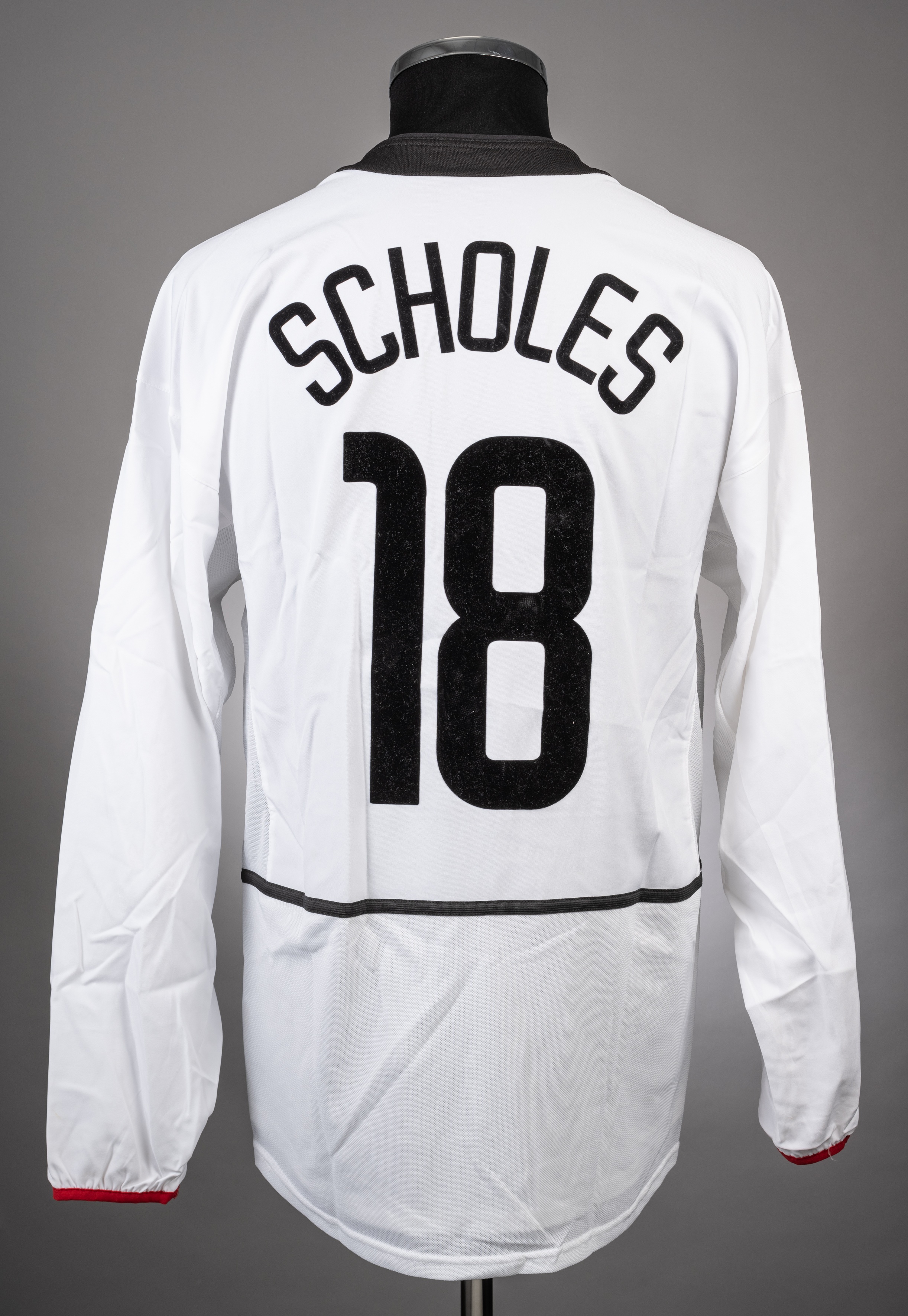 Paul Scholes white Manchester United no.18 jersey season from the 2002-03 Champions League campaign. Game unspecified, Squad issued Nike long sleeved