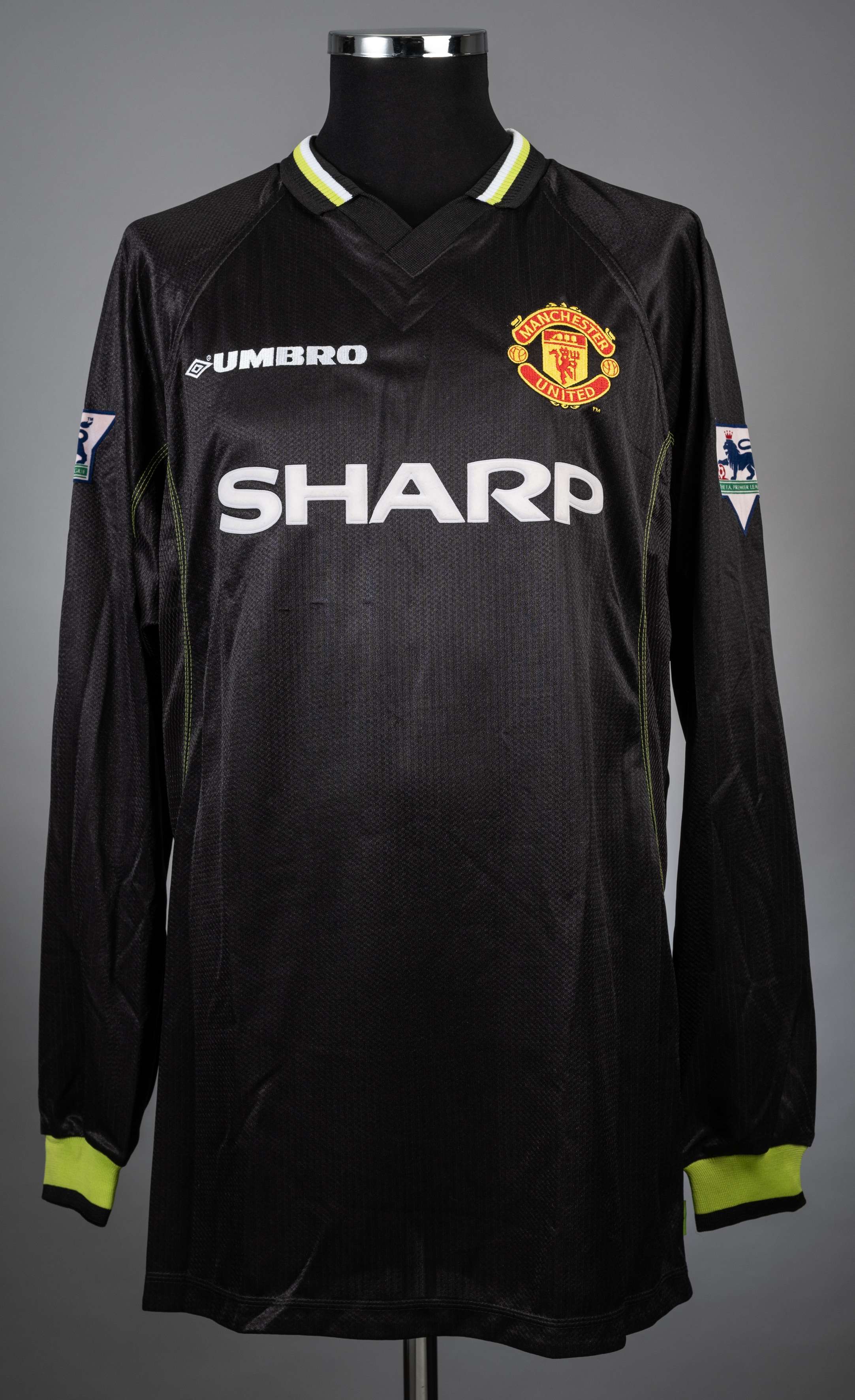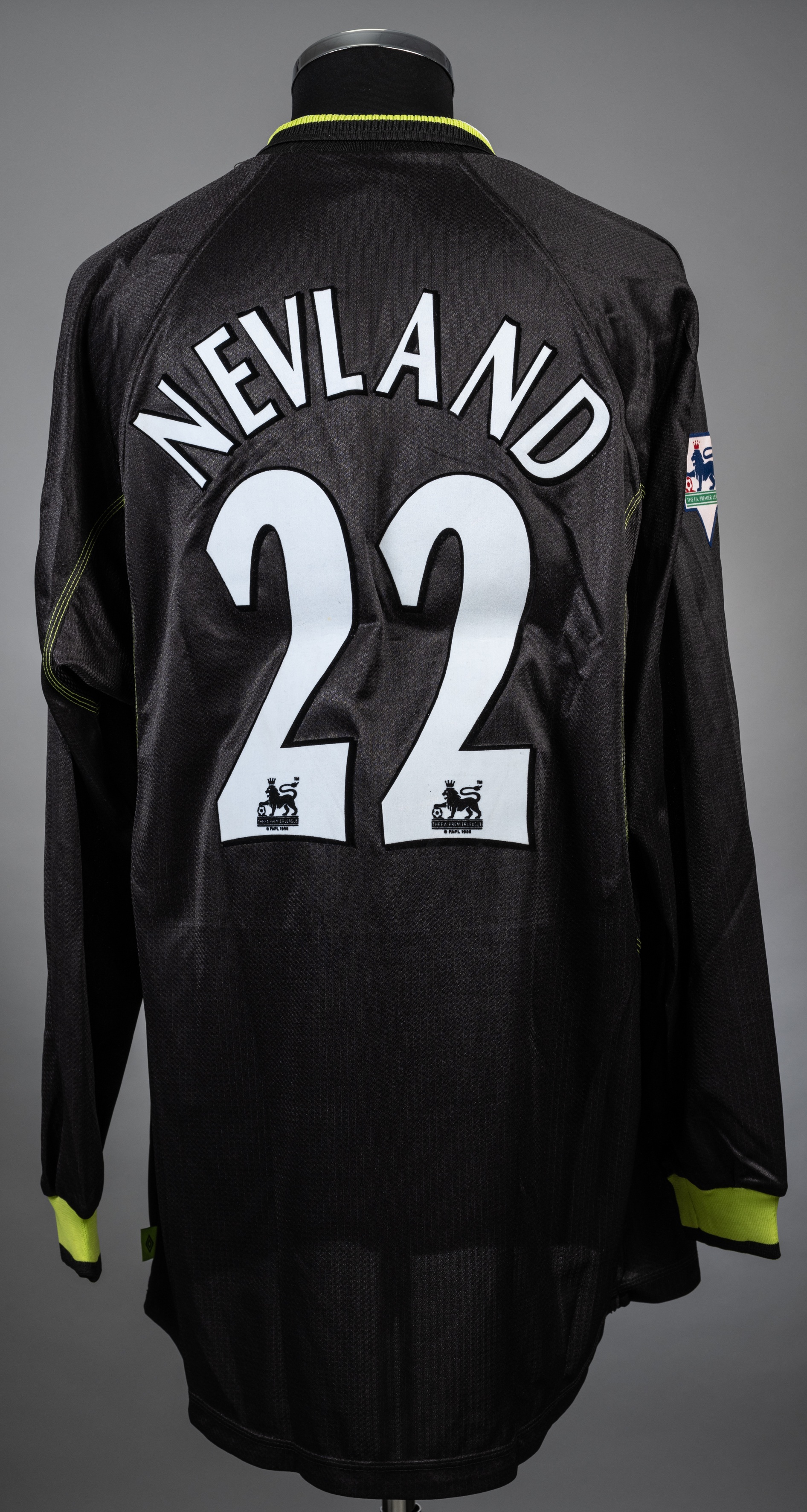 Erik Nevland black Manchester United 3rd choice jersey from the season 1998-99, There is no game specified. Player issue Adidas Long sleeved example with Barclays Premier League badges on both arms. The front has the Club crest and also the SHARP sponsor logo. The back is lettered NEVLAND and bears the no.22. There is no evidence of match wear and the jersey is in excellent condition. Following a baron season previously, Manchester United won a historic treble in this campaign, lifting the League title, FA Cup and UEFA Champions League, a feat often regarded as fans as Sir Alex Ferguson's greatest achievement. He was awarded a knighthood for services to football and was made a freeman of his home City of Glasgow. David Beckham was UEFA Club footballer of the year and runner up to Rivaldo in the Ballon d'Or and FIFA world player of the year awards. The kit was voted their greatest Manchester United 3rd kit ever.
