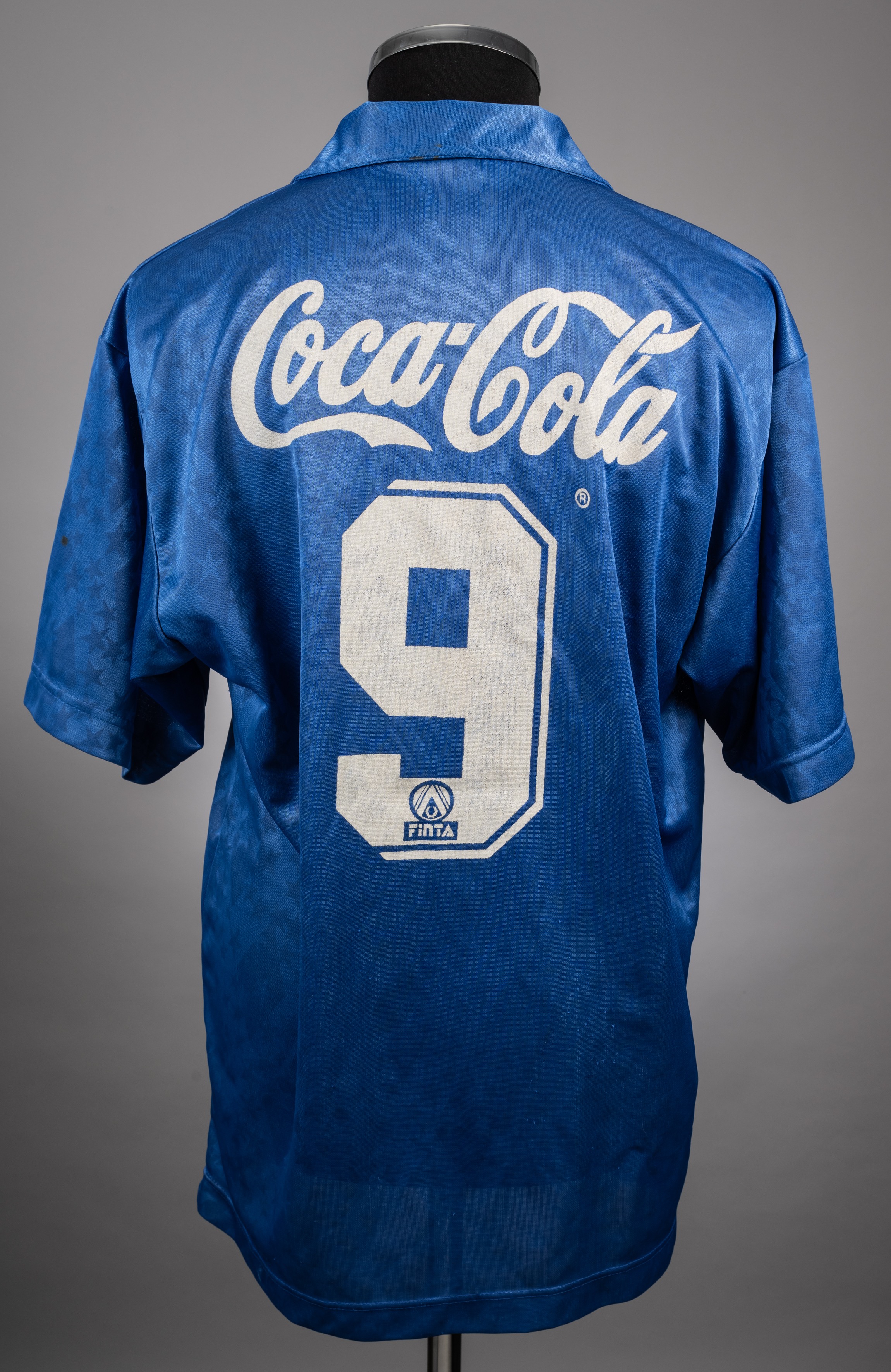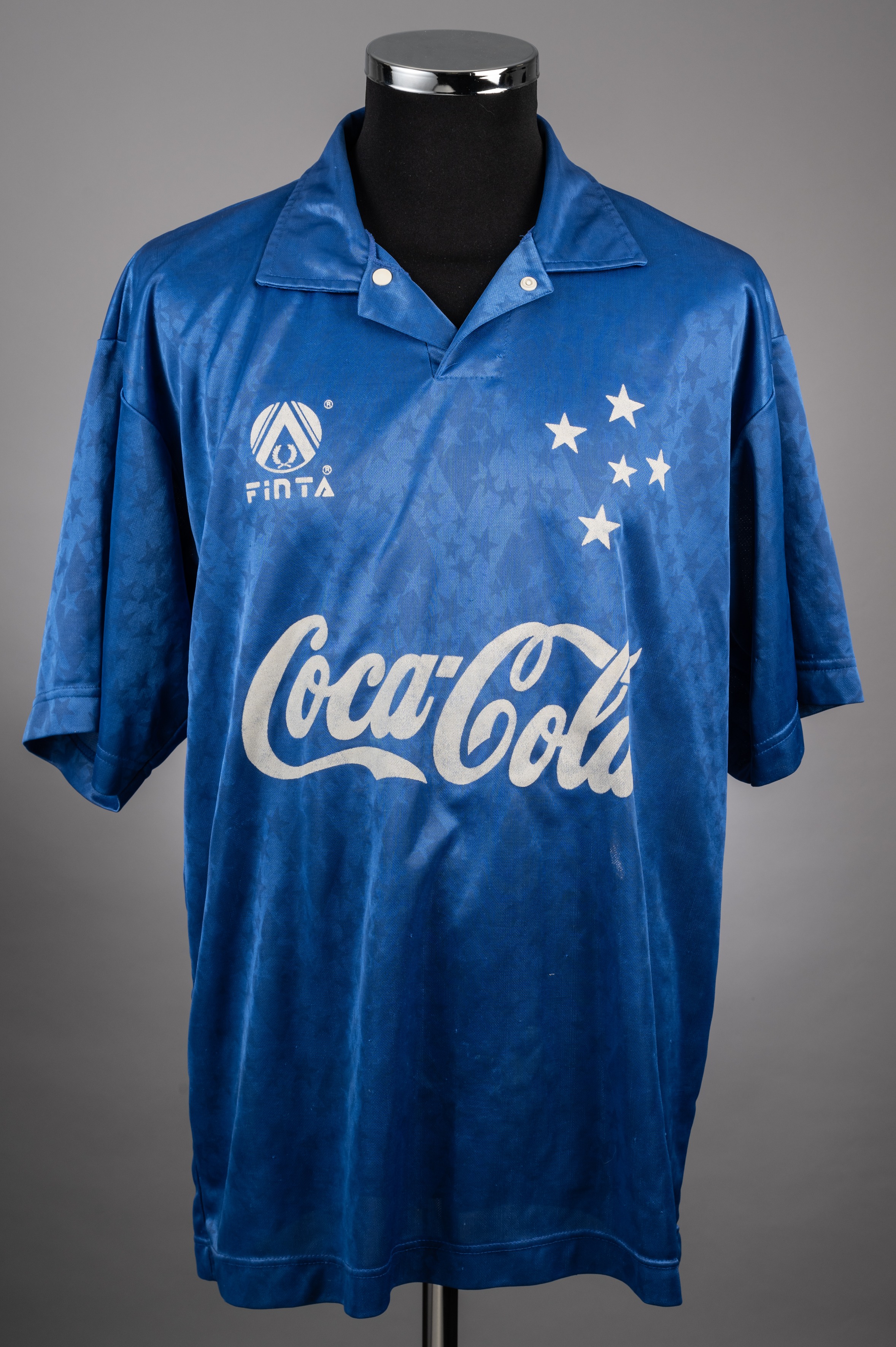 Ronaldo blue No.9 Cruzeiro v. Boca Juniors match worn 1994 Copa Libertadores short-sleeve jersey, Finta, with button-up collar and printed badge The jersey was worn by Ronaldo in the 1994 Copa Libertadores 6th Round Group 2 match against Boca Juniors played on 6th April 1994 in Belho Horizonte and gained as swap after the match Provenance: Racing Club Museum