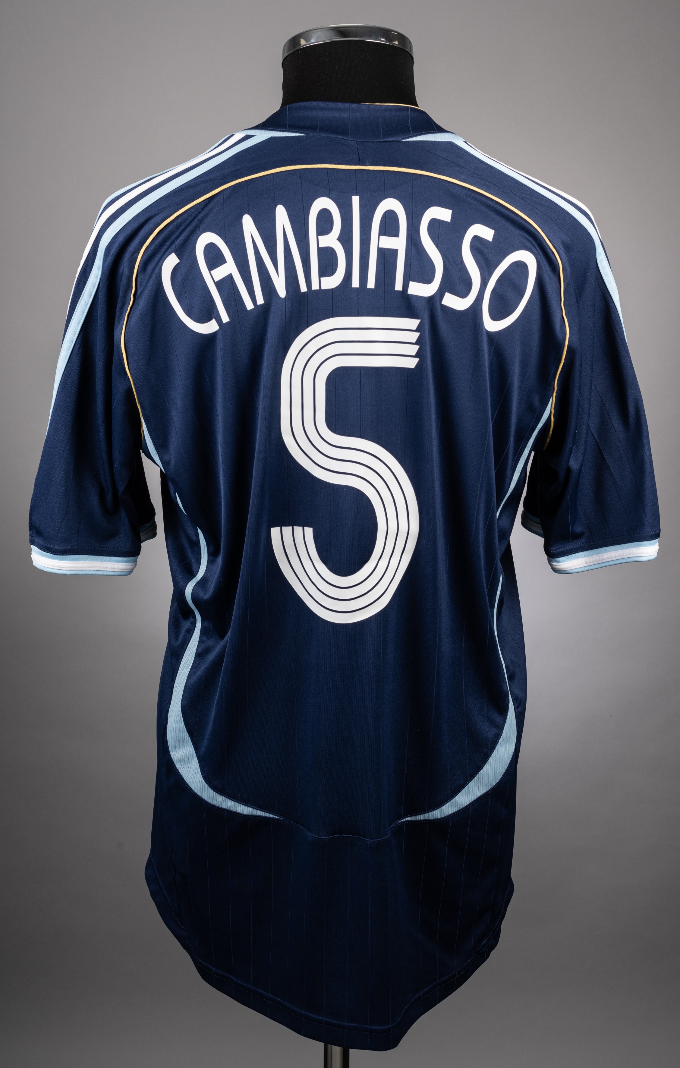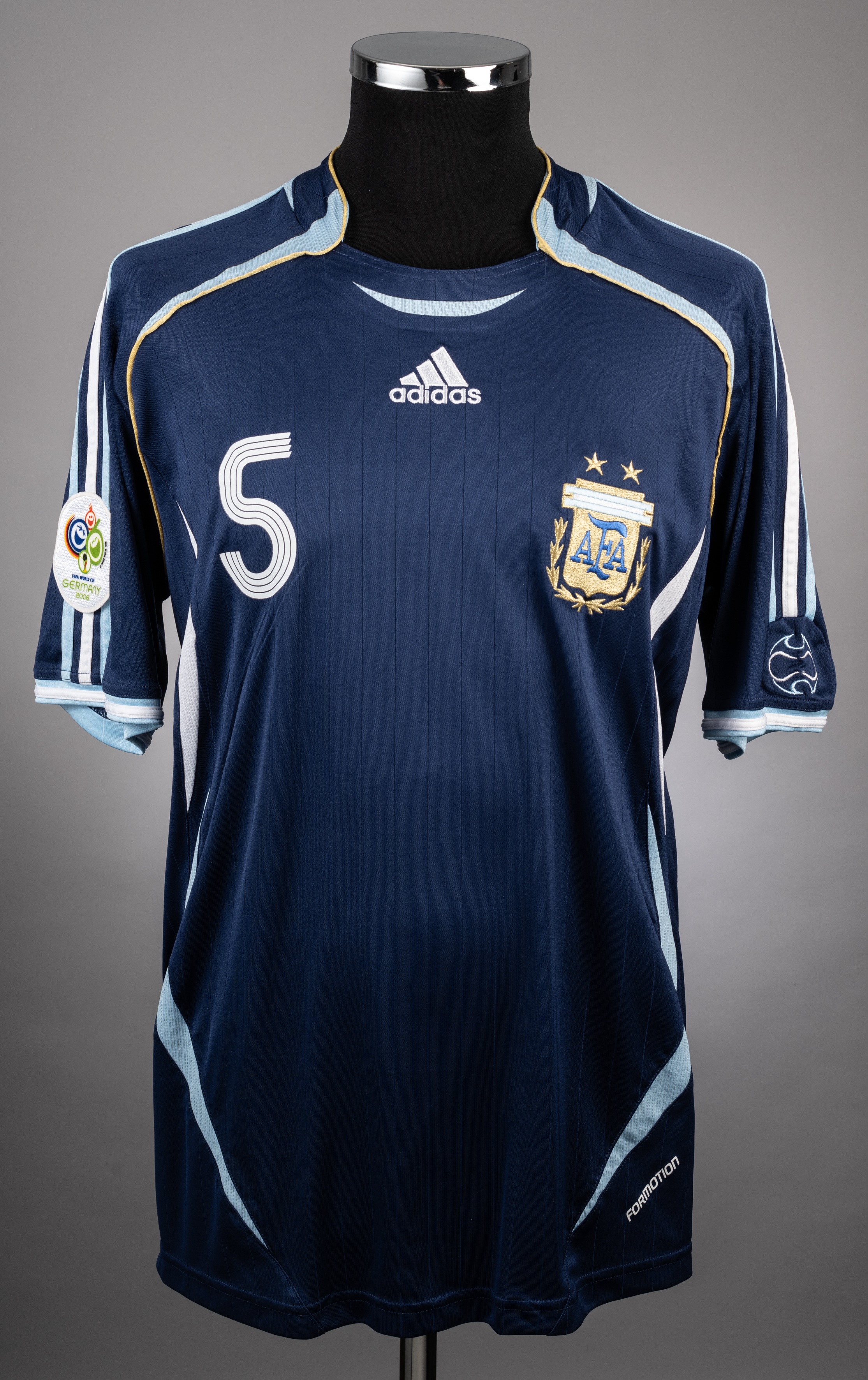 Esteban Cambiasso blue No.5 Argentina v. Serbia & Montenegro 2006 World Cup short-sleeve jersey, Adidas, L, with crew-neck collar and embroidered badge inscribed AFA, the reverse lettered Cambiasso, the right sleeve with FIFA World Cup Germany 2006 flash The jersey was worn by Cambiassio in the 2006 World Cup Group C match against Serbia & Montenegro, played on the 16th June in Gelsenkirchen, Argentina defeated Serbia & Montenegro 6-0, Cambiasso scoring in the 31st minute Provenance: Racing Club Museum
