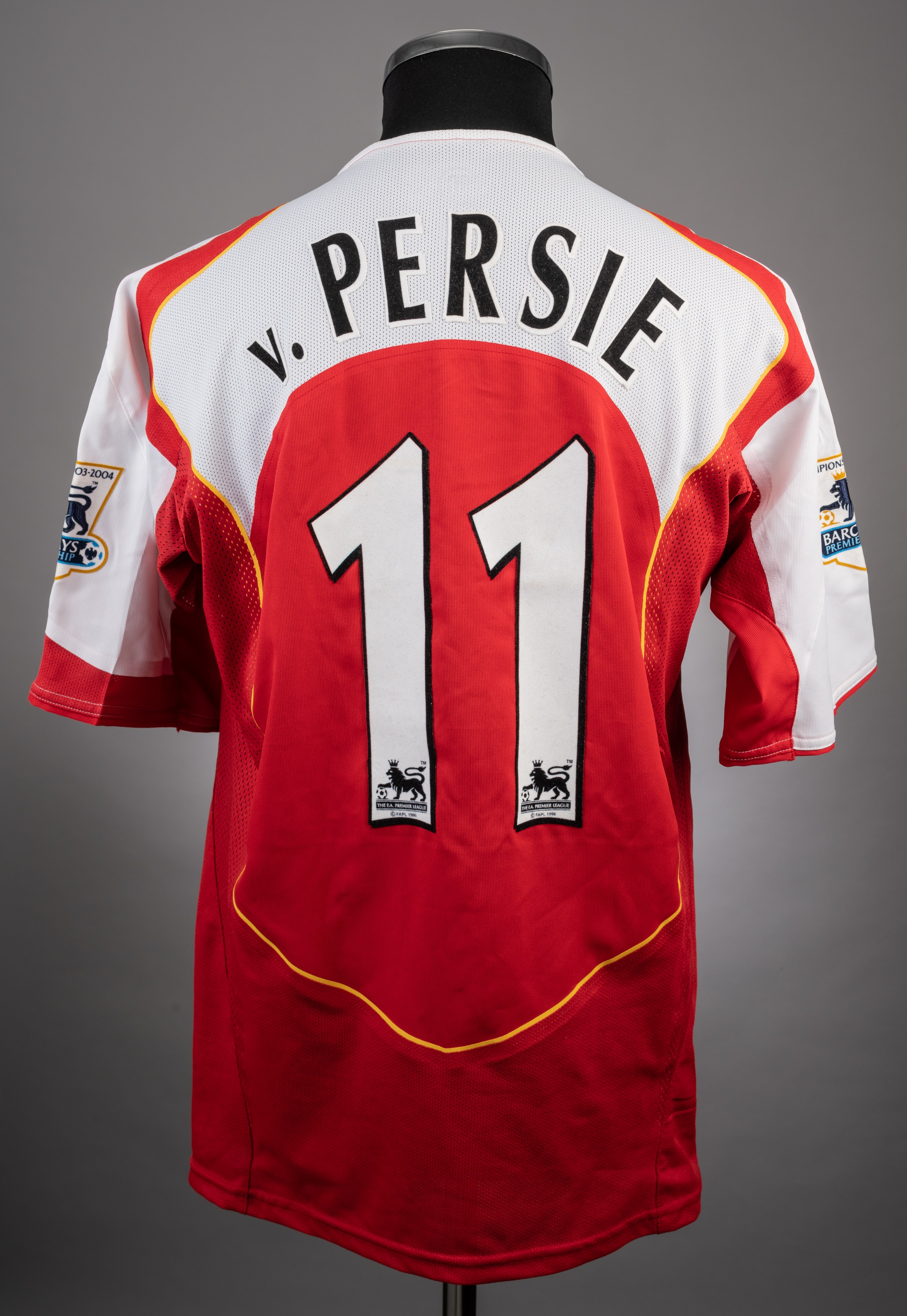 Robin van Persie red & white Arsenal No.11 jersey from the infamous Keane v Vieira tunnel incident match v Manchester United, played at Highbury, 1st February 2005, Nike, size L, short-sleeved with BARCLAYS PREMIERSHIP CHAMPIONS 2003-2004 sleeve badges, STAND UP SPEAK UP badge worn uniquely for this match, club crest and sponsor logo, reverse lettered v. PERSIE Manchester United defeated Arsenal 4-2. This fixture became famous due to the pre-match tunnel bust up between Patrick Vieira and Roy Keane. Robin van Persie was an unused substitute in this match. Provenance: Graham Budd Auctions, 18th May 2015, lot 515.
