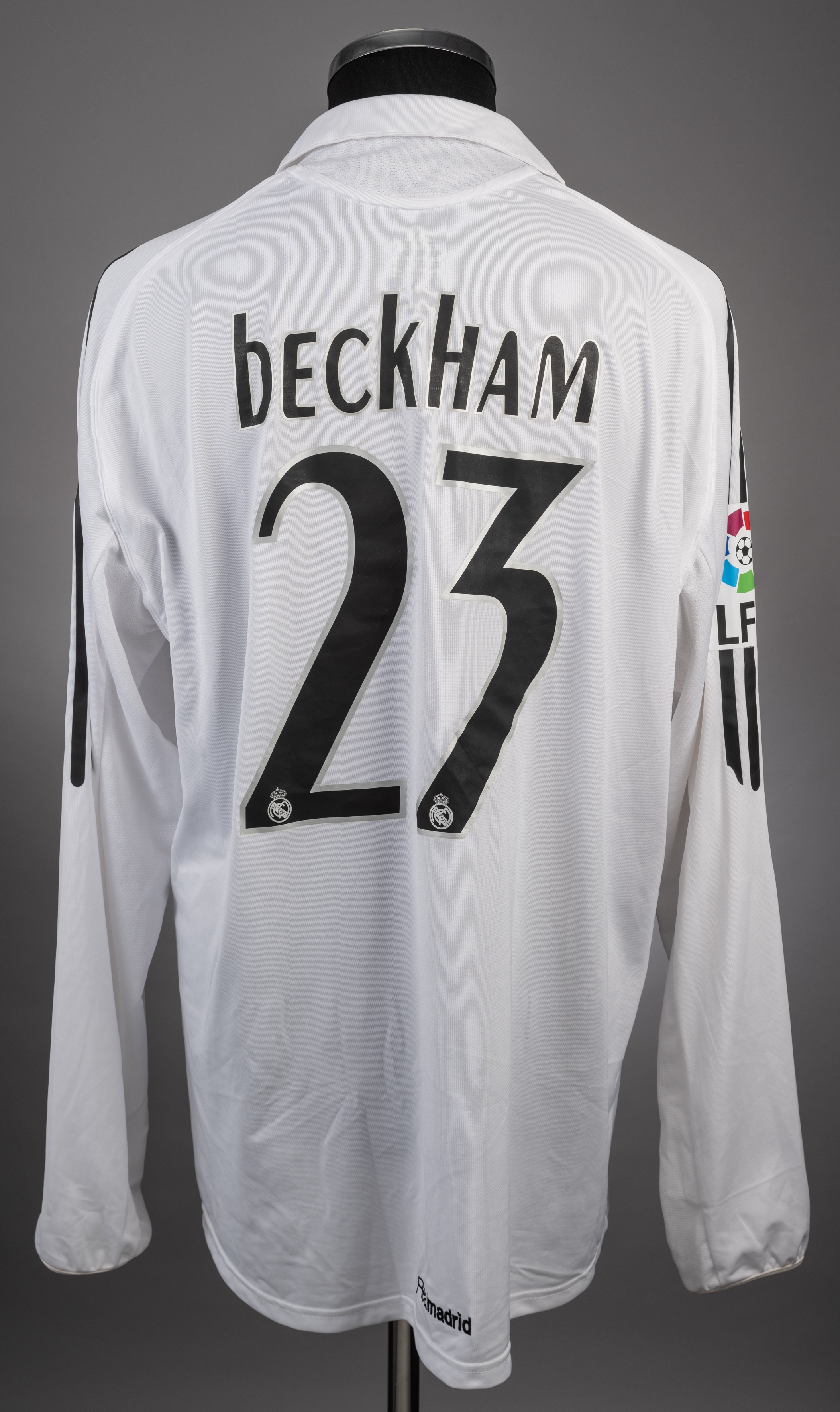 David Beckham white Real Madrid No.23 jersey, inscribed beneath club crest ZIDANE 2001-2006, long-sleeved, LFP badge to right sleeve, the reverse lettered BECKHAM
