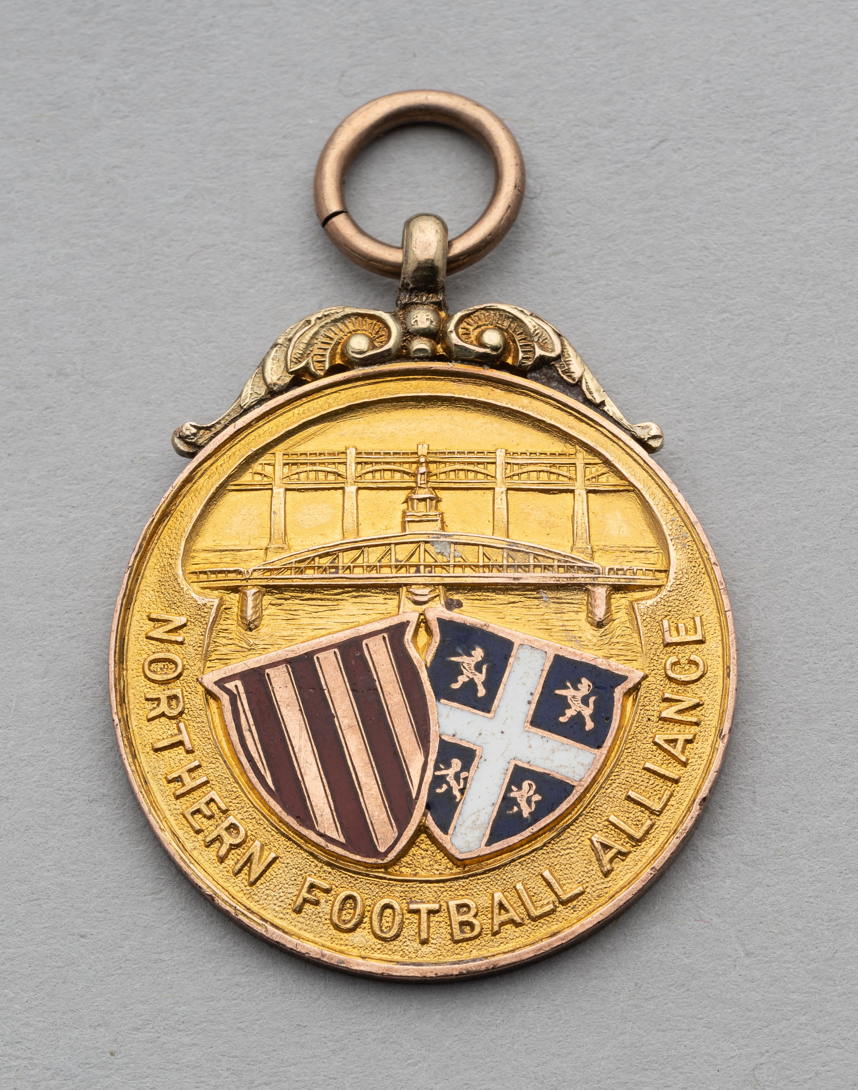 9ct gold & enamel Northern Football Alliance medal in season 1913-14, undated but with gold date letter for 1913-14, weight 10gms., reverse engraved