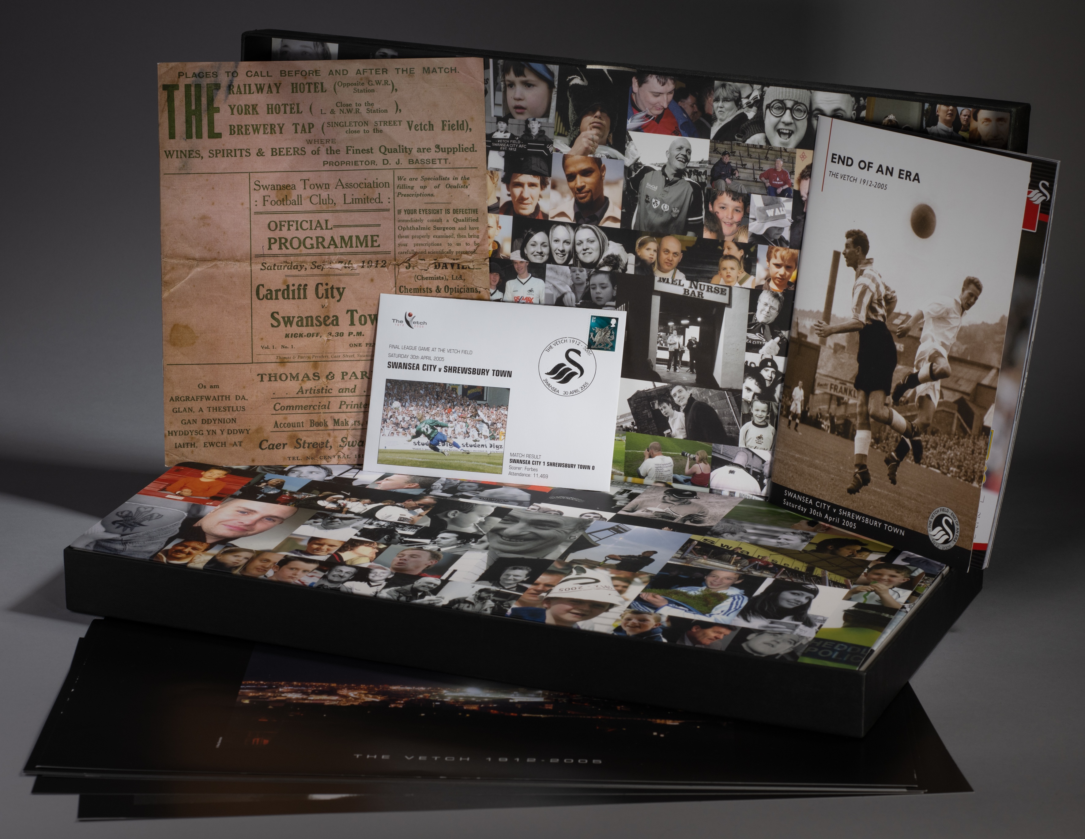 A rare Swansea City AFC- "The Vetch 1912-2005" commemorative Limited edition Box Set no.871, a superb collection memories charting Swansea City's life and times at their former stadium, The Vetch Field. the set comprises of a large reproduction of the first game there played against Cardiff City in 1912, a first day cover depicting the final game there against Shrewsbury Town on April 30th 2005, the final match programme, a book discussing their final season there alongside "A People's History of the Vetch Field", a fine collection of DVD's relating to the fans, the stadium and also a virtual tour of the now lost venue. There is also a woodcut from the ground post demolition depiction a game being played there. The set is beautifully boxed, presented and is no. 871 from a limited edition of 1000 pieces and in excellent condition.
