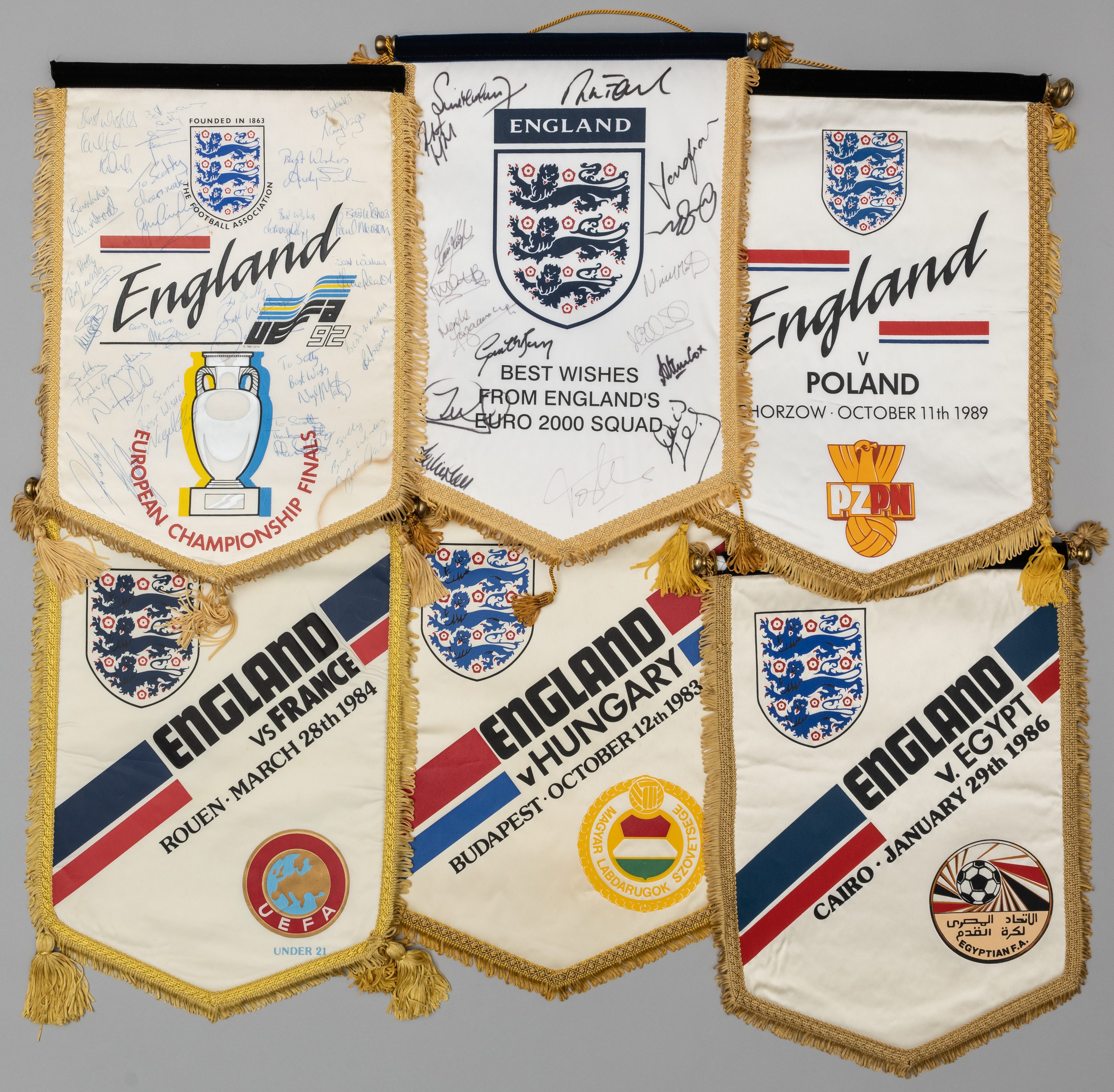 England Euro 92 pennant bearing numerous players autographs, the majority dedicated to Scotty including Alan Ball, Paul Merson, Chris Woods, Andy Smith etc and twelve other various England related pennants (13)