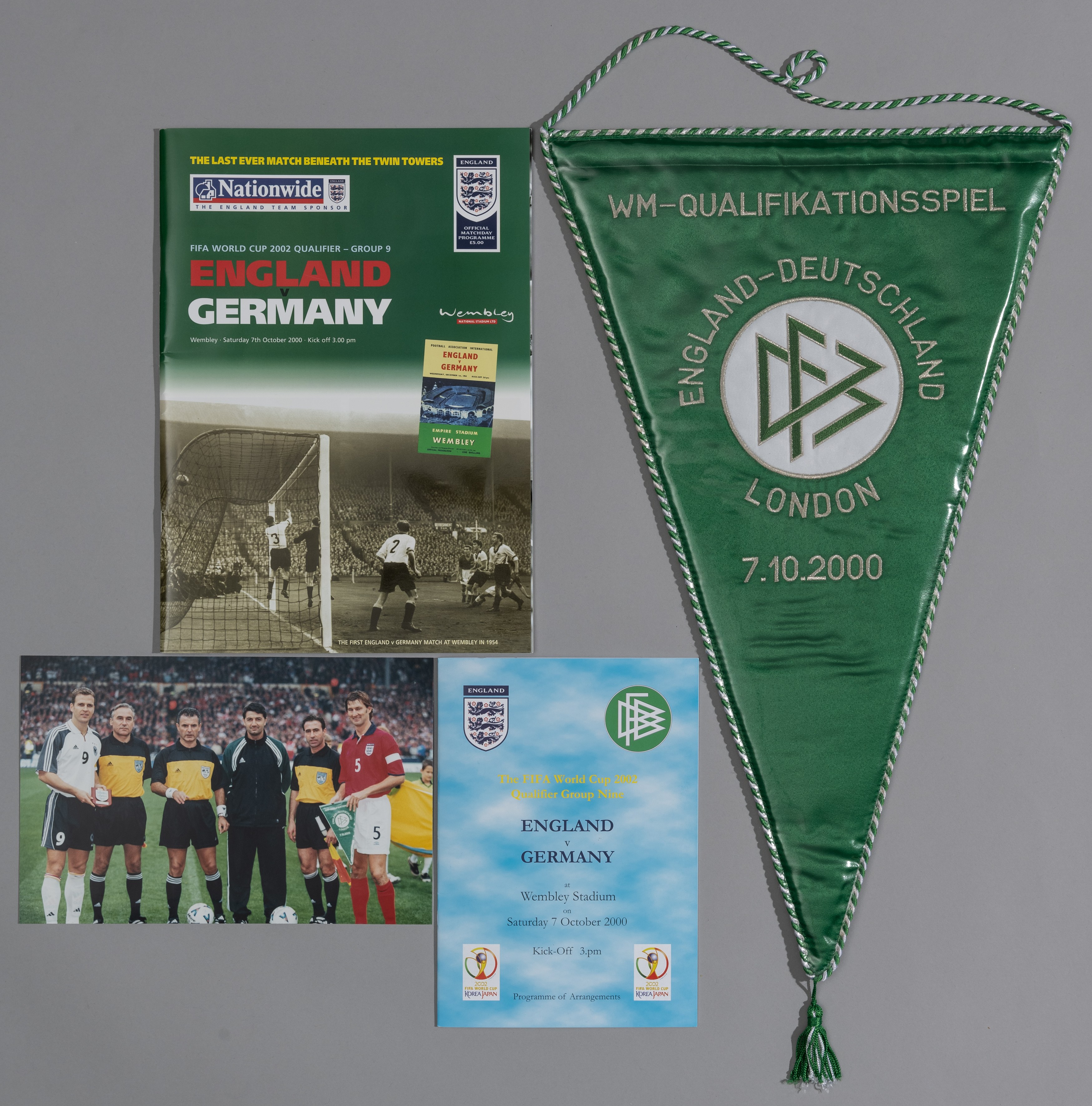 Last match at old Wembley pennant presented by Oliver Bierhoff to Tony Adams October 7th 2000, prior to the game at Wembley Stadium on October 7th 2000, along with the Official programme of arrangements for the game and a copy of the match programme and a colour photograph of the Captains and match officials prior to kick off, (4) The collection is in excellent condition