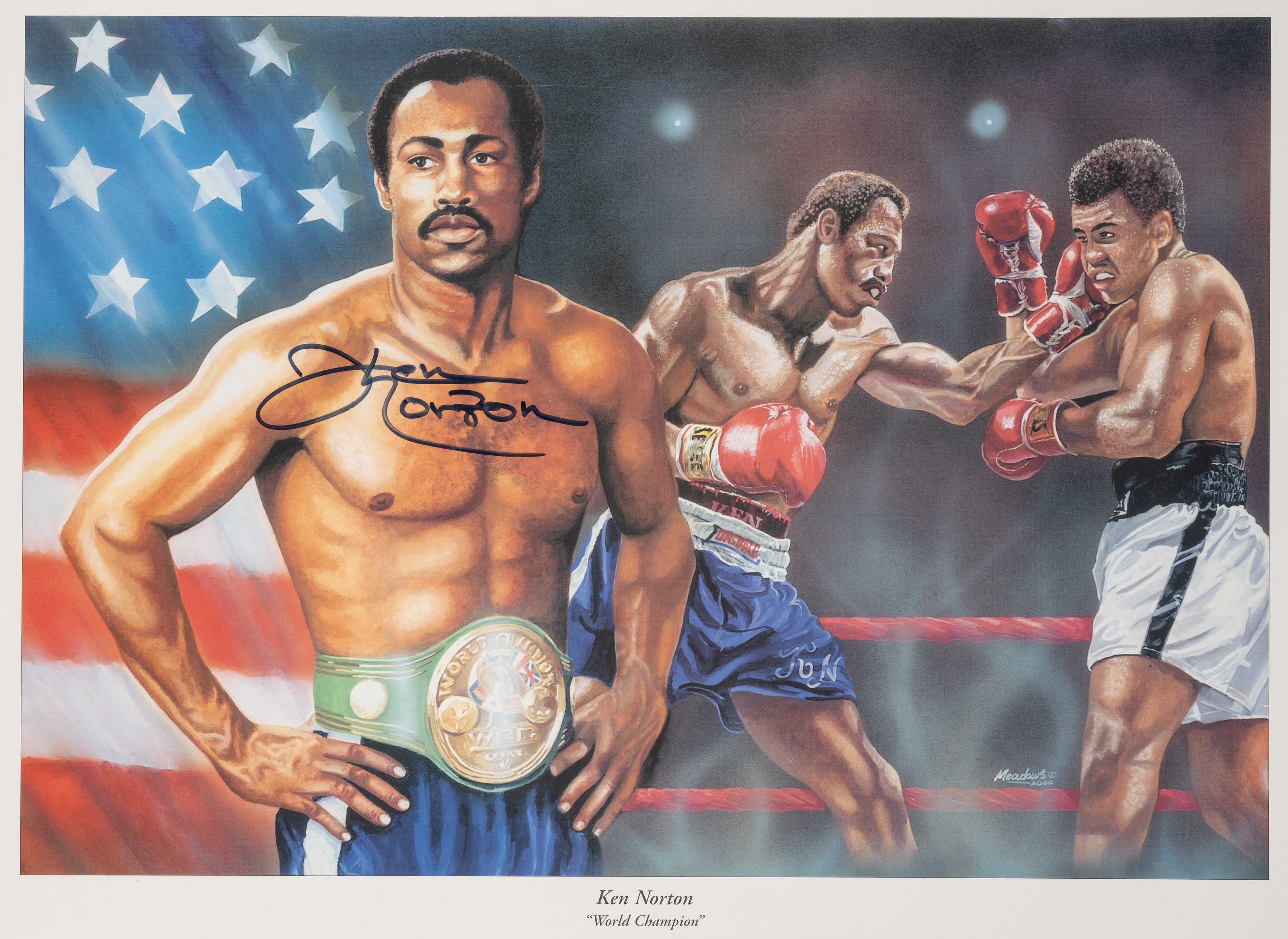 Ken Norton signed boxing print, the artwork by Meadows and dated 2000, depicting Norton in action v Muhammad Ali, and a portrait of Norton wearing hi