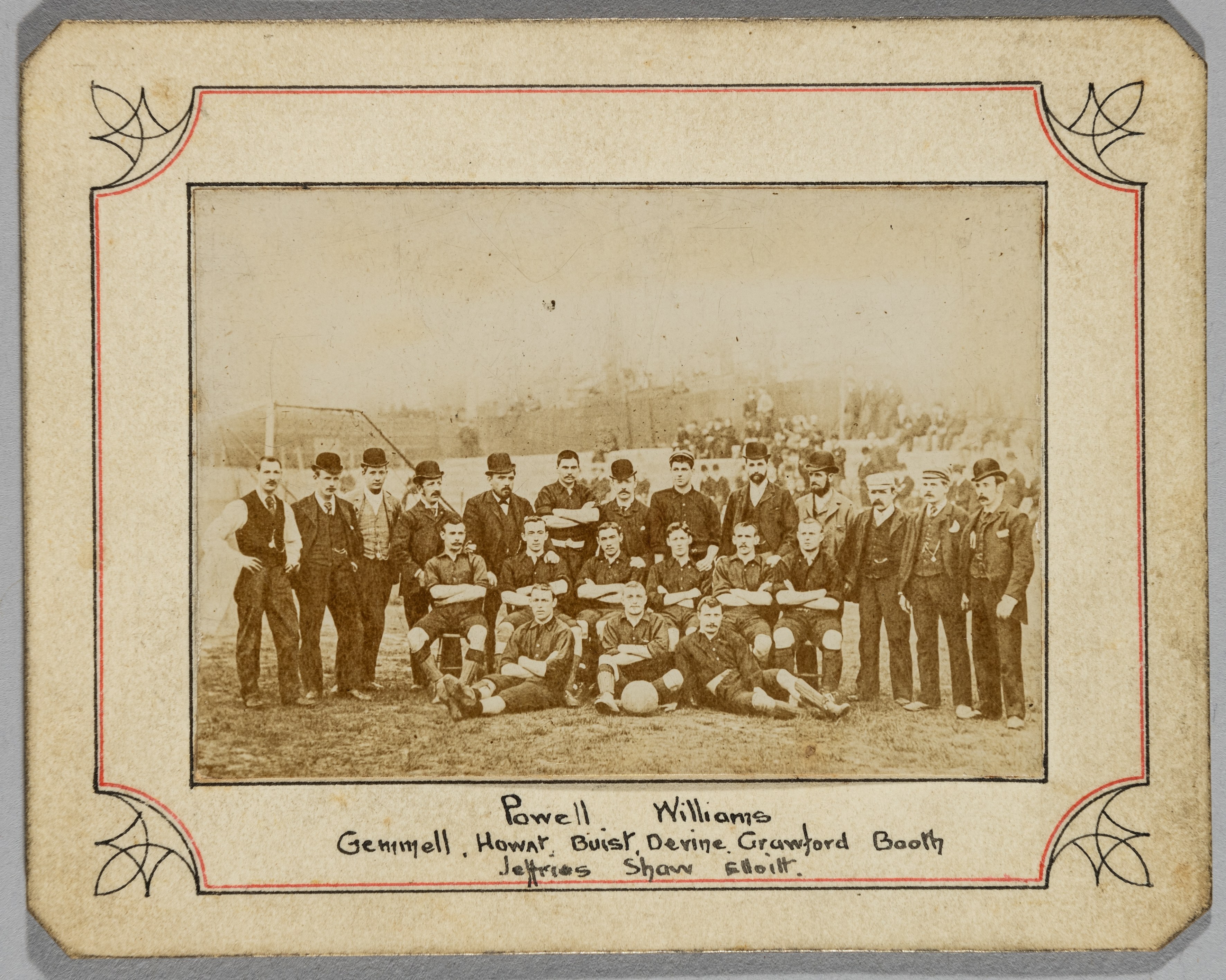 Very scarce photograph of the Woolwich Arsenal team from their first season in the Football League in 1893-94, photographed at the Manor Ground, Plumstead, sepia-toned 5 by 7cm., matted, hand written identification of players, Powell, Williams, Gemmell, Howat, Buist, Devine, Crawford, Booth, Jeffries [sic] Shaw and Elliott, overall 8 by 9.5cm., very good condition Provenance: Christie's Scotland, Football Memorabilia, 20th November 1996, Lot 327 It has been suggested that the image was prior to the match against Stoke on 29th April 1893 which was the last game that the club played under Royal Arsenal. It also features in the 1893-94 Woolwich & District Football Handbook.