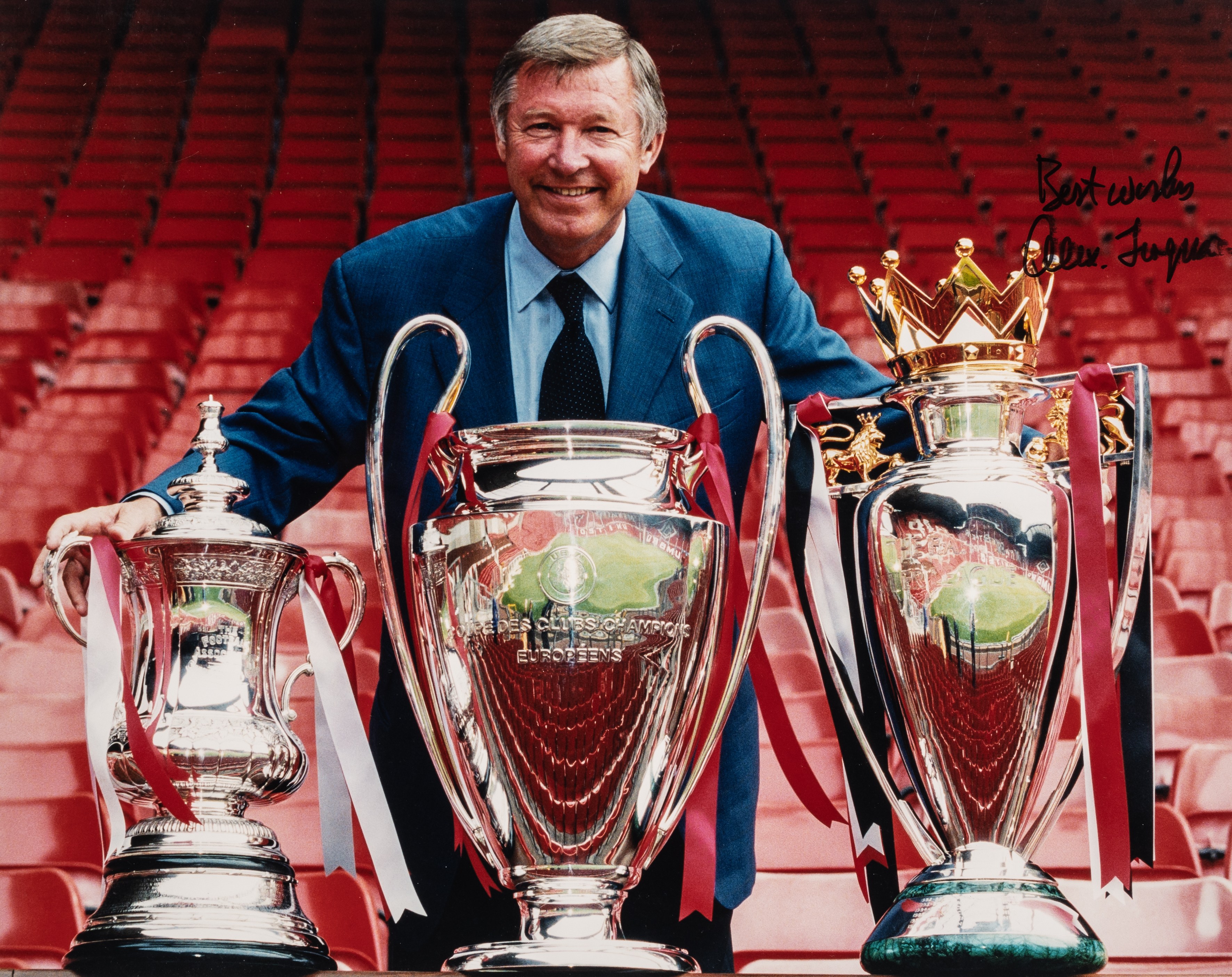Manchester United "Treble" an autographed colour photograph of Sir Alex Ferguson, with all three trophies, 22.5 by 26.5in. framed and glazed All glass will be removed from framed and glazed items prior to posting and may result in delays to shipping your items. (This service is included in the cost of postage and packing). We can also totally remove all framing and mounts upon request to reduce shipping costs. Alternatively, lots can be collected in person by prior appointment from NN8 1RT.