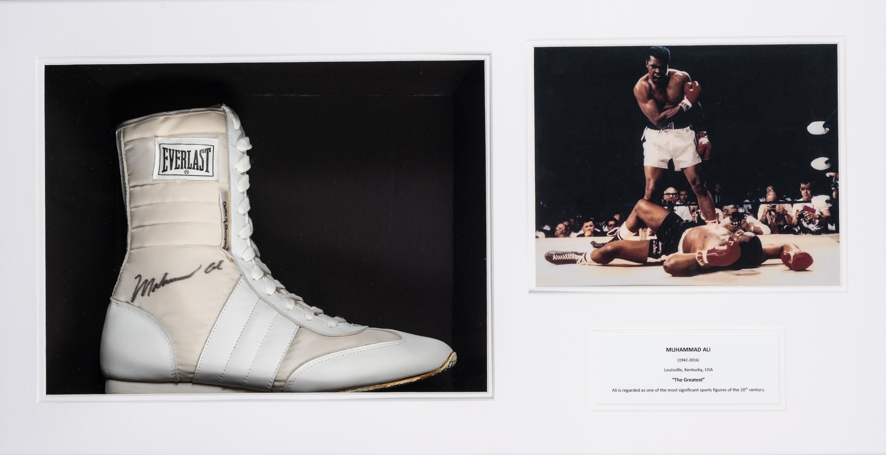 Muhammad Ali signed right boxing boot mounted in a display case, the Everlast 'Choice of champions' cream canvas and white leather right boot signed with black marker pen, flanked by 19 by 24cm. colour photograph of Ali v Frazier bout, above typed legend, mounted in a box glazed frame, overall 46 by 81 by 14cm., reverse bearing Rare Memorabilia COA All glass will be removed from framed and glazed items prior to posting and may result in delays to shipping your items. (This service is included in the cost of postage and packing). We can also totally remove all framing and mounts upon request to reduce shipping costs. Alternatively, lots can be collected in person by prior appointment from NN8 1RT.