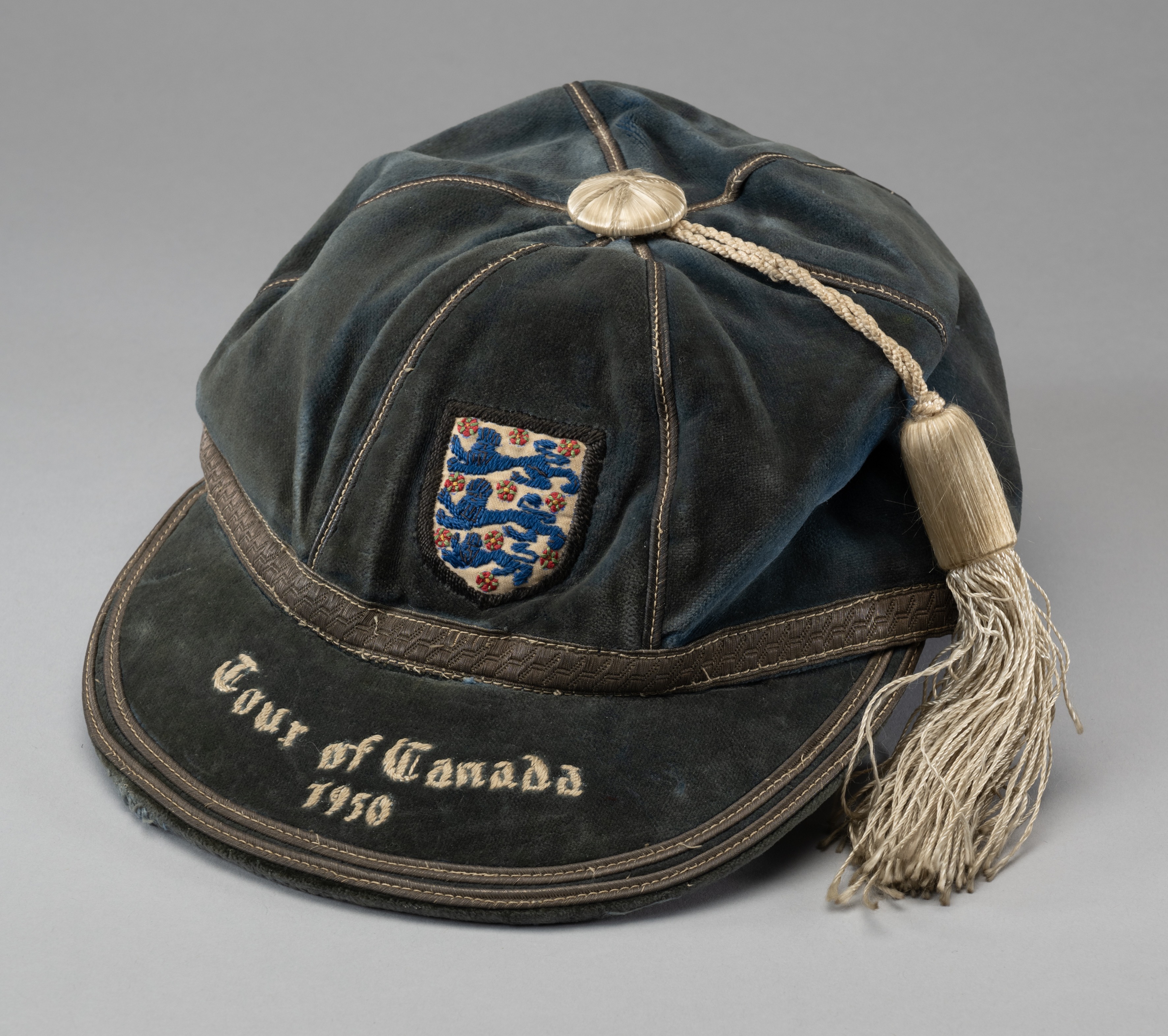 Stanley Matthews' international cap for the Football Association Tour of Canada in 1950, the blue cap inscribed TOUR OF CANADA, 1950, colour somewhat