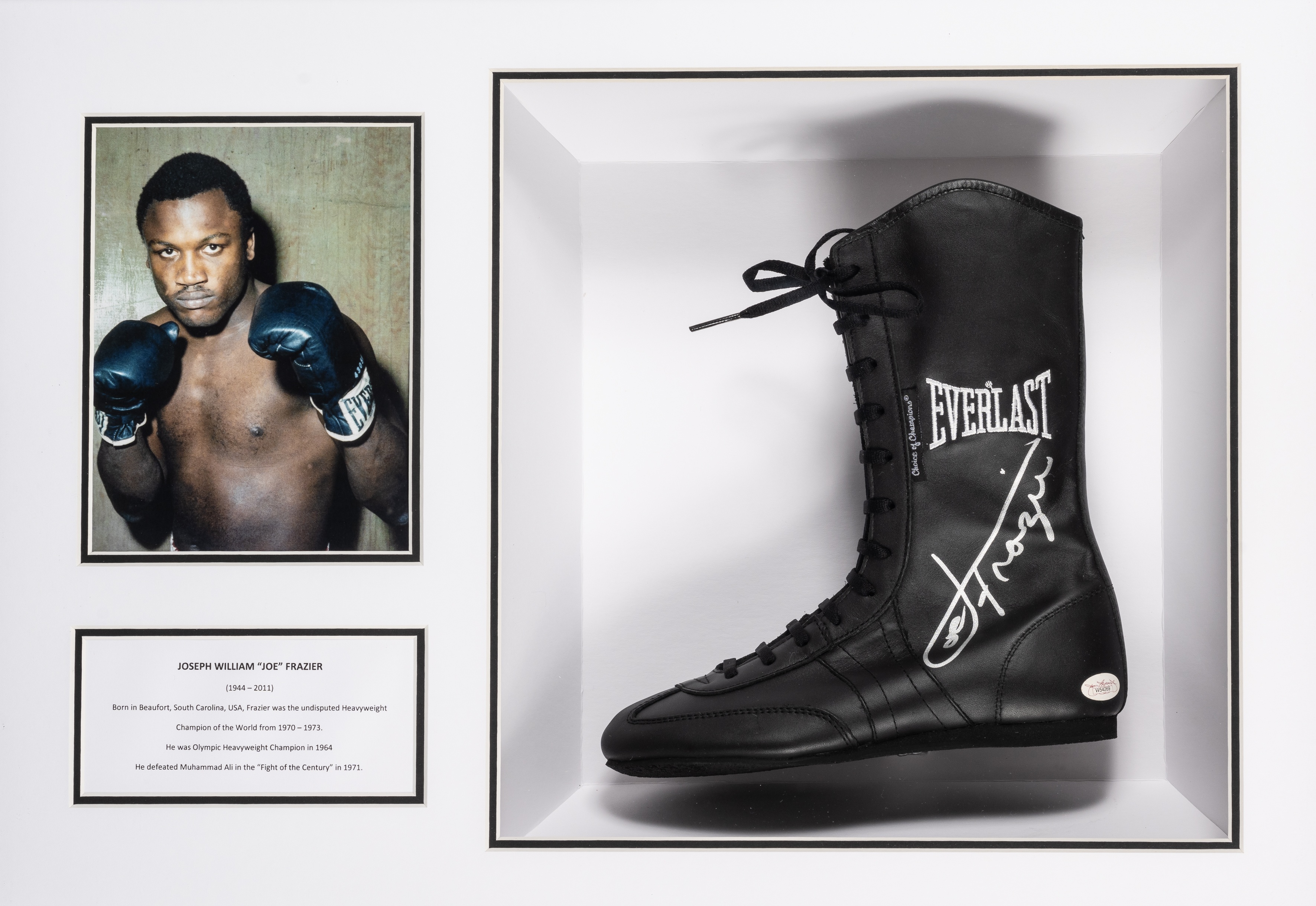 Joseph William 'Joe' Frazier signed left boot mounted in a display case, the Everlast 'Choice of champions' black leather right boot signed with silver marker pen, flanked by 19 by 14cm. colour photograph of Frazier, above typed legend, mounted in a box glazed frame, overall 51.5 by 69 by 16cm., reverse bearing Rare Memorabilia COA All glass will be removed from framed and glazed items prior to posting and may result in delays to shipping your items. (This service is included in the cost of postage and packing). We can also totally remove all framing and mounts upon request to reduce shipping costs. Alternatively, lots can be collected in person by prior appointment from NN8 1RT.